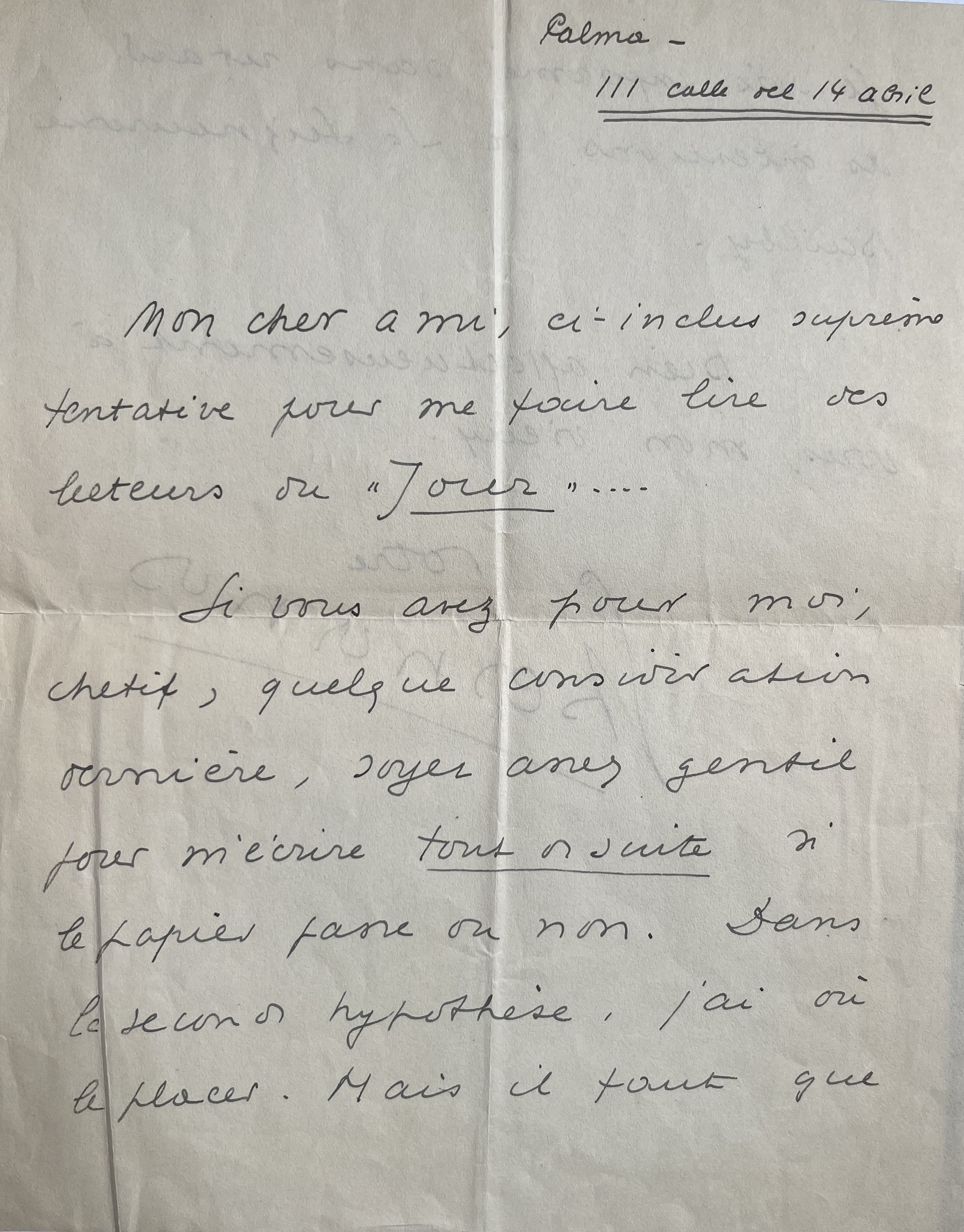 "Mon cher ami, ci-inclus suprême tentative pour me faire lire des lecteurs du "Jour".... Si vous avez pour moi, chétif, quelques considérations dernières, soyez assez gentil pour m'écrire tout de suite si le papier passe ou non. Dans la seconde hypothèse, j'ai où le placer. Mais il faut que je sois informé sans retard des intentions de sa seigneurie Bailby [...]".