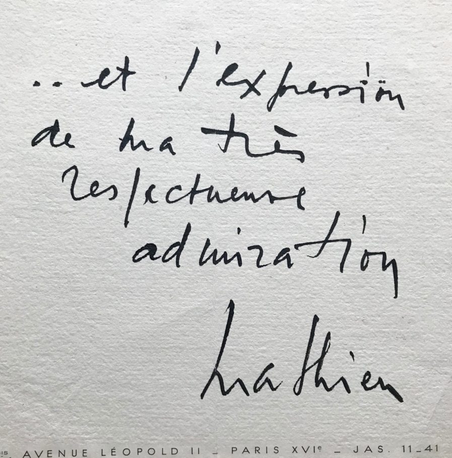- pièce autographe signée de Mathieu à Malraux, devant très propablement accompagner un envoi : sur son beau papier à en-tête, avec sa devise "Moulte de Parte", Mathieu écrit ces quelques mots d'une encre de Chine très noire : ".. et l'expression de ma très respectueuse admiration. Mathieu".