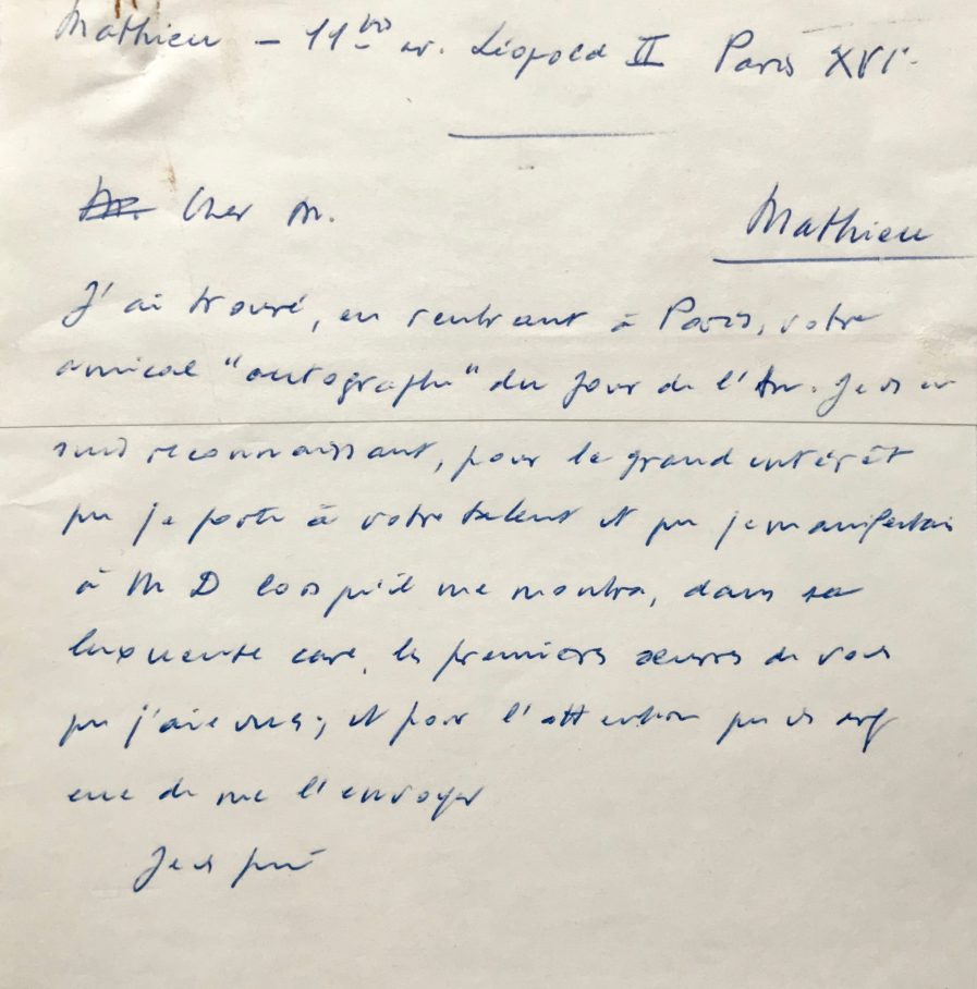- brouillon autographe de Malraux, en réponse à Mathieu : "Cher M. J'ai trouvé, en rentrant à Paris, votre amical "autographe" du jour de l'An. Je vs en suis reconnaissant, pour le grand intérêt que je porte à votre talent et que je manifestais à M D lorsqu'il me montra, dans sa luxueuse cave (?), les premières oeuvres de vous que j'aie vues ; et pour l'attention que vs avez eue de me l'envoyer. Je vs prie...".