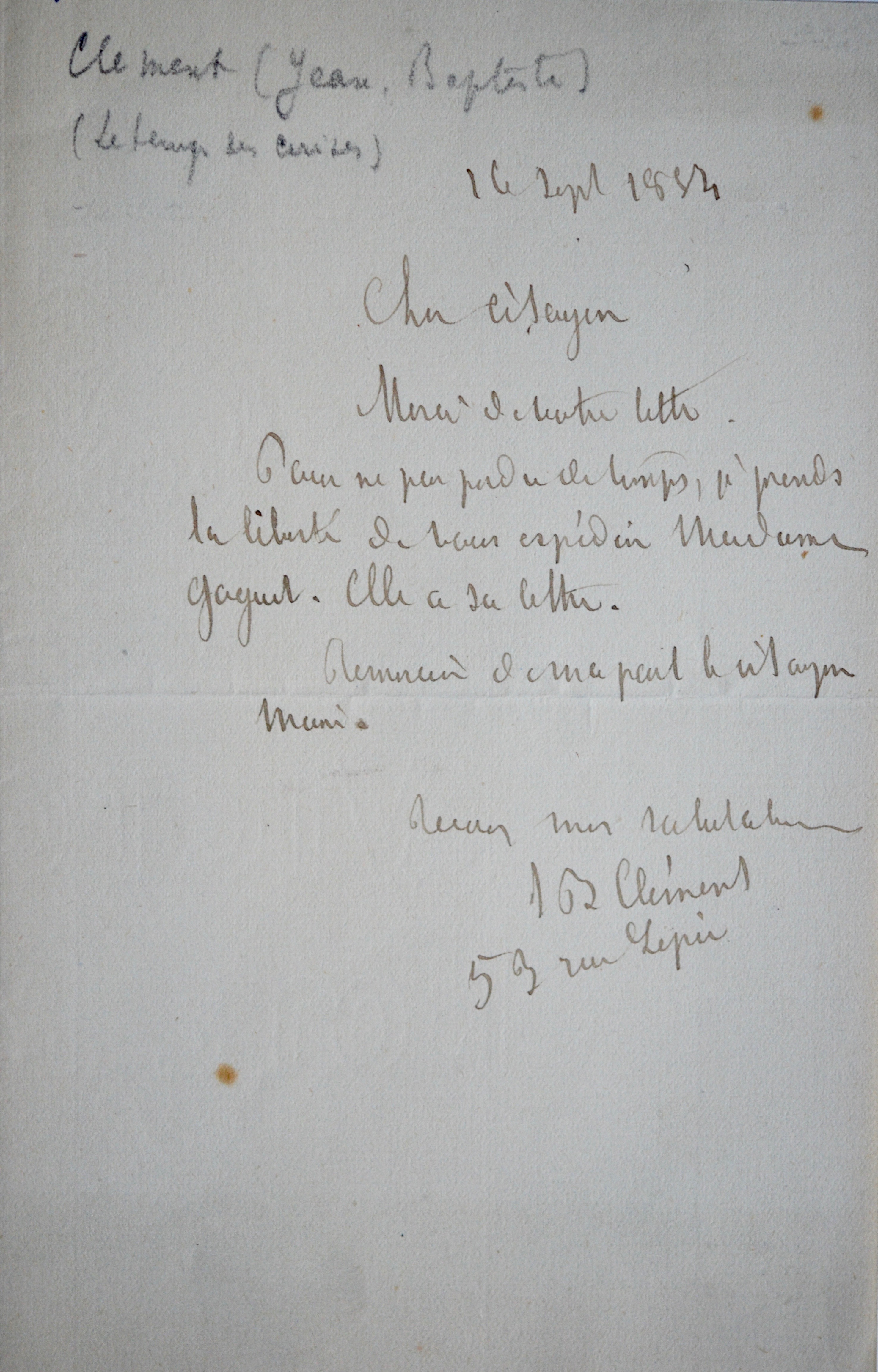 Rare lettre autographe signée de Jean-Baptiste Clément :