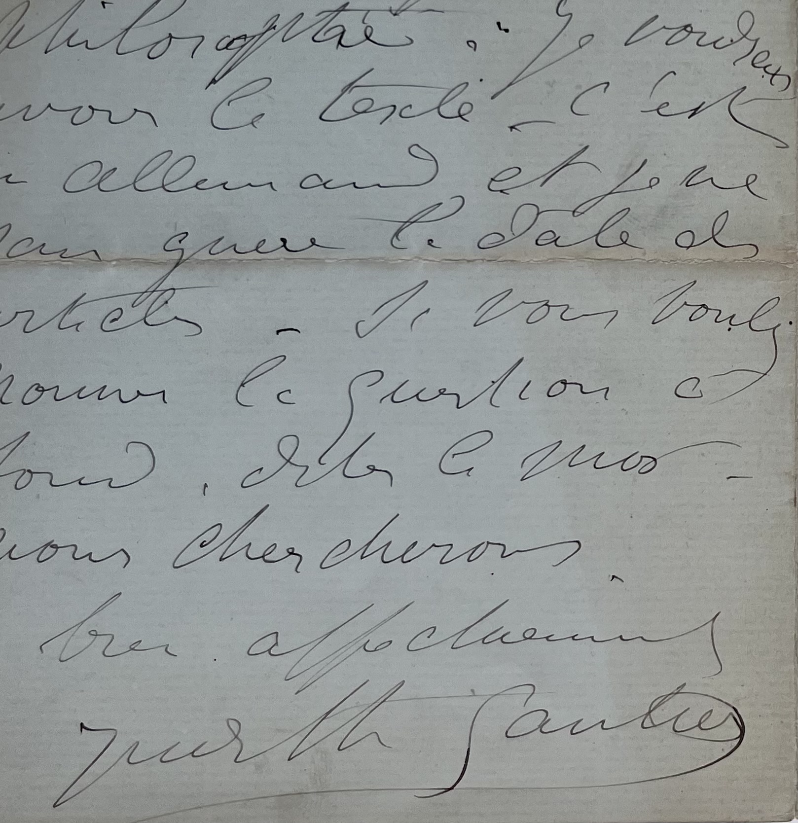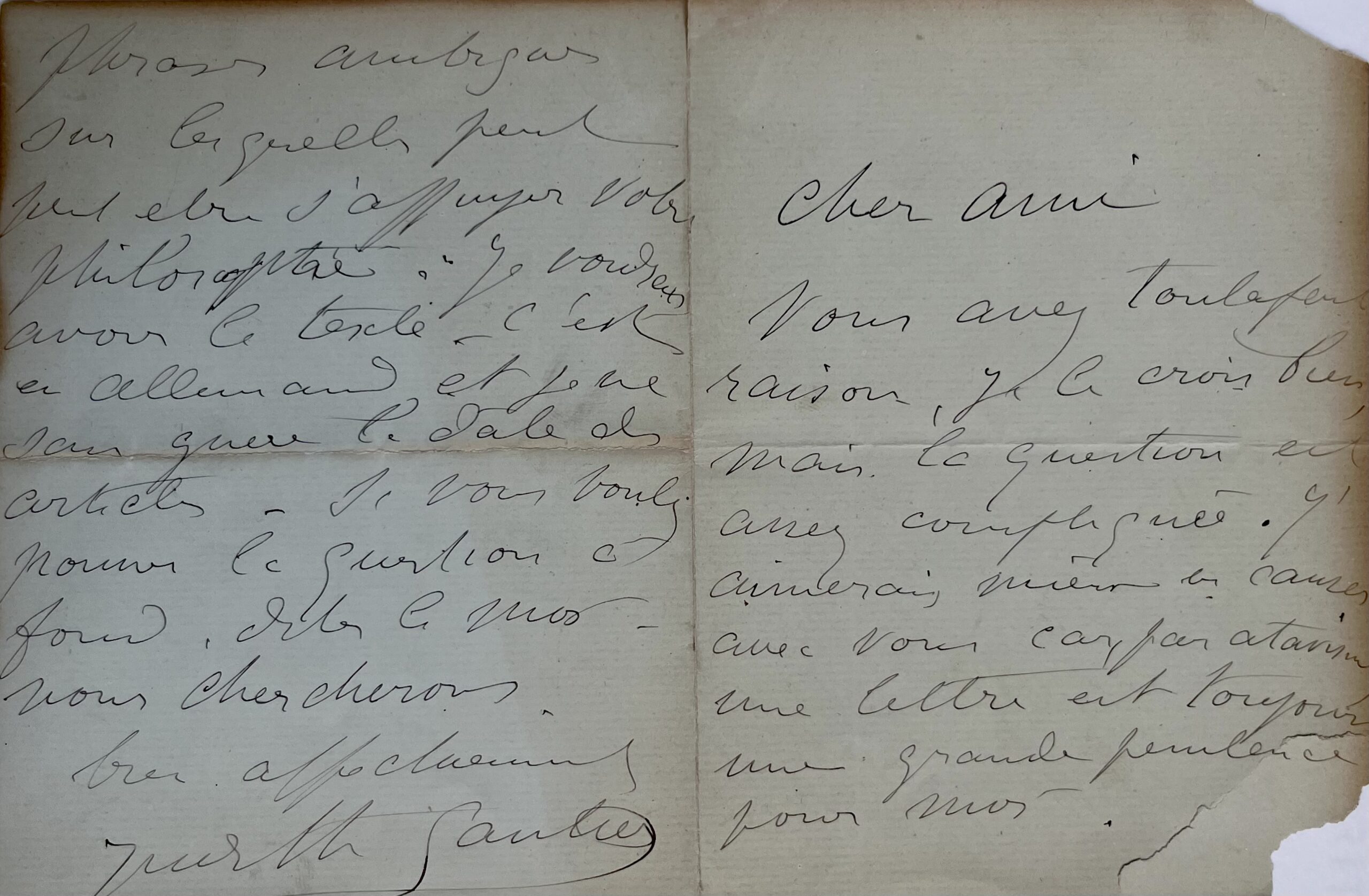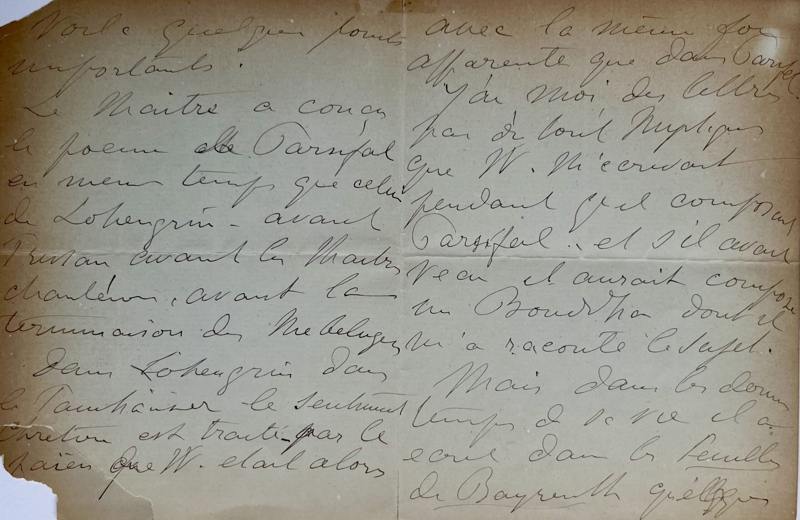 "Cher ami. Vous avez tout à fait raison, je le crois bien, mais la question est assez compliquée. J’aimerais mieux en causer avec vous car par atavisme une lettre est toujours une grande pénitence pour moi. Voilà quelques points importants. Le Maitre a conçu le poème de Parsifal en même tant que celui de Lohengrin - avant Tristan, avant les Maîtres Chanteurs, avant la terminaison des Nibelungen. Dans Lohengrin dans le Tannhäuser, le sentiment chrétien est traité par le païen que W. était alors avec la même foi apparente que dans Parsifal. J’ai moi, des lettres pas du tout mystiques que W. m’écrivait pendant qu’il composait Parsifal, et s’il avait vécu, il aurait composé un Bouddha dont il m’a raconté le sujet. Mais dans les derniers temps de sa vie, il a écrit dans les Feuilles de Bayreuth quelques phrases ambiguës sur lesquelles peut peut-être s’appuyer votre philosophie. Je voudrais avoir le texte. C’est en allemand et je ne sais guère la date des articles. Si vous voulez poursuivre la question à fond, dites-le-moi, nous chercherons".