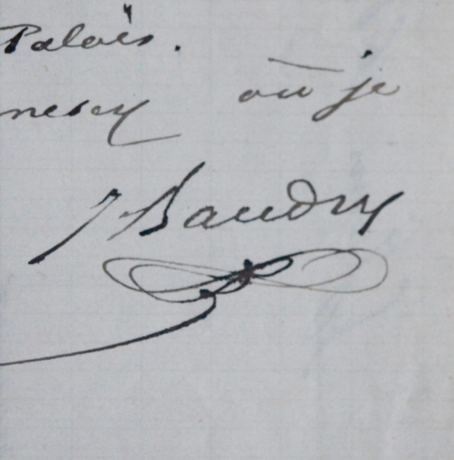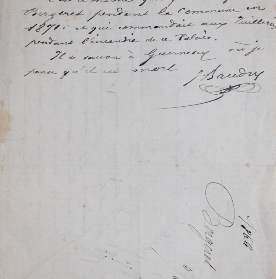 Au verso, note autographe signée de Baudry : "M. Bergeret [...] a été employé chez moi comme voyageur et courtier en 1868. C'est le même qui fut le Général Bergeret pendant la Commune en 1871, et qui commandait aux Tuilleries [sic] pendant l'incendie de ce Palais. Il se sauva à Guernesey où je pense qu'il est mort [...]".