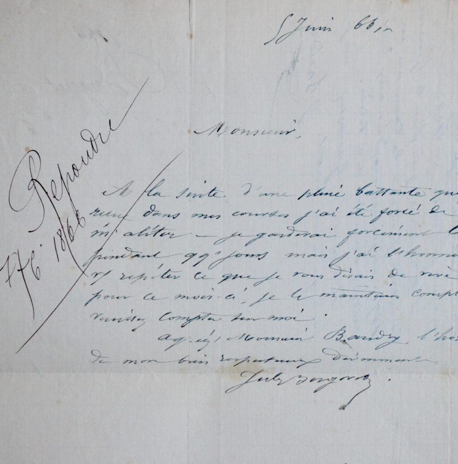 "À la suite d'une pluie battante que j'ai reçue dans mes courses j'ai été forcé de m'aliter. Je garderai forcément le lit pendant qq jours mais j'ai l'honneur de vs répéter ce que je vous disais de vive voix pour ce mois-ci. Je le maintiens complètement. Veuillez compter sur moi [...] ".