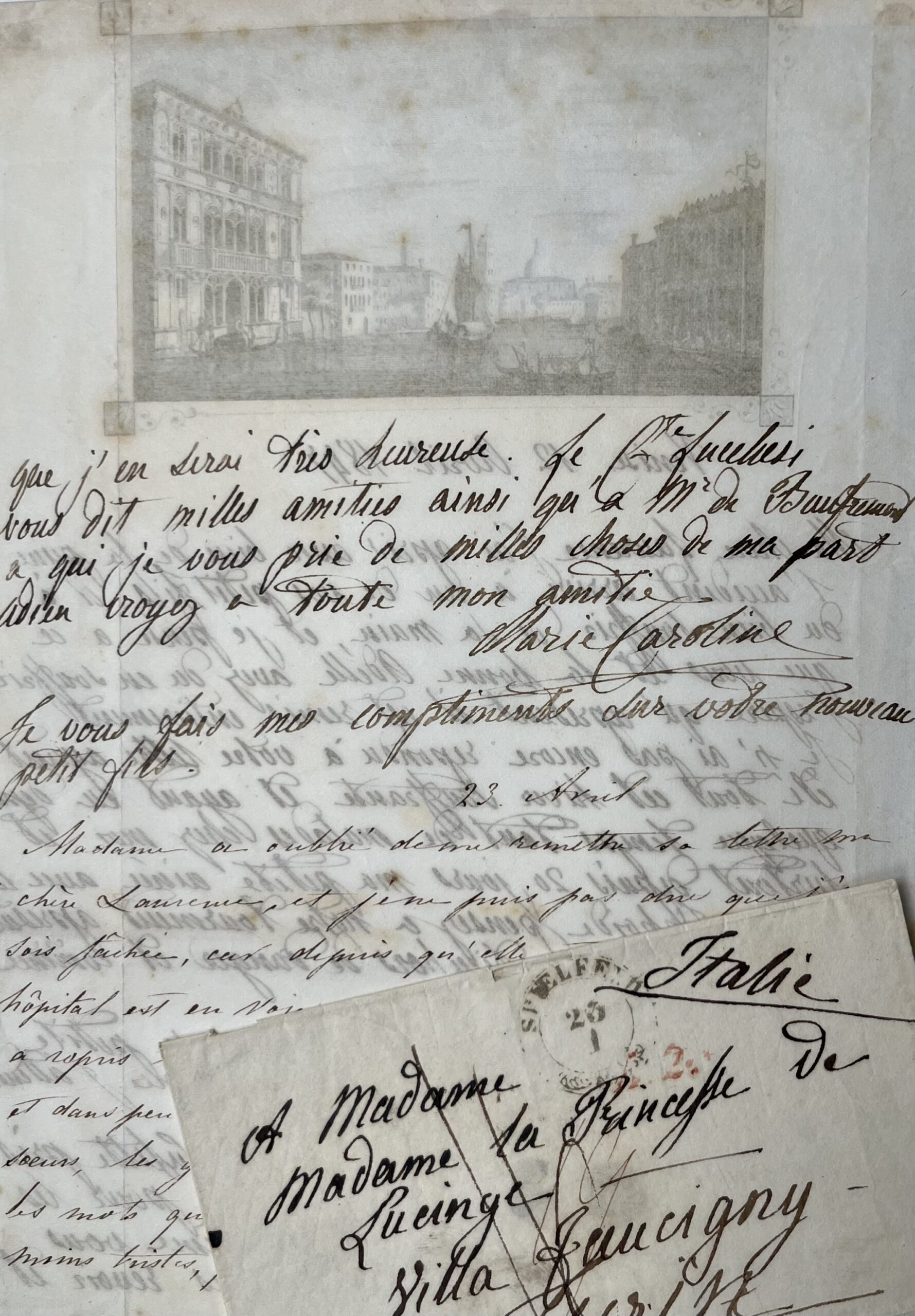 Marie Caroline, duchesse de Berry (Palerme, 1798/1870)Lettre écrite de Venise. Elle est illustrée d'une superbe vignette gravée figurant la vue du palais Vandramin, résidence de la duchesse de Berry à Venise, depuis le Grand Canal.