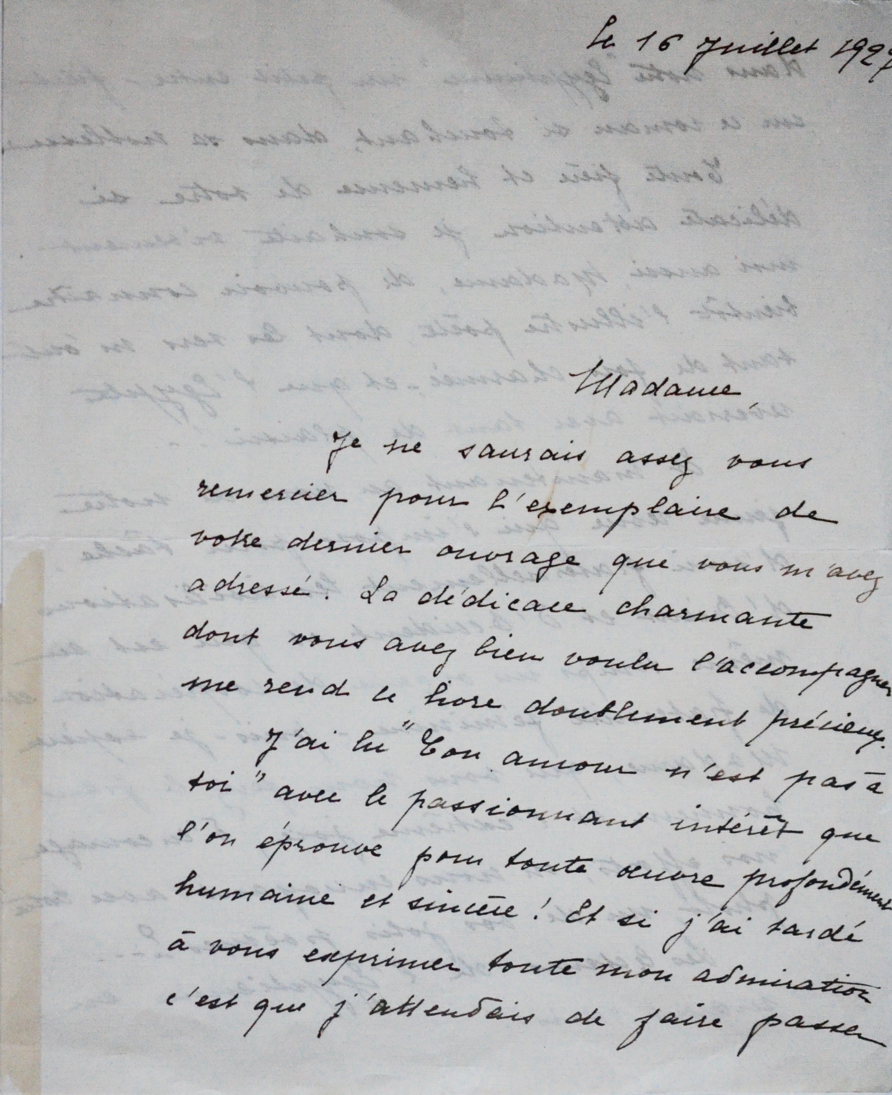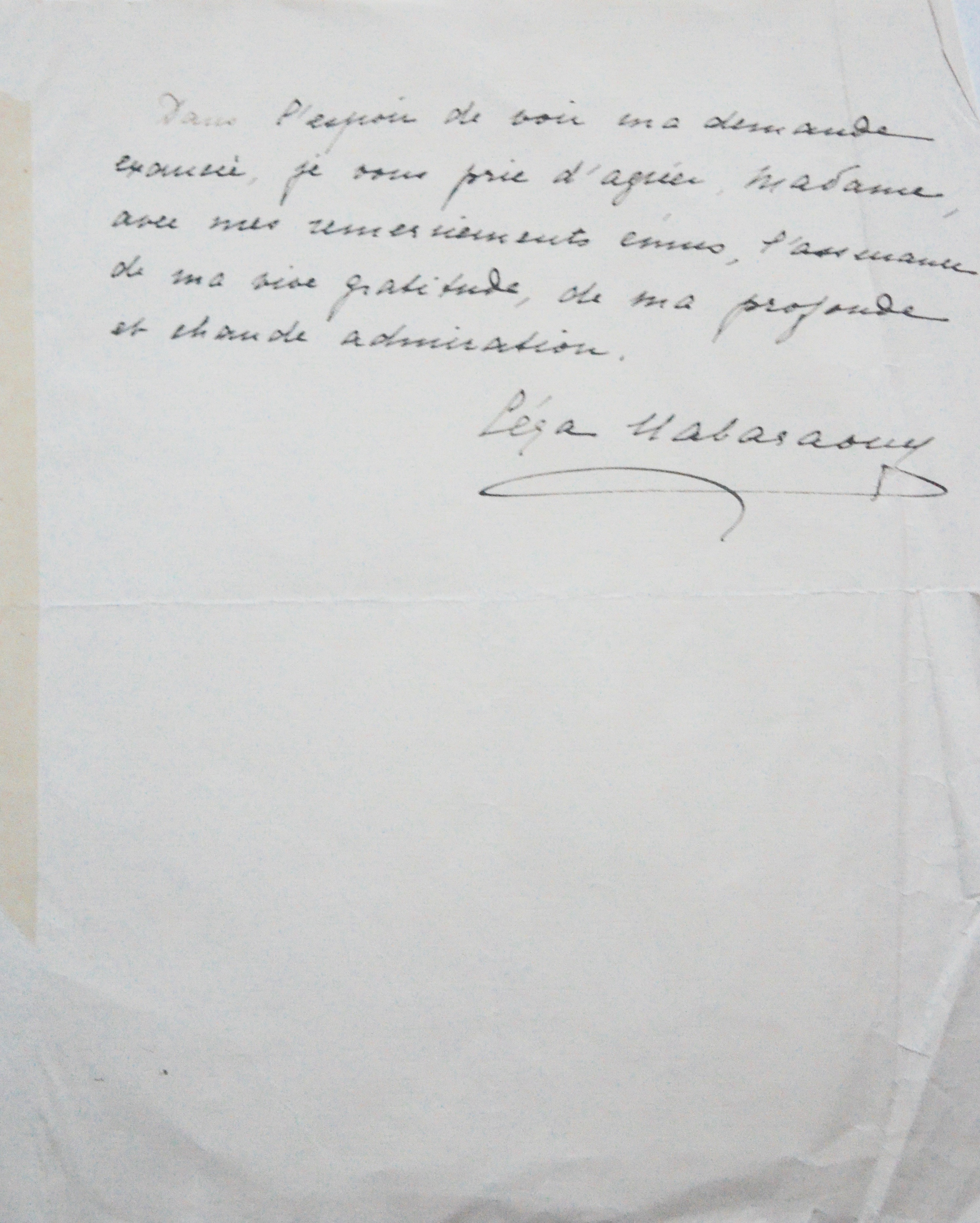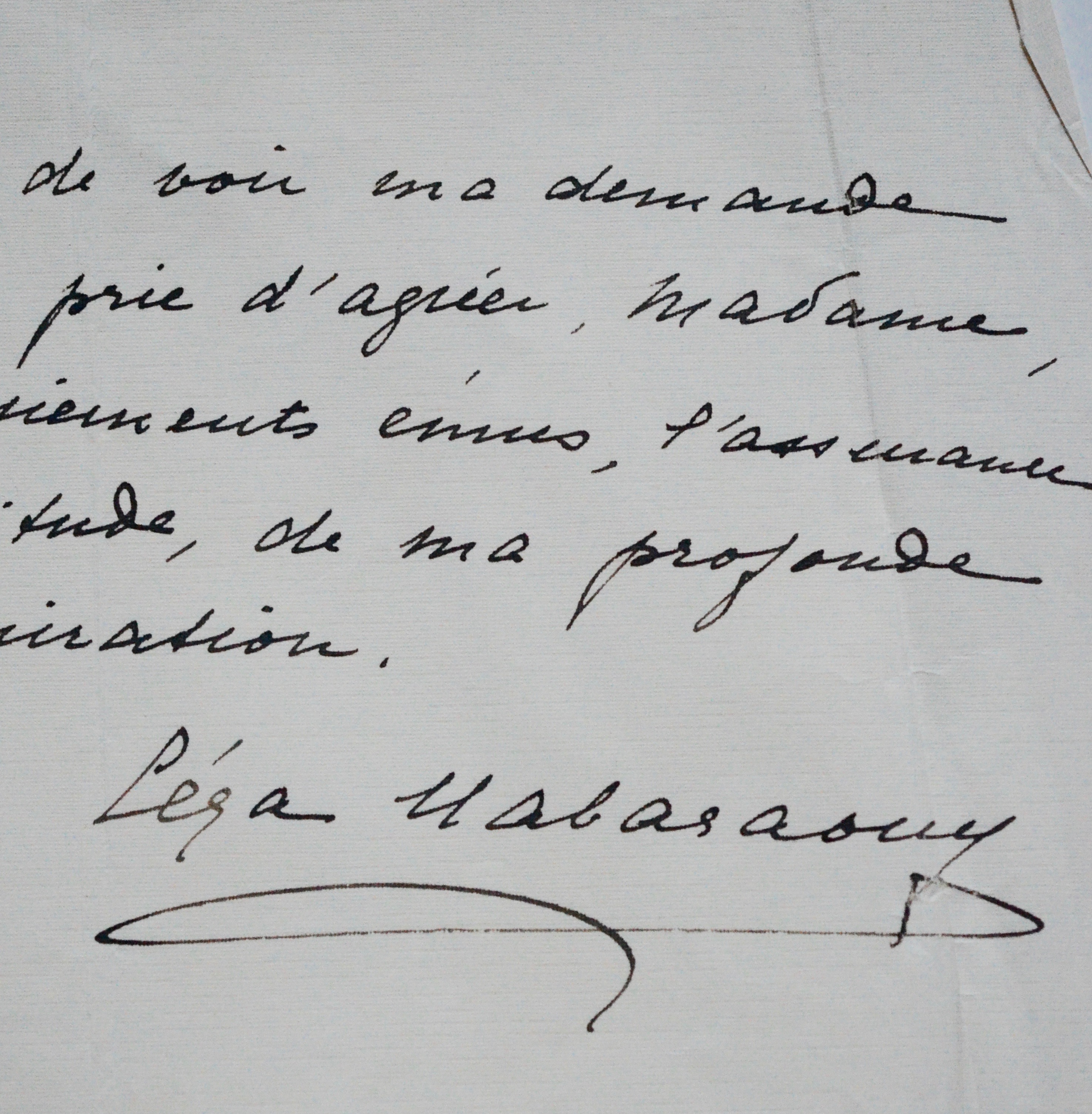 Ceza Nabaroui (Le Caire, 1897/1985)Céza Nabaraoui remercie chaudement la poétesse Jane Catulle-Mendès, pour l'envoi de son livre Ton Amour n'est pas à toi (Albin Michel, 1927), ainsi que pour le bel envoi à l'intérieur. Elle l'a lu "avec le passionnant intérêt que l'on éprouve pour toute oeuvre profondément humaine et sincère [...]". Elle a rédigé un entre-filet dans sa revue L'Egyptienne "sur ce roman si touchant, dans sa noblesse" et a hâte "de pouvoir connaître bientôt l'illustre poète, dont les vers m'ont tant de fois charmée - et que l'Egypte reverrait avec tant de plaisir !".