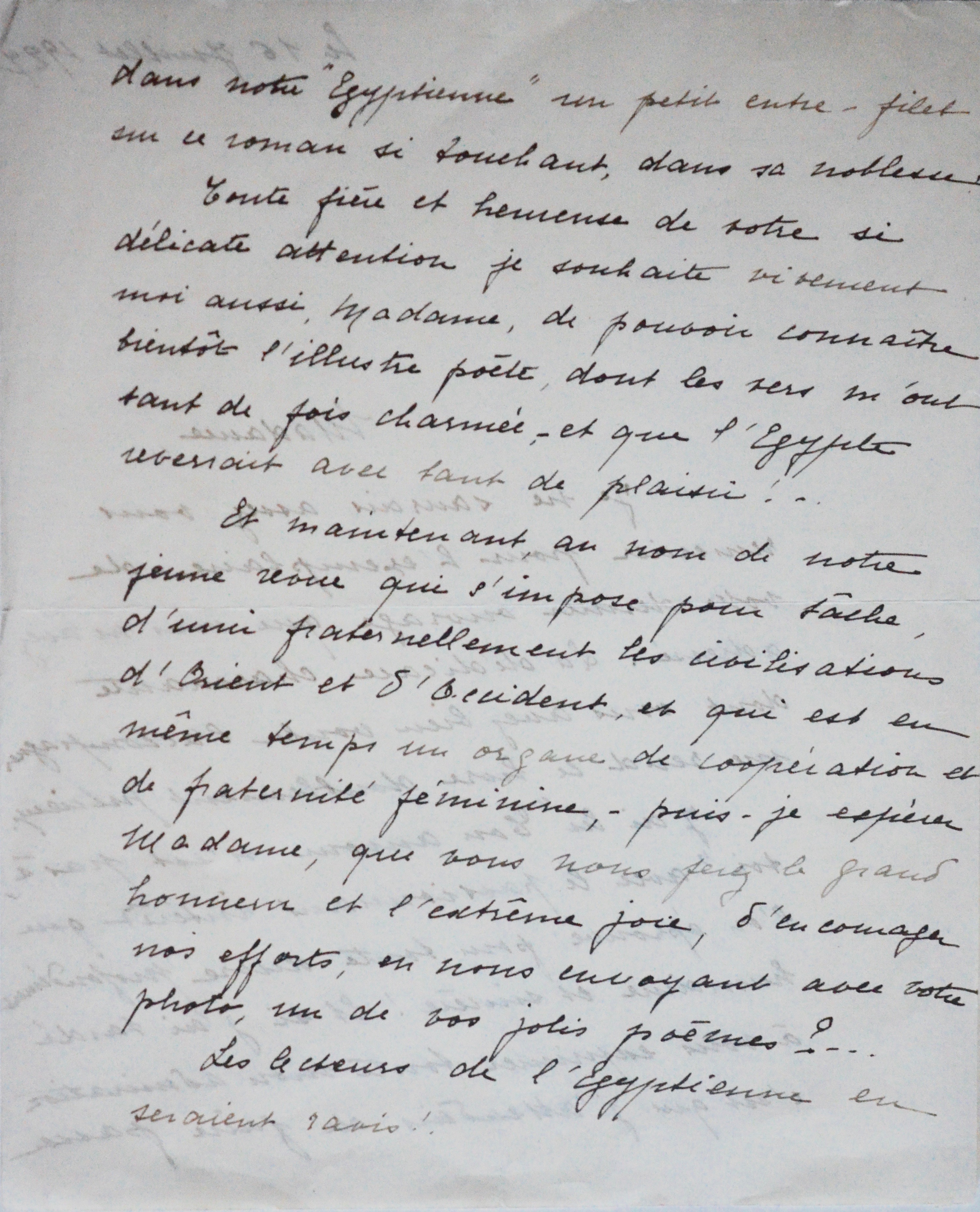 Elle réclame un poème et une photo de Jane Catulle-Mendès "au nom de notre jeune revue qui s'impose pour tâche, d'unir fraternellement les civilisations d'Orient et d'Occident, et qui est en même temps un organe de coopération et de fraternité féminine [...]. Les lecteurs de l'Egyptienne en seraient ravis ! [...]".
