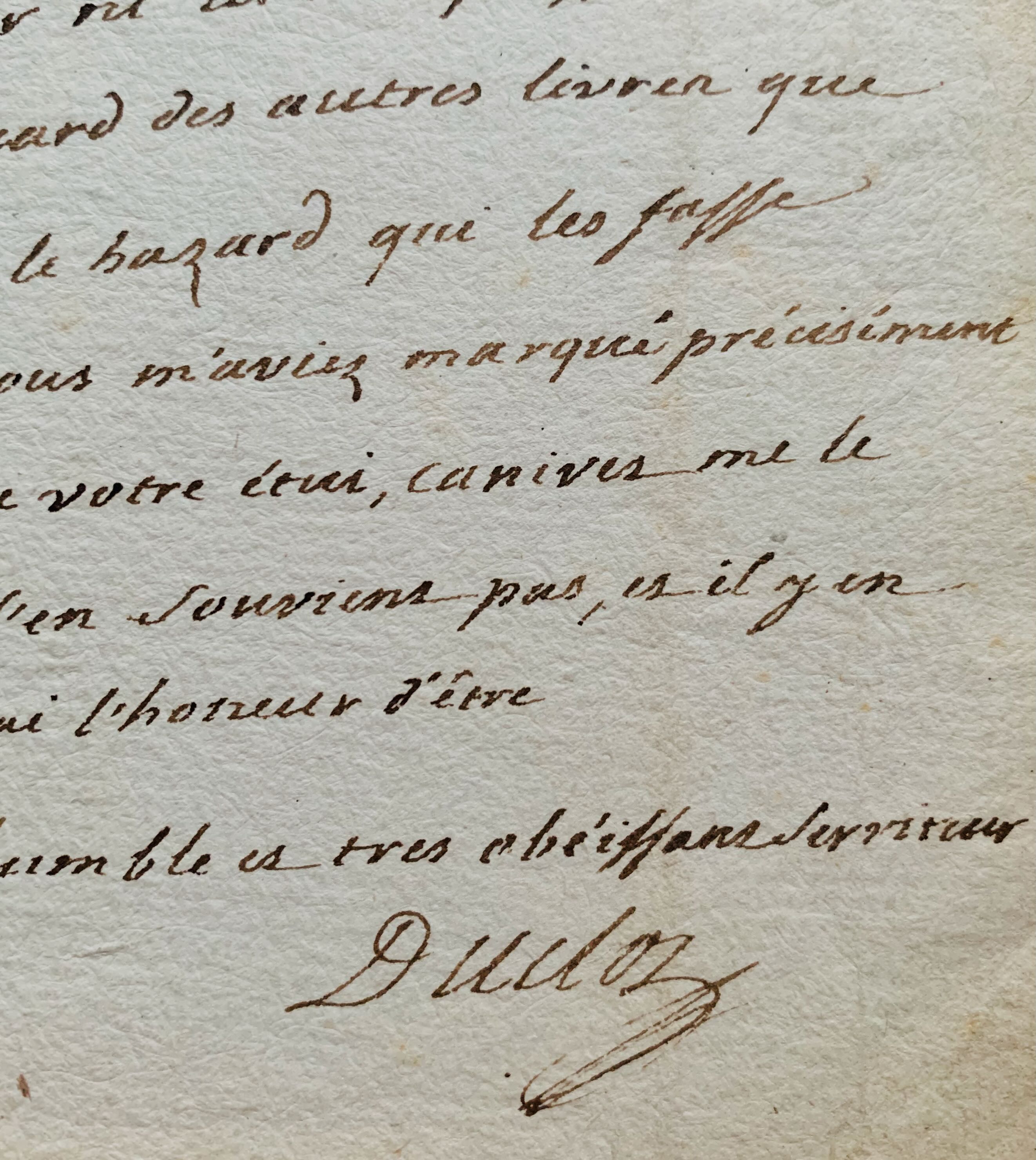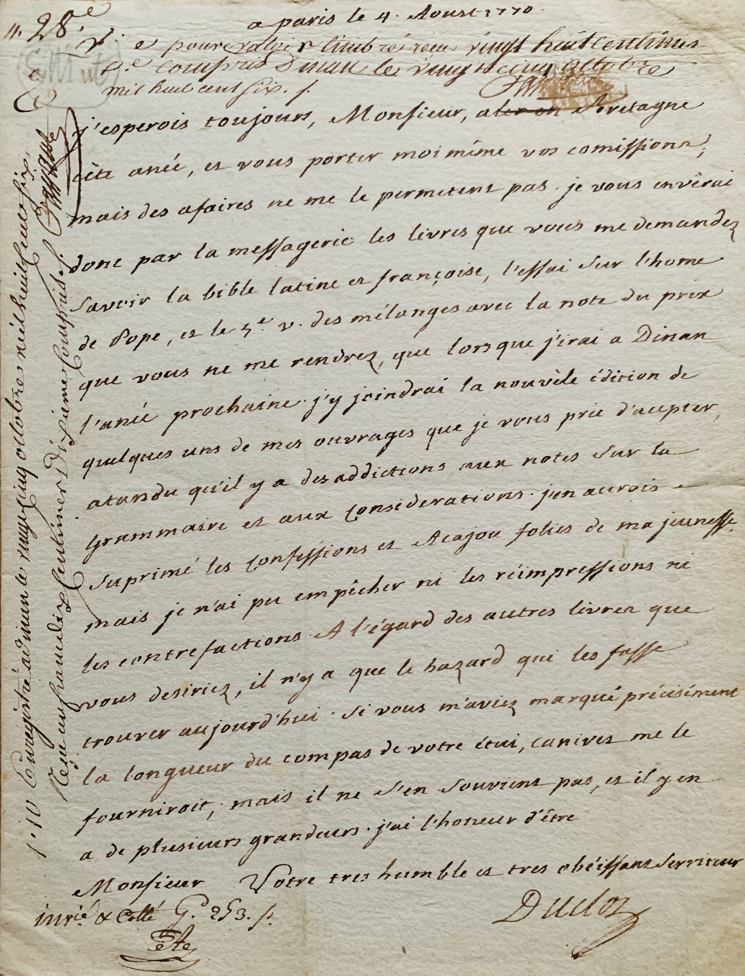 Charles Pinot Duclos espérait revenir en Bretagne cette année, et porter les commissions de son correspondant, mais ses affaires l'en empêchent. "Je vous enverrai donc par la messagerie les livres que vous me demandez, savoir la bible latine et françoise, l'essai sur l'homme de Pope, et le 3e v. des mélanges", plus une nouvelle édition de ses oeuvres qu'il lui donnera quand il ira à Dinan. "J'en aurois suprimé les Confessions et Acajou folies de ma jeunesse, mais je n'ai pu empêcher ni les réimpressions ni les contrefactions. A l'égard des autres livres que vous désirez, il n'y a que le hazard qui les fasse trouver aujourd'hui [...]".