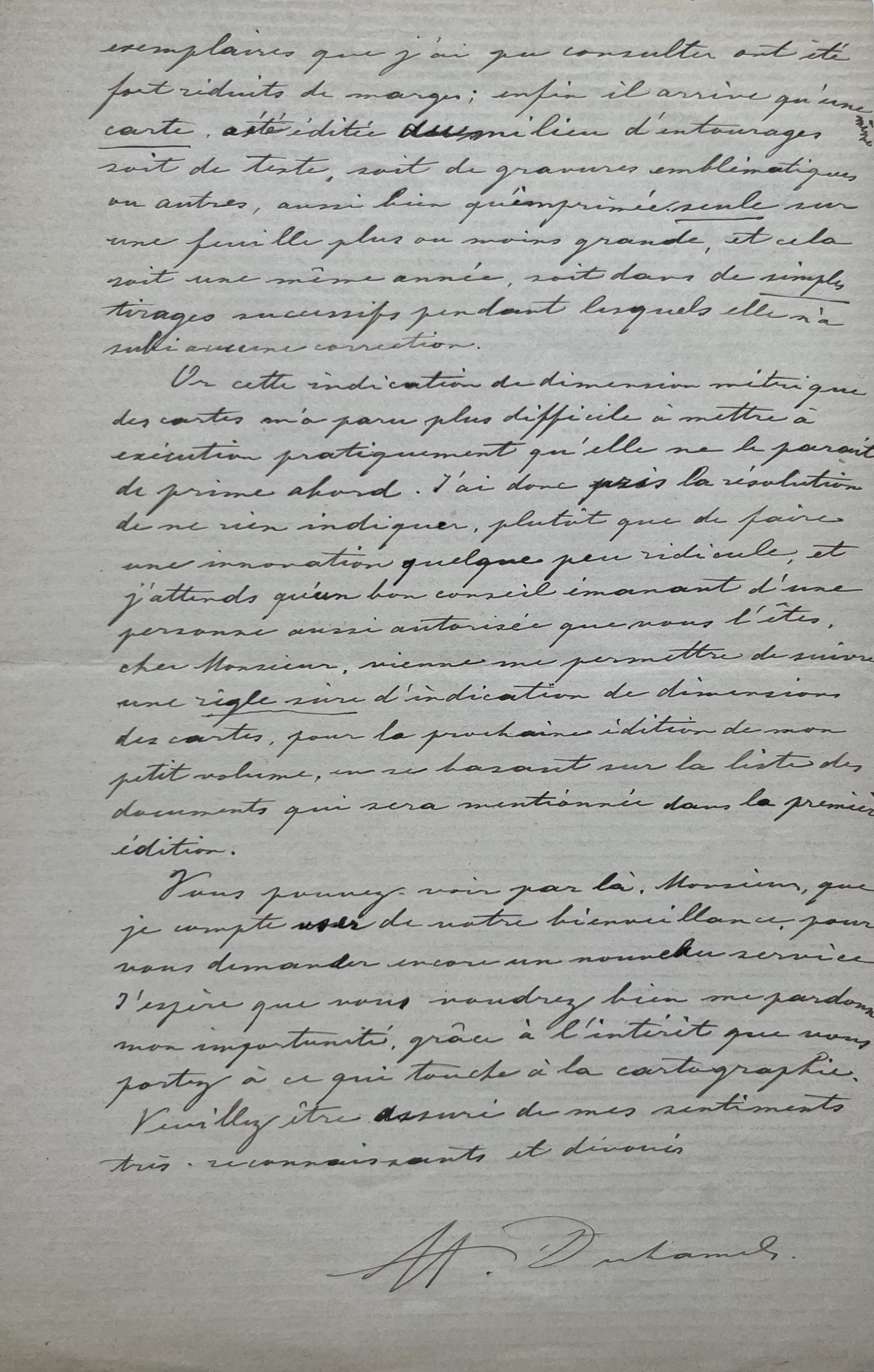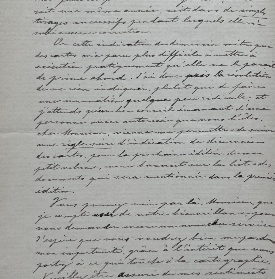« Merci bien cordialement pour les précieuses additions que vous avez pris la peine de faire sur mes épreuves. Votre observation au sujet du manque d'indication de la dimension de chaque carte est très juste ; mais je dois vous avouer avoir ajourné à la prochaine édition de mon travail (laquelle ne tardera guère à se produire, puisque pour un tirage de 1.000 exemplaires, j'ai déjà plus de 700 souscriptions), l'indication en question qui devrait, je crois, s'indiquer par le format de la feuille (raisin, colombien, etc.), mais qu'il faudra réduire en simples mesures métriques basées sur les dimensions du cadre gravé de la carte même. Car souvent, la même carte a été gravée sur des papiers de divers formats […]. J'ai donc pris la résolution de ne rien indiquer plutôt que de faire une innovation quelque peu ridicule […] ».