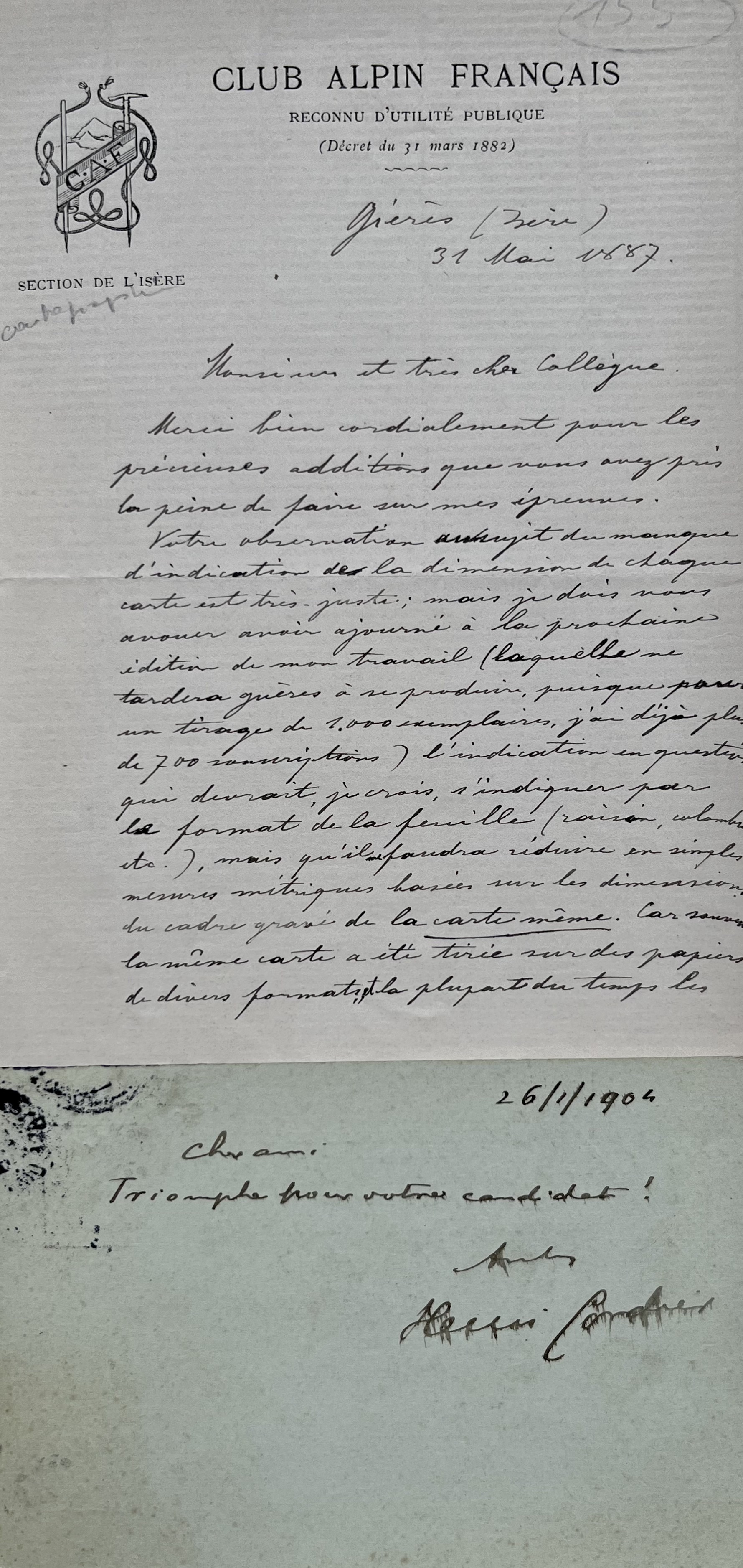 Henry Duhamel (Paris, 1853/1917)Belle lettre d'Henry Duhamel, alpiniste et pionnier du ski, au géographe Gabriel Marcel, sur la publication de son Guide du Haut-Dauphiné (1887). Enveloppe conservée.