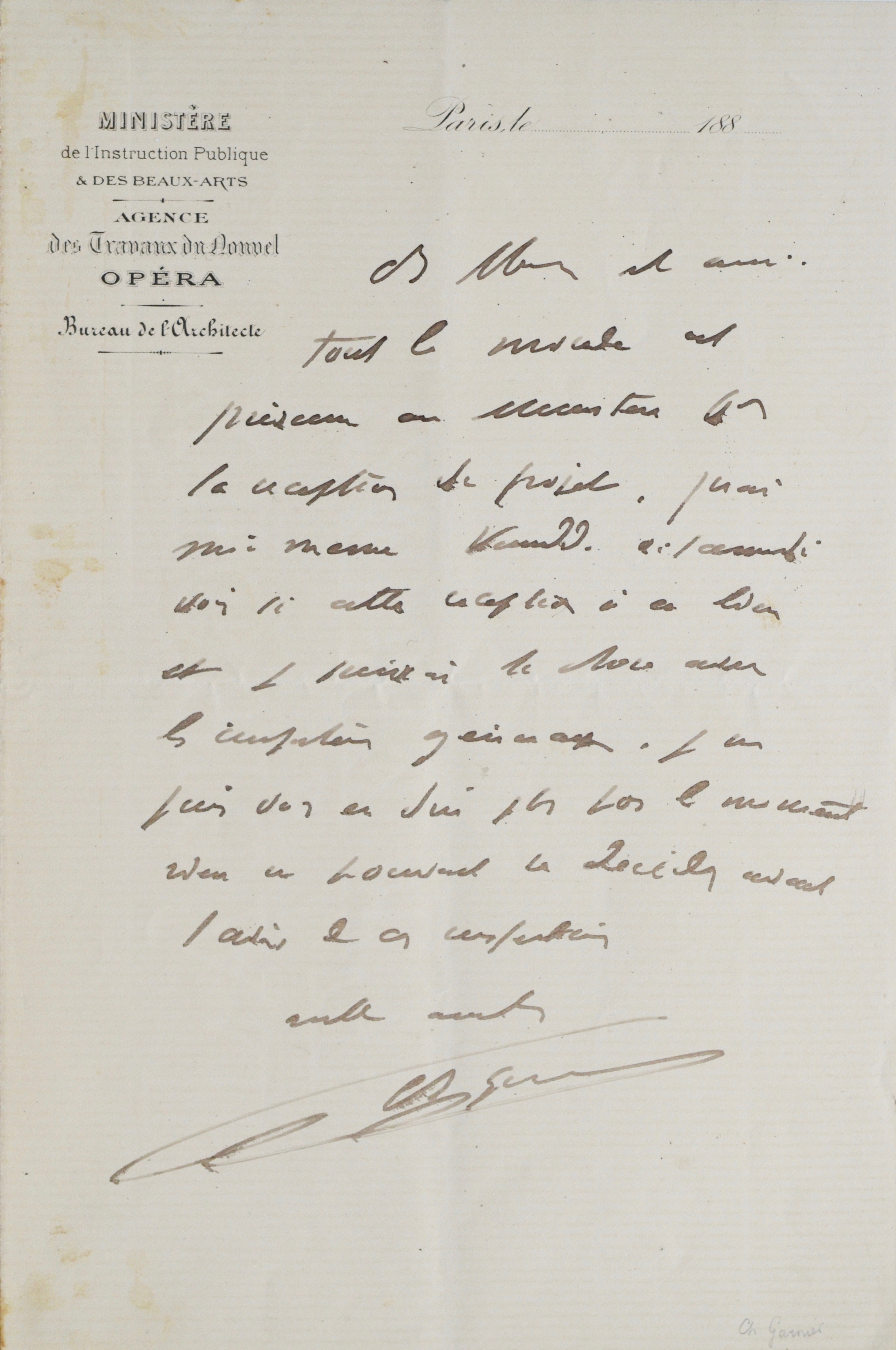 Encre brune sur papier vergé filigrané "Lacroix Frères", avec en-tête imprimé "Ministère de l'Instruction Publique & des Beaux-Arts - Agence des travaux du Nouvel Opéra".