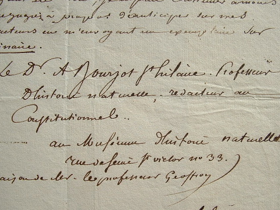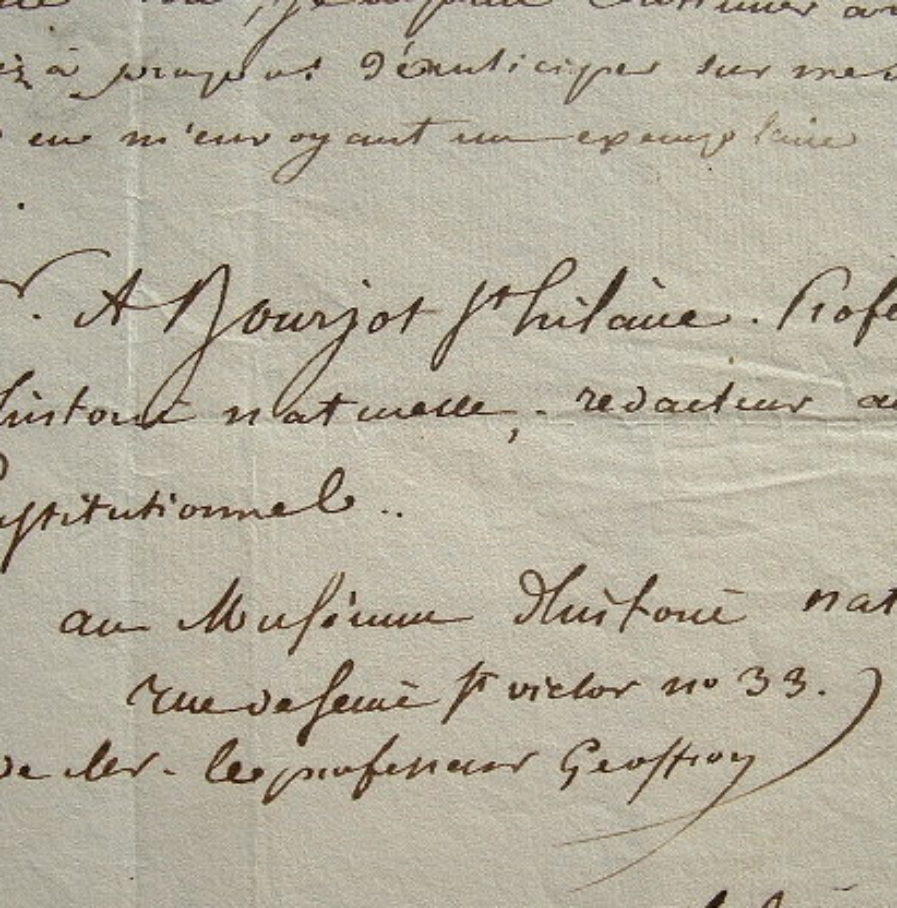 «Rédacteur au Constitutionnel pour la partie de l'histoire naturelle et de la géographie, j'avais commencé un article sur votre magnifique publication de l'Inde pittoresque. L'exemplaire que l'on m'avait prêté m'ayant été retiré, je ne puis continuer à moins que vous ne jugiez à propos d'anticiper sur mes droits de rédacteur en m'envoyant un exemplaire sur papier ordinaire». Il indique son adresse «au Muséum d'histoire naturelle [...] maison de M. le professeur Geoffroy [Saint-Hilaire]».