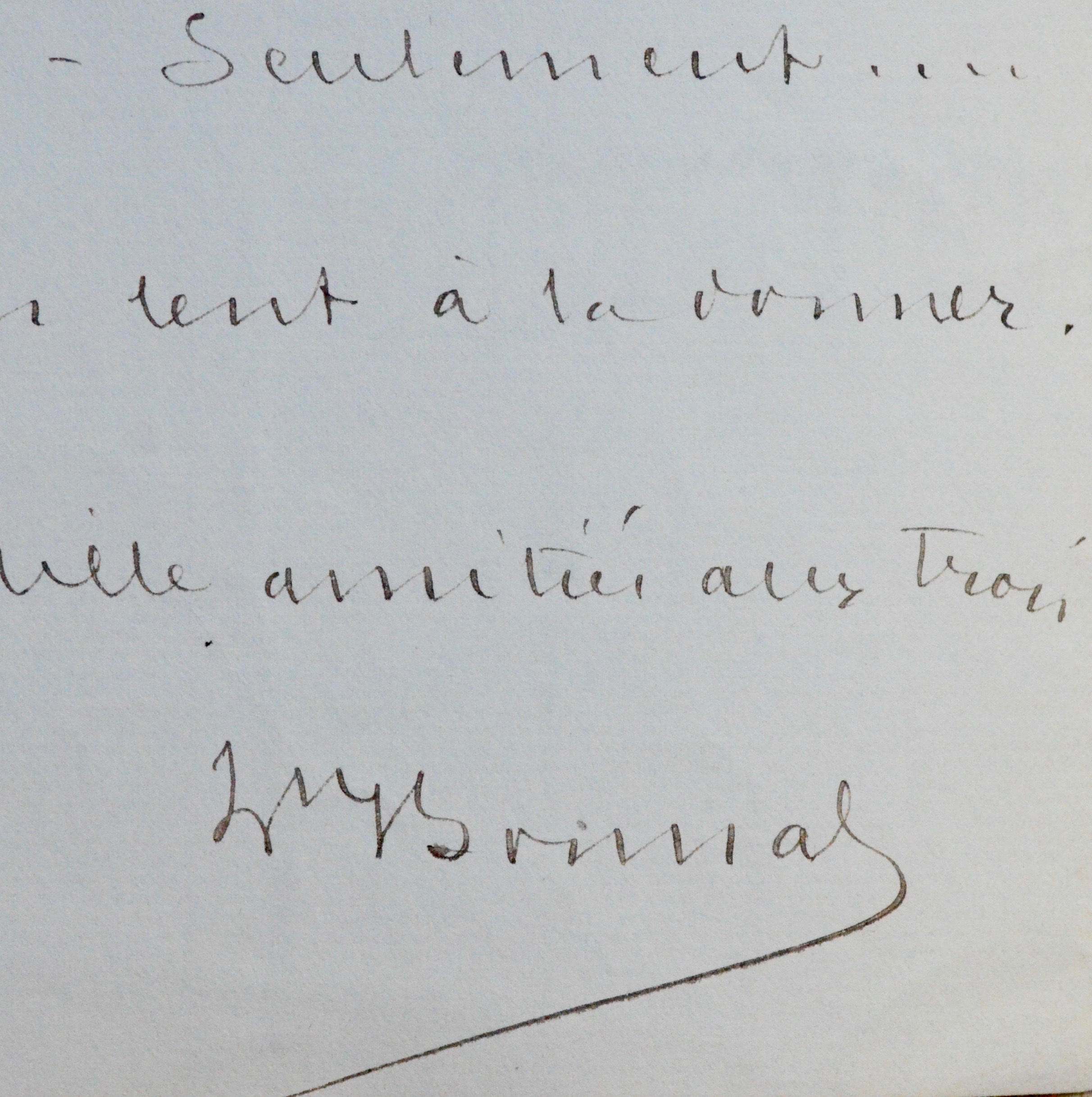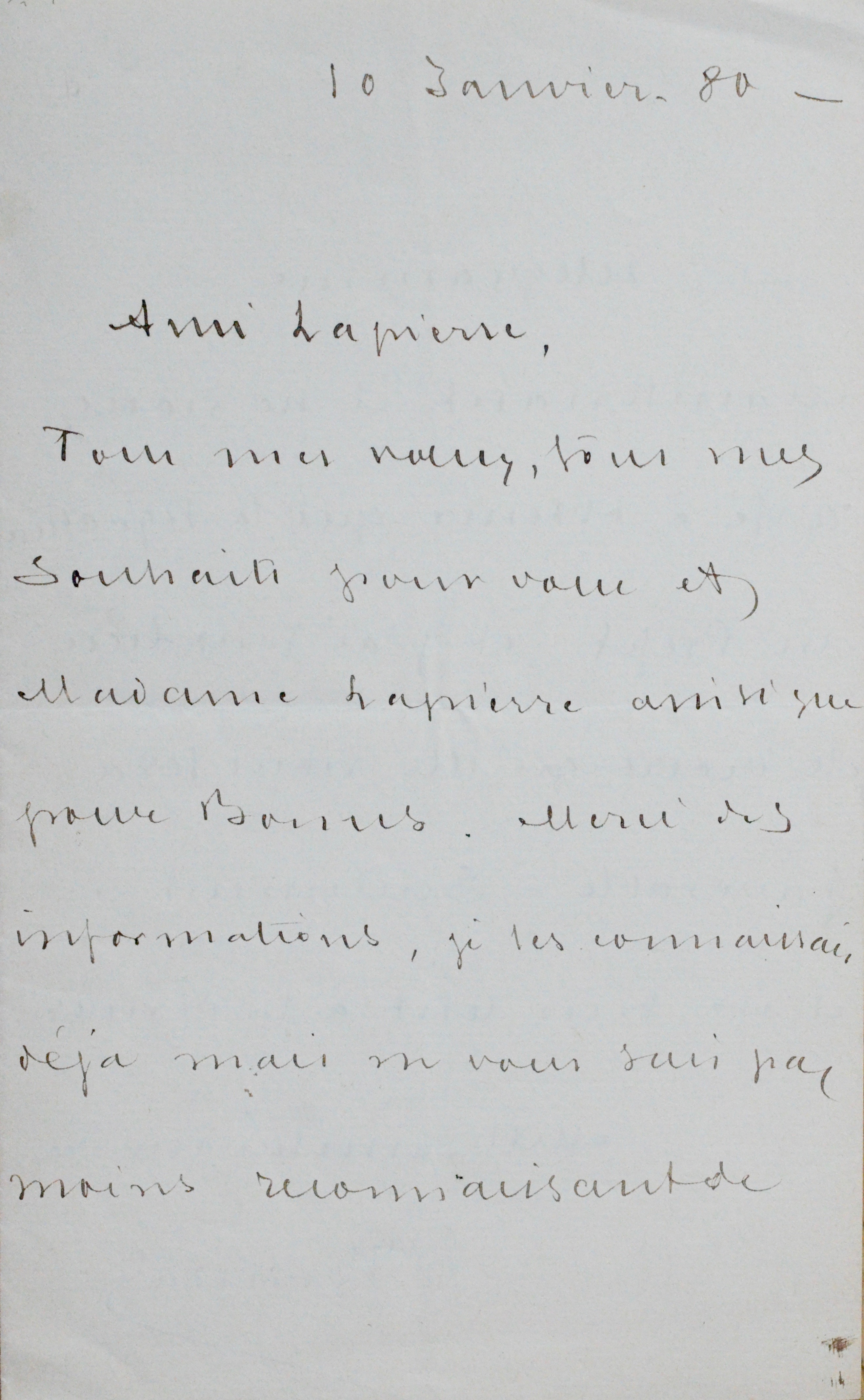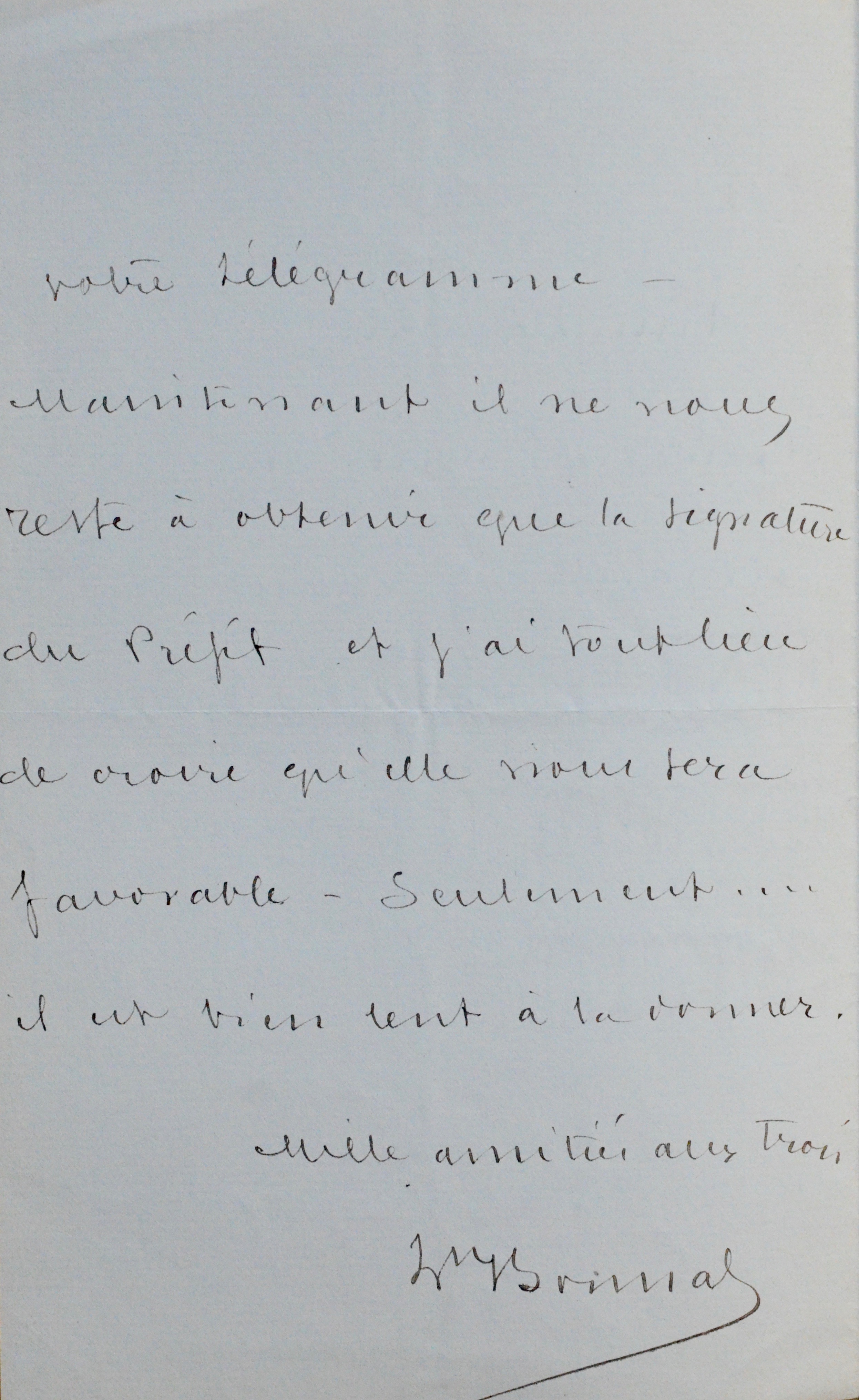 Léon Bonnat (Bayonne, 1833/1922)Bonnat remercie son ami Lapierre de ses voeux puis ajoute : "Merci des informations. Je les connaissais déjà mais ne vous suis pas moins reconnaissant de votre télégramme. Maintenant, il ne vous reste à obtenir que la signature du Préfet et j'ai tout lieu de croire qu'elle vous sera favorable. Seulement... il est bien lent à la donner [...]". Il ajoute "Mille amitiés aux trois".