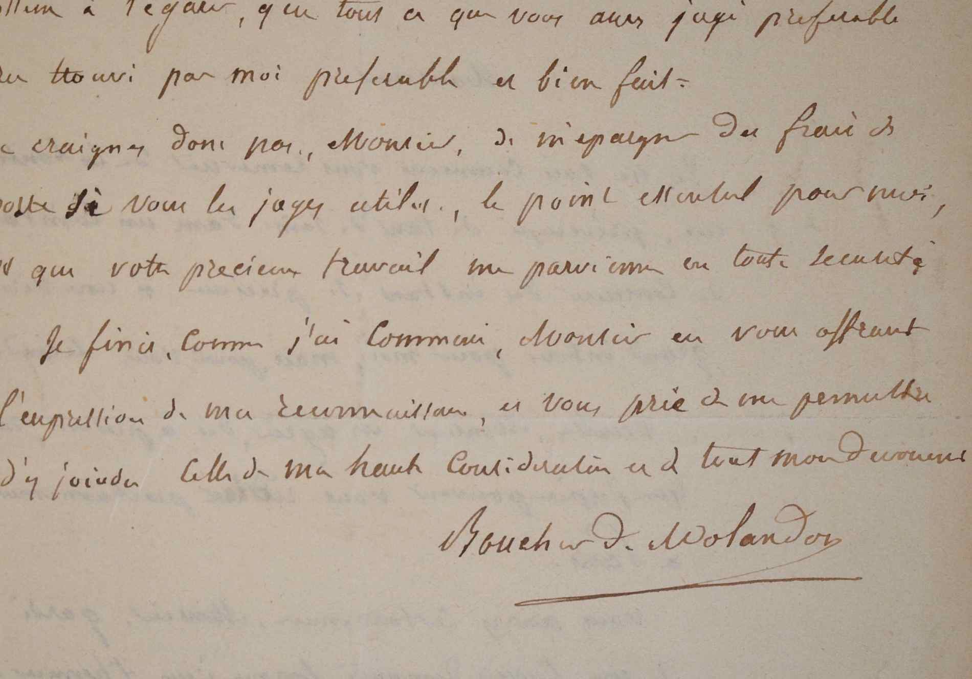 Dans cette belle lettre, l'historien Rémi Boucher de Molandon remercie chaleureusement un confrère pour son aide, «une vérification d'un grand intérêt pour moi, mais pour vous, secondaire et pénible» : «Je vous resterai toujours grandement redevable d'avoir bien voulu surveiller ce travail, et donner, aux nouvelles lectures, le sceau de l'authenticité.»
