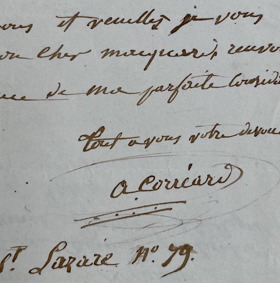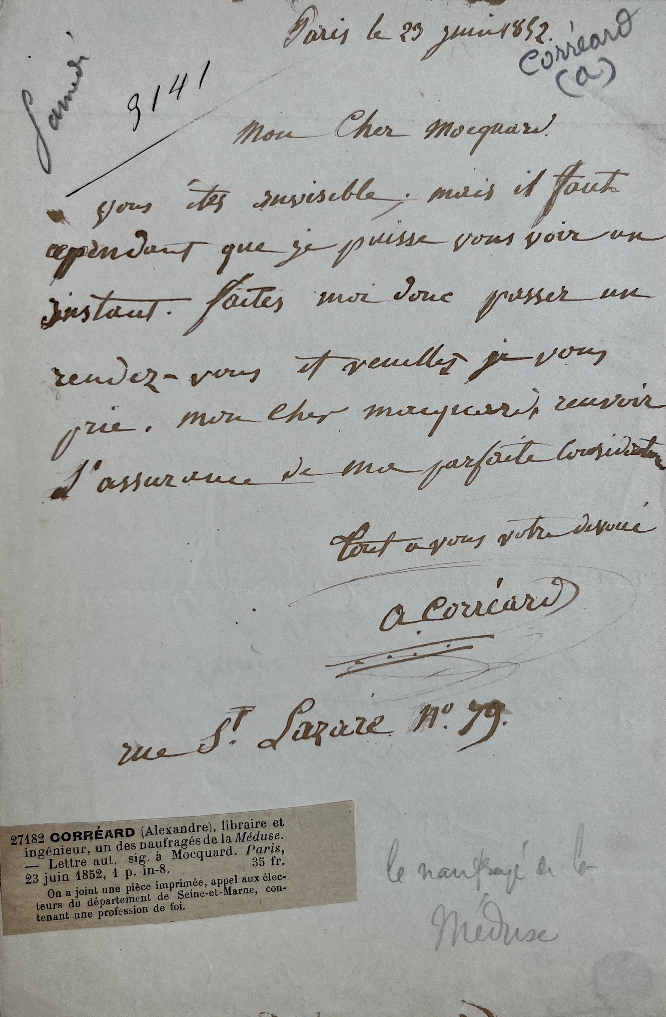 Corréard voudrait obtenir un rendez-vous avec Mocquard « Vous êtes invisible ; mais il faut cependant que je puisse vous voir un instant. Faites-donc moi passer un rendez-vous [...] ».