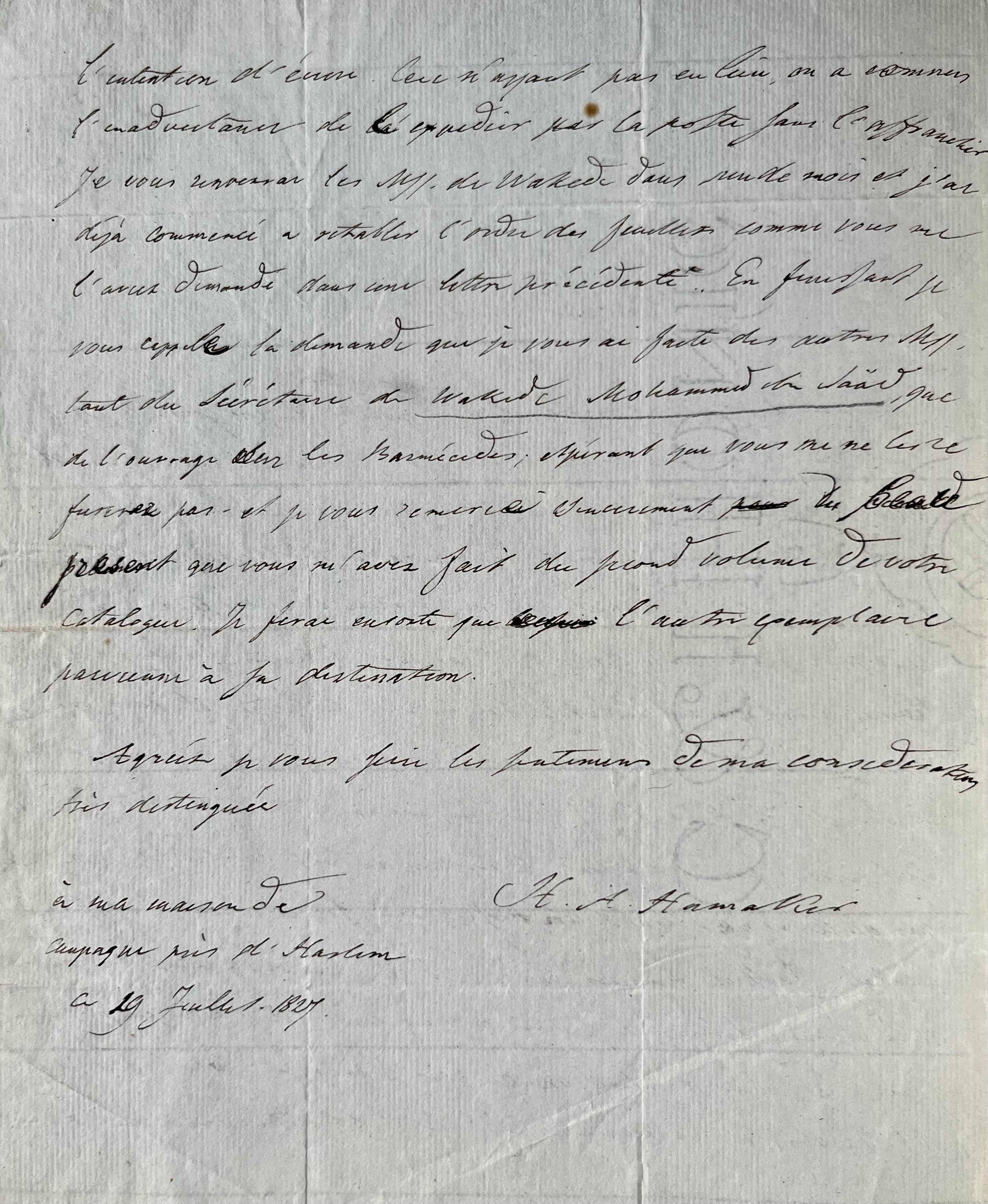 Il accuse réception de son paquet, le félicite de son travail sur les manuscrits de Gotha et lui adresse en retour le manuscrit d'Ibn Haukal. "[...] Je suis très curieux de connaître votre Itakhan dont je vous prie d'accélérer l'édition autant que possible, ne doutant pas qu'il ne me sera d'un grand secours pour l'édition d'Ibn Haukal […]. Je vous renverrai les mss de Wakede dans peu de mois et j'ai déjà commencé à rétablir l'ordre des feuillets comme vous me l'avez demandé dans une lettre précédente. En finissant, je vous rappelle la demande que je vous ai faite des autres mss tant du secrétaire de Wakede Mohammed ibn Saad que de l'ouvrage sur les Barmécides […]".