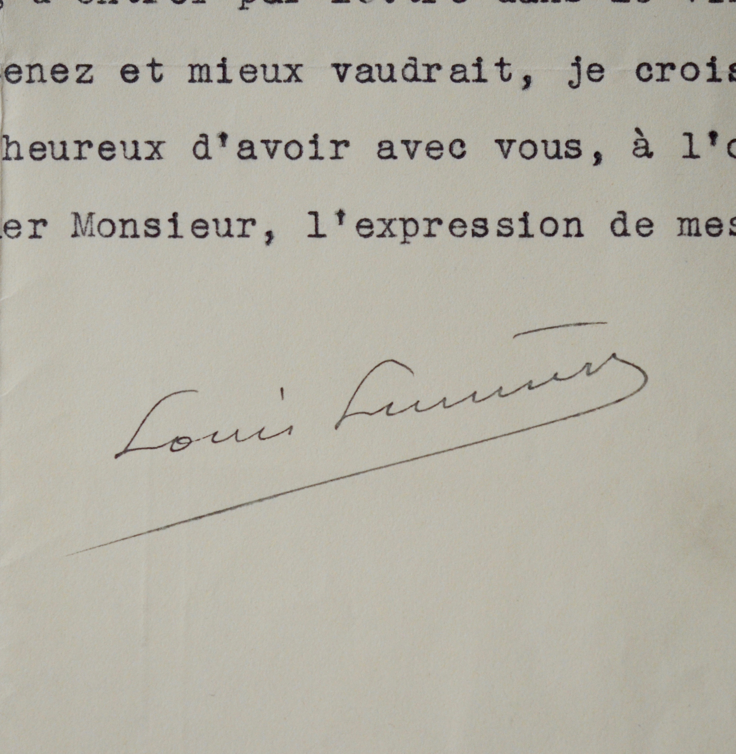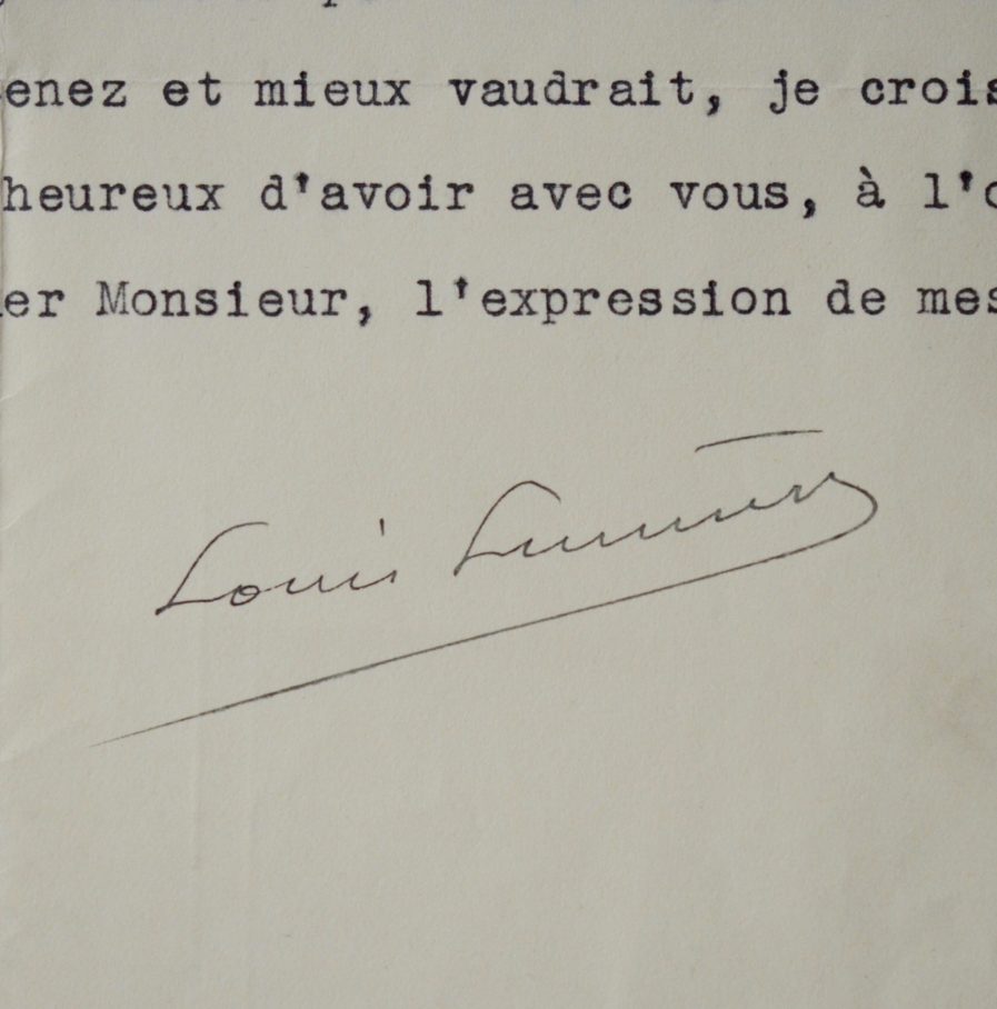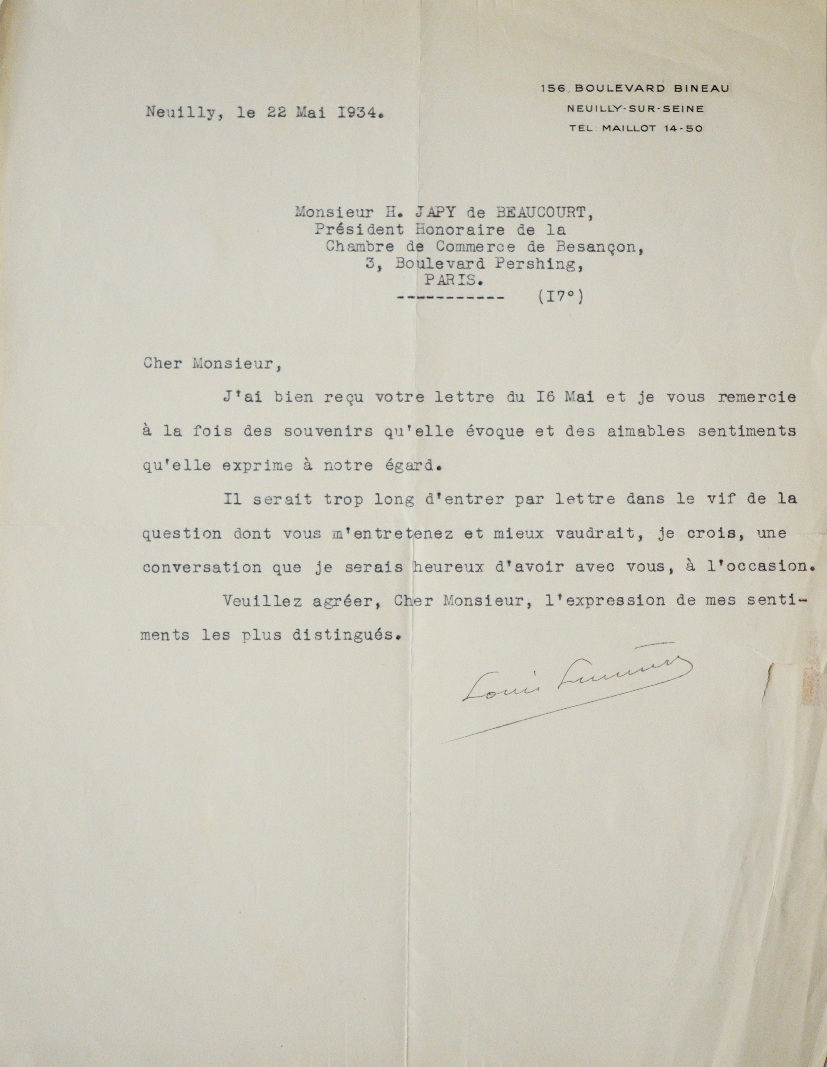 Lettre dactylographiée et signée de Louis Lumière, adressée au Président Honoraire de la Chambre de Commerce de Besançon, H. Japy de Beaucourt :