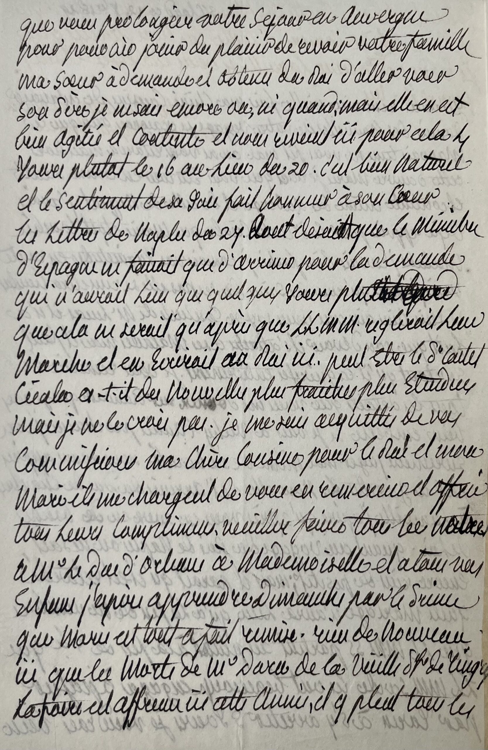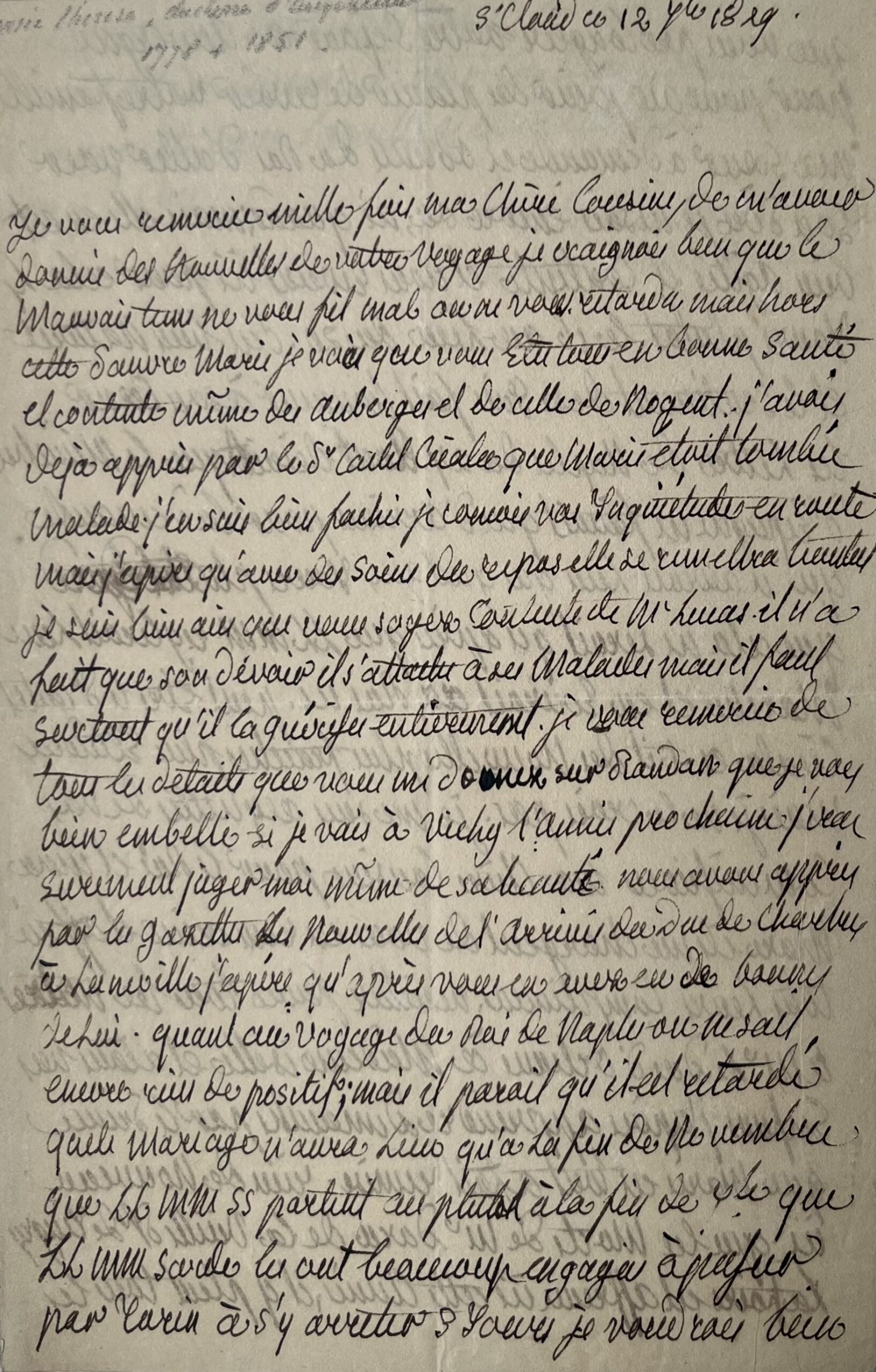 Marie-Thérèse Angoulême (duchesse d') (Versailles, 1778/1851)La duchesse d'Angoulême remercie sa cousine des détails de son voyage, et recommande de bien soigner sa pauvre fille Marie [d'Orléans (1813-1839), future duchesse de Wurtemberg] : "Nous avons appris par les gazettes les nouvelles de l'arrivée du duc de Chartres à Lunéville [...]". Elle promet de passer à Randan en se rendant à Vichy et évoque le voyage du Roi de Naples : "on ne sait encore rien de positif ; mais il paraît qu'il est retardé que le mariage n'aura lieu qu'à la fin de novembre que LL MM SS partent au plutot à la fin de 7bre que LL MM Sarde les ont beaucoup engagés à passer par Turin à s'y arreter 3 jours [...]". Elle transmet d'autres échos de la cour de Naples et assure sa cousine qu'elle s'est acquittée de ses commissions pour le Roi et son mari : "Ils me chargent de vous en remercier et offrent tous leurs complimens, veuillez faire tous les notres à M. le Duc d'Orleans à Mademoiselle [Mme Adélaïde] et à tous vos enfans [...]". Madame Royale ajoute : "Rien de nouveau ici que les morts de M. Daru, de la vieille dsse de Tingry ; la foire est affreuse ici cette année, il y pleut tous les jours [...]".
