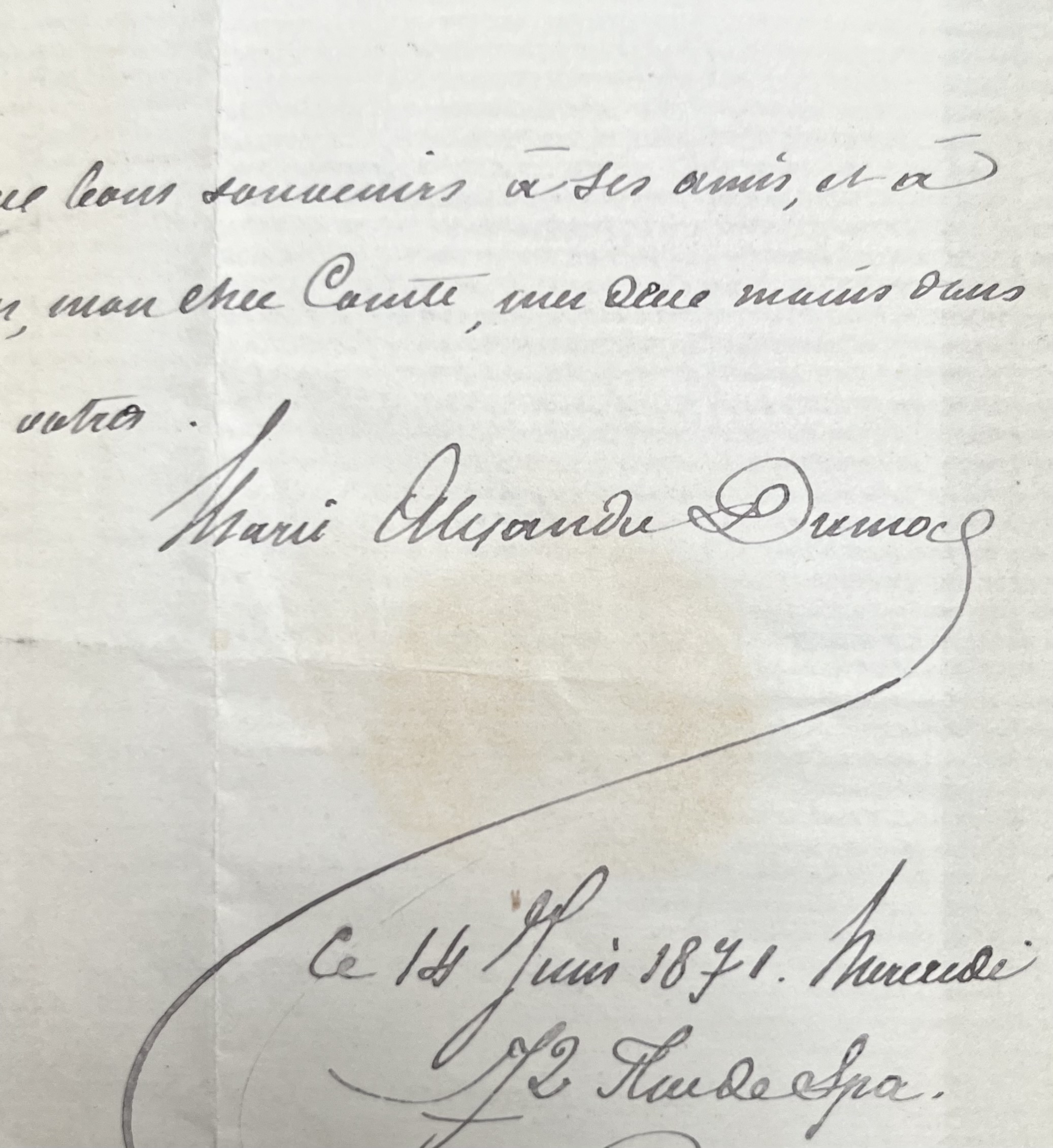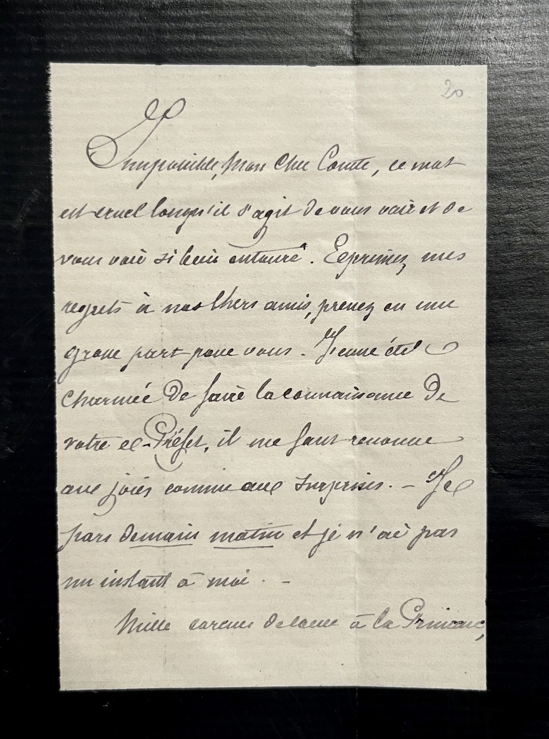 "Impossible mon cher Comte, ce mot est cruel lorsqu’il s’agit de vous voir et de vous voir si bien entouré. Exprimer mes regrets à nos chers amis, prenez-en une grosse part pour vous. J'eusse été charmée de faire la connaissance de votre ex-Préfet, il me faut renoncer aux joies comme aux surprises. Je pars demain matin et je n’ai pas un instant à moi. Mille caresses de cœur à la Princesse, doux bons souvenirs à ses amis, et à vous, mon cher Comte, mes deux mains dans les vôtres. Marie Alexandrine Dumas".