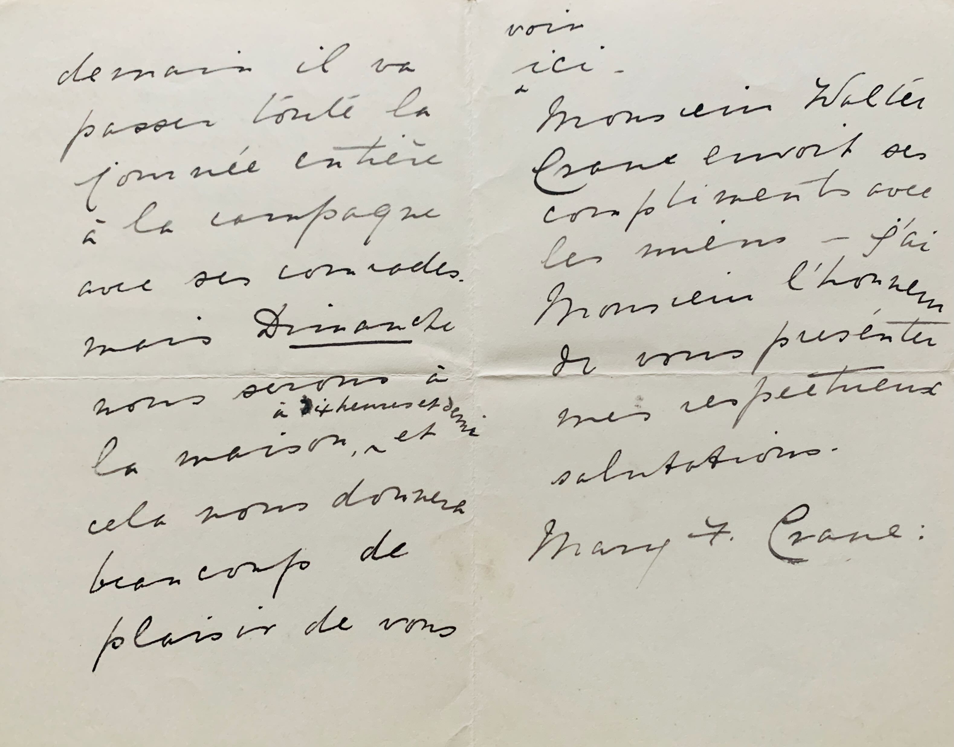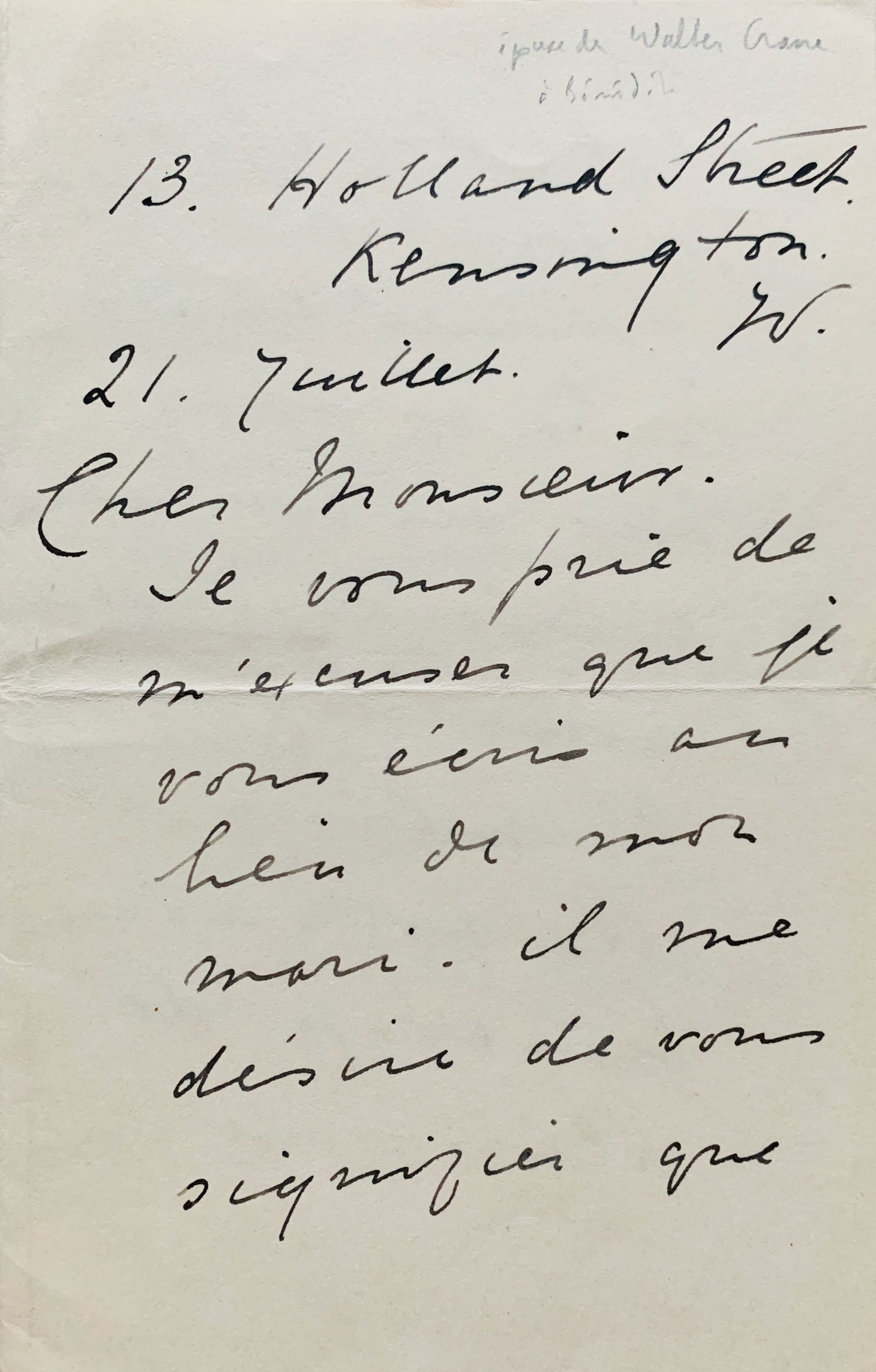 Lettre de Mary Frances Crane au conservateur et historien de l'art, Léonce Bénédite, écrite au nom de Walter Crane.