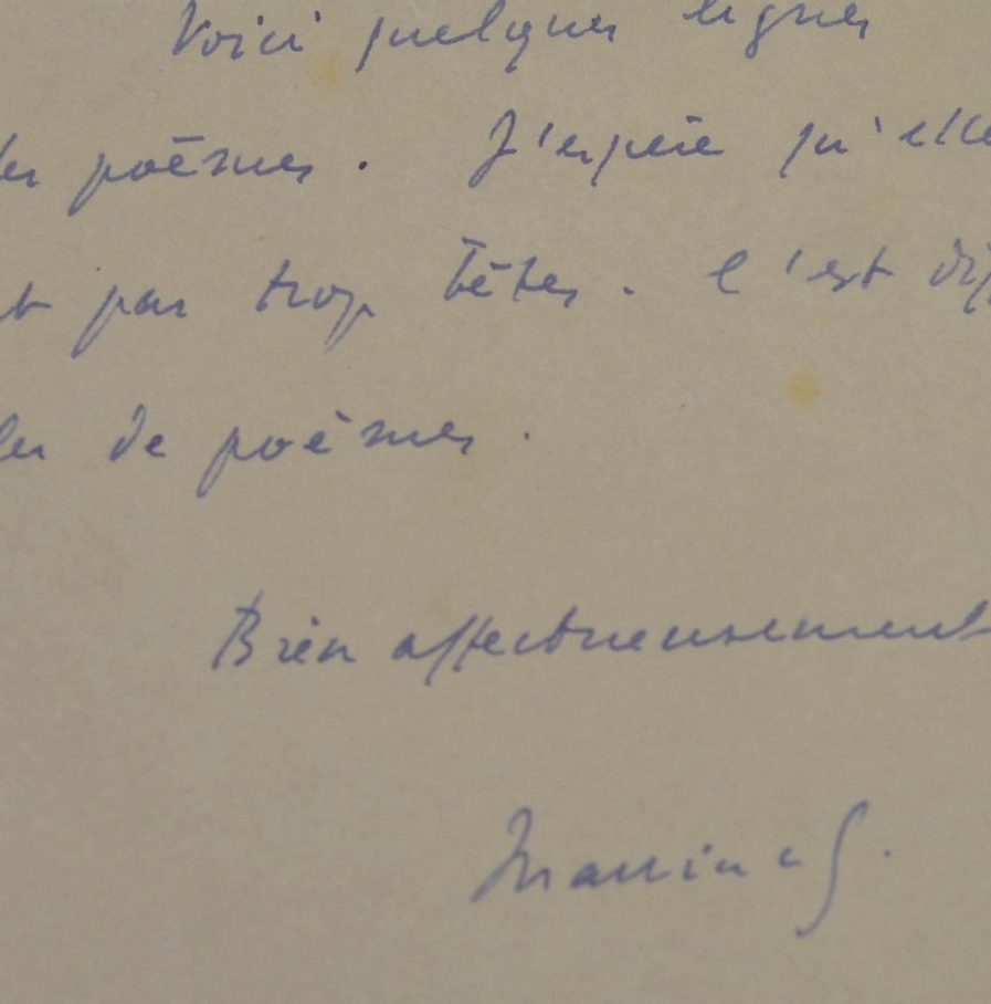 Après la publication de son dernier livre (probablement Au temps du Boeuf sur le Toit). "Je suis très touché par le magnifique article que tu as consacré à mon petit livre. Je t'en remercie de tout coeur. Voici quelques lignes pour les poèmes. J'espère qu'elles ne sont pas trop bêtes. C'est difficile de parler de poèmes".