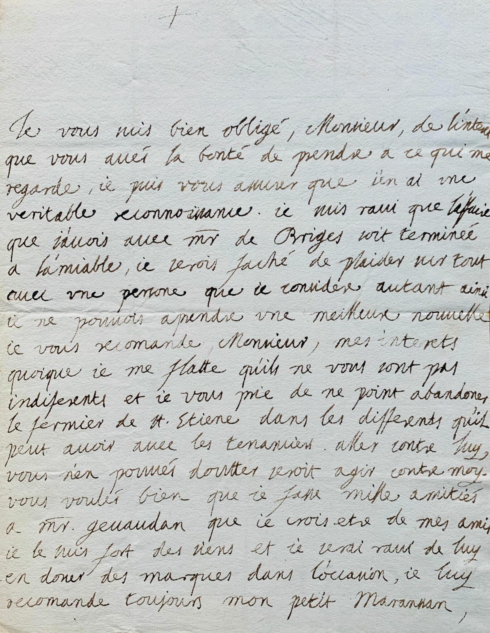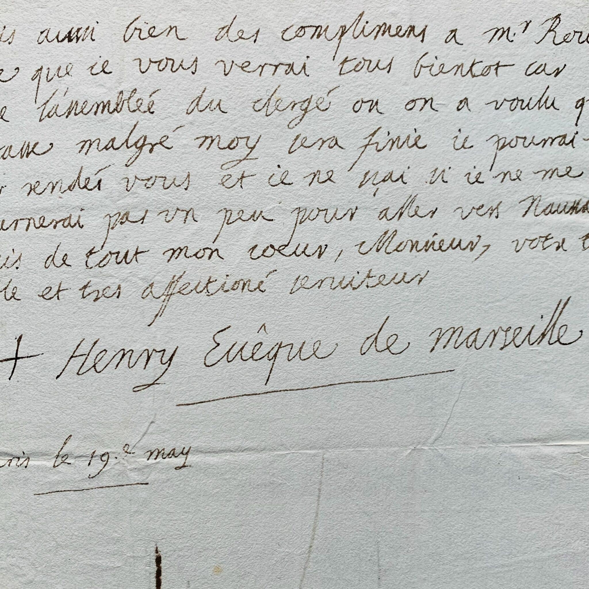 "Je vous suis bien obligé, Monsieur, de l'intérêt que vous avés la bonté de prendre à ce qui me regarde, je puis vous assurer que j'en ai une véritable reconnaissance [sa nomination à l'évêché de Marseille venait d'être ratifiée par le pape]. Je suis ravi que l'affaire que j'avois avec Mr de Bridges soit terminée à l'amiable, je serois faché de plaider sur tout avec une personne que je considère autant, ainsi je ne pourrois apprendre une meilleure nouvelle. Je vous recommande, monsieur, mes intérêts, quoique je me flatte qu'ils ne vous sont pas indifférents, et je vous prie de ne point abandonner le fermier de St Etienne dans les différends qu'il peut avoir avec les tenanciers. Aller contre luy, vous n'en pourrés doutter, seroit agir contre moy. Vous voulés bien que je fasse mille amitiés à Mr. Gévaudan que je crois être de mes amis, je le suis fort des siens et je serai ravi de luy en donner des marques dans l'occasion, je luy recommande toujours mon petit Marankan, je fais aussi bien mes compliments à Mr Roux. J'espère que je vous verrai tous bientôt car dès que l'assemblée du clergé où on a voulu que j'assistasse malgré moy sera finie je pourrai vous donner rendez vous et je ne sçai si je ne me détournerai pas un peu pour aller vers Naussac [en Lozère, où est situé le château abbatial de l'abbaye des Chambons]. Je suis de tout mon coeur, Monsieur, votre très humble et très affectionné serviteur. + Henry Évêque de Marseille".