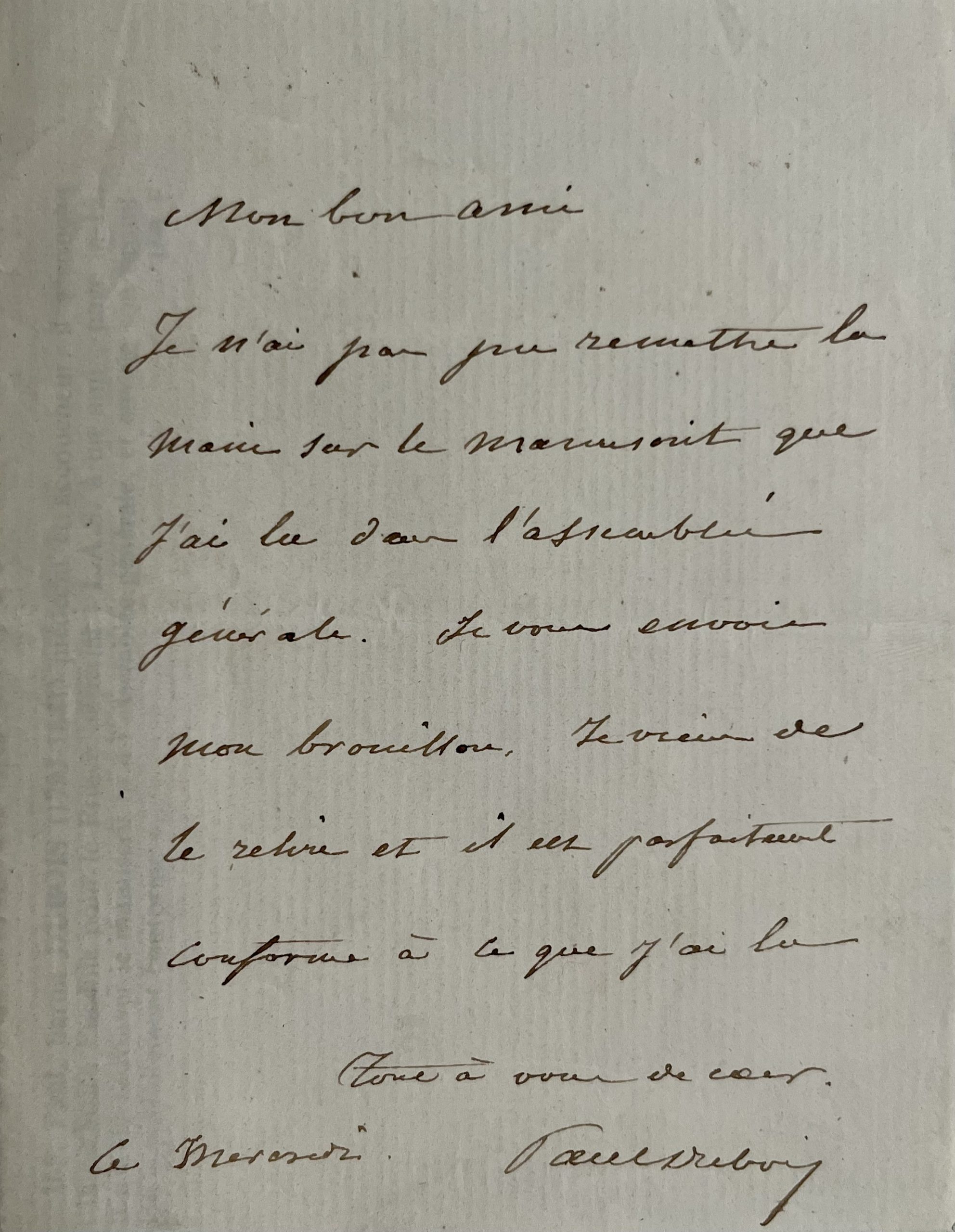 Paul Dubois ne parvient pas à remettre la main sur le manuscrit qu'il à lu lors de l'assemblée générale ; il lui envoie son brouillon "parfaitement conforme".