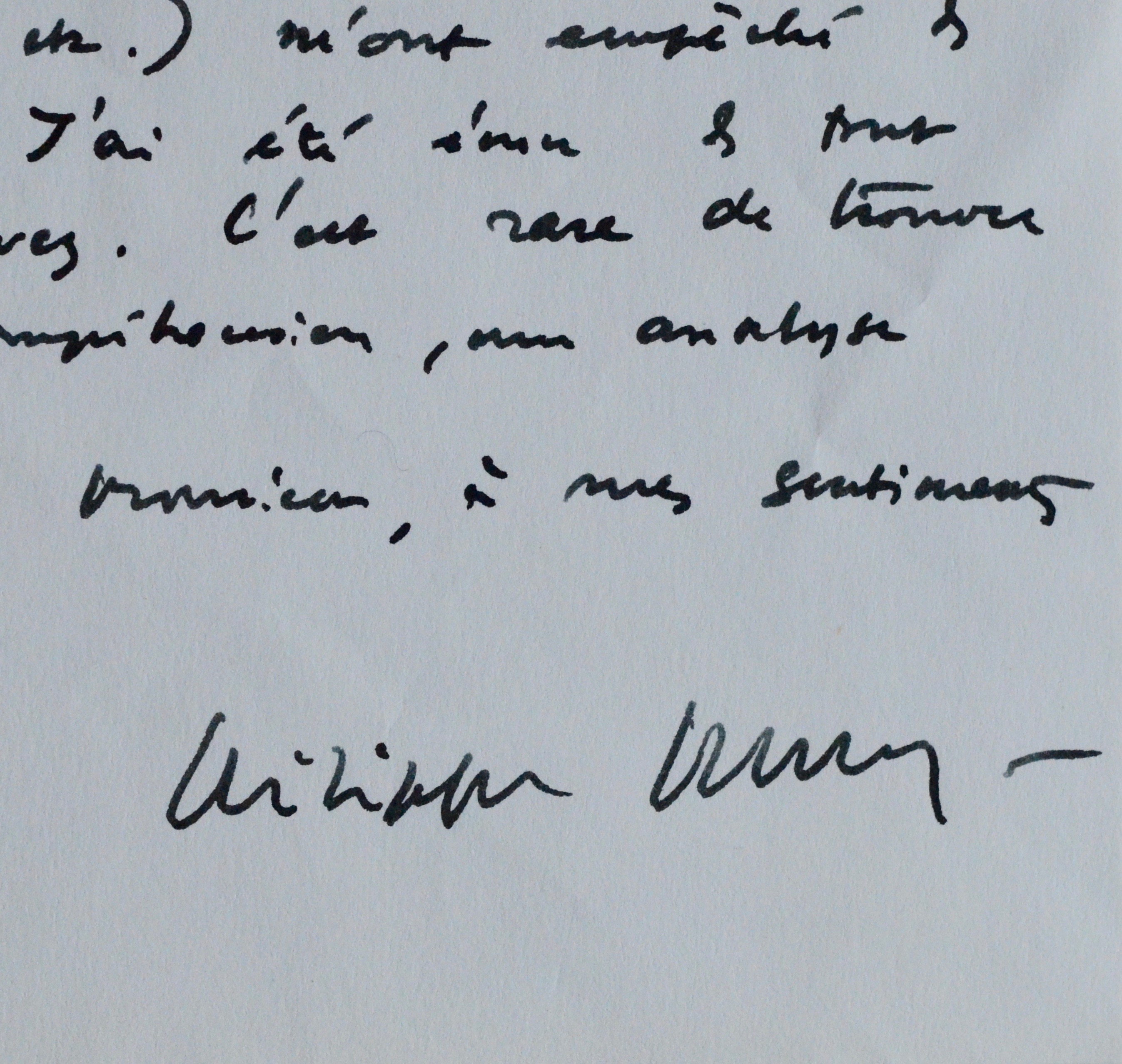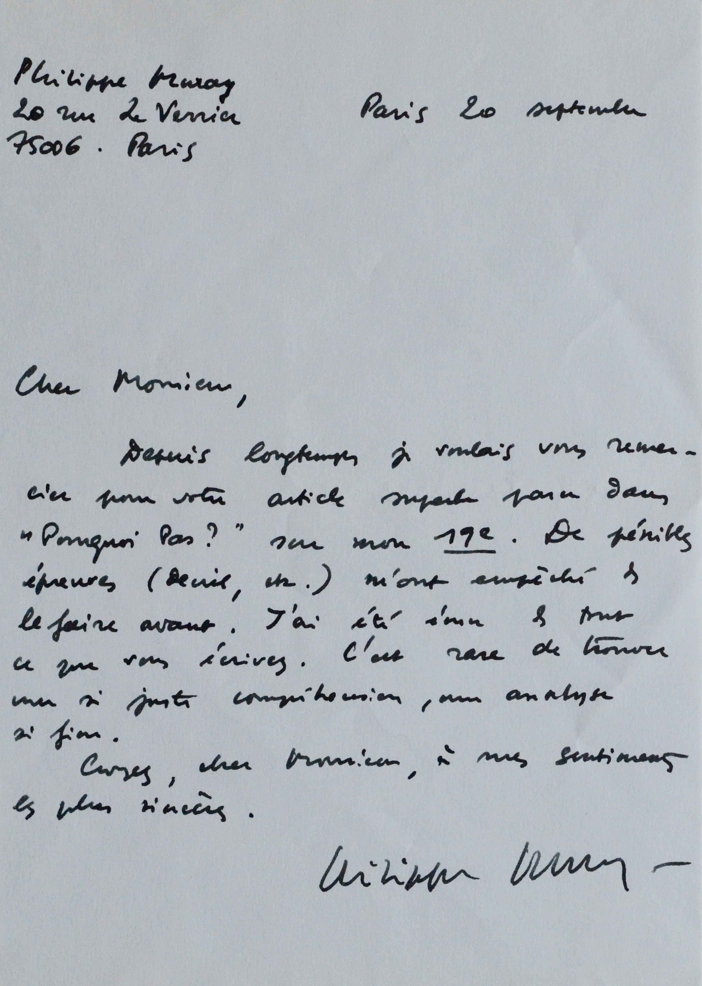 "Depuis longtemps je voulais vous remercier pour votre article superbe paru dans "Pourquoi Pas ?" sur mon 19e. De pénibles épreuves (deuil, etc.) m'ont empêché de le faire avant. J'ai été ému de tout ce que vous écrivez. C'est rare de trouver une si juste compréhension, une analyse si fine [...]".
