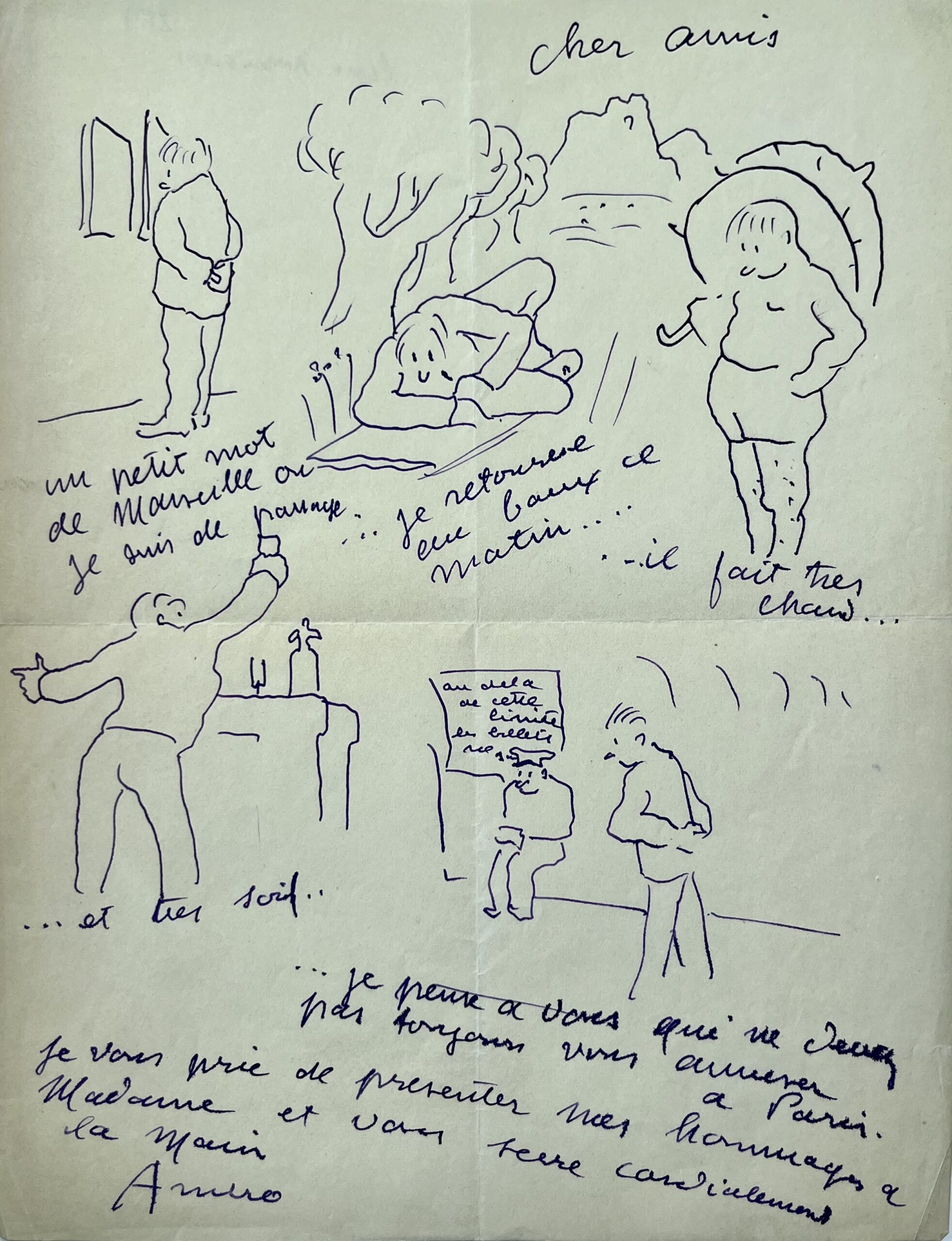 "Un petit mot de Marseille où je suis de passage... je retourne aux Baux ce matin... il fait très chaud et très soif. Je pense à vous qui ne devez pas toujours vous amuser à Paris. Je vous prie de présenter mes hommages à Madame et vous serre cordialement la main. Ambro".