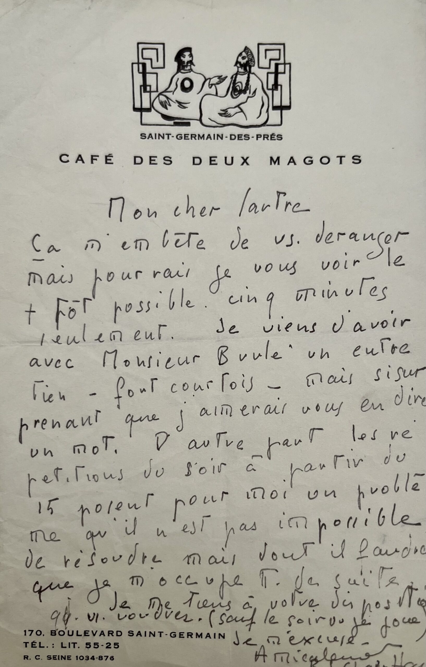 "Mon cher Sartre. Ça m’embête de vs déranger, mais pourrais je vous voir le + tôt possible. Cinq minutes seulement. Je viens d’avoir avec Monsieur Brulé en entretien –fort courtois– mais si surprenant que j’aimerais vous en dire un mot. D’autre part les répétitions [probablement pour Le Diable et le Bon Dieu] du soir à partir du 15 posent pour moi un problème qu’il n’est pas impossible de résoudre, mais dont il faudrait que je m’occupe tt de suite. Je me tiens à votre disposition qd vs voudrez (sauf le soir où je joue). Je m’excuse. Amicalement. RJ Chauffard".