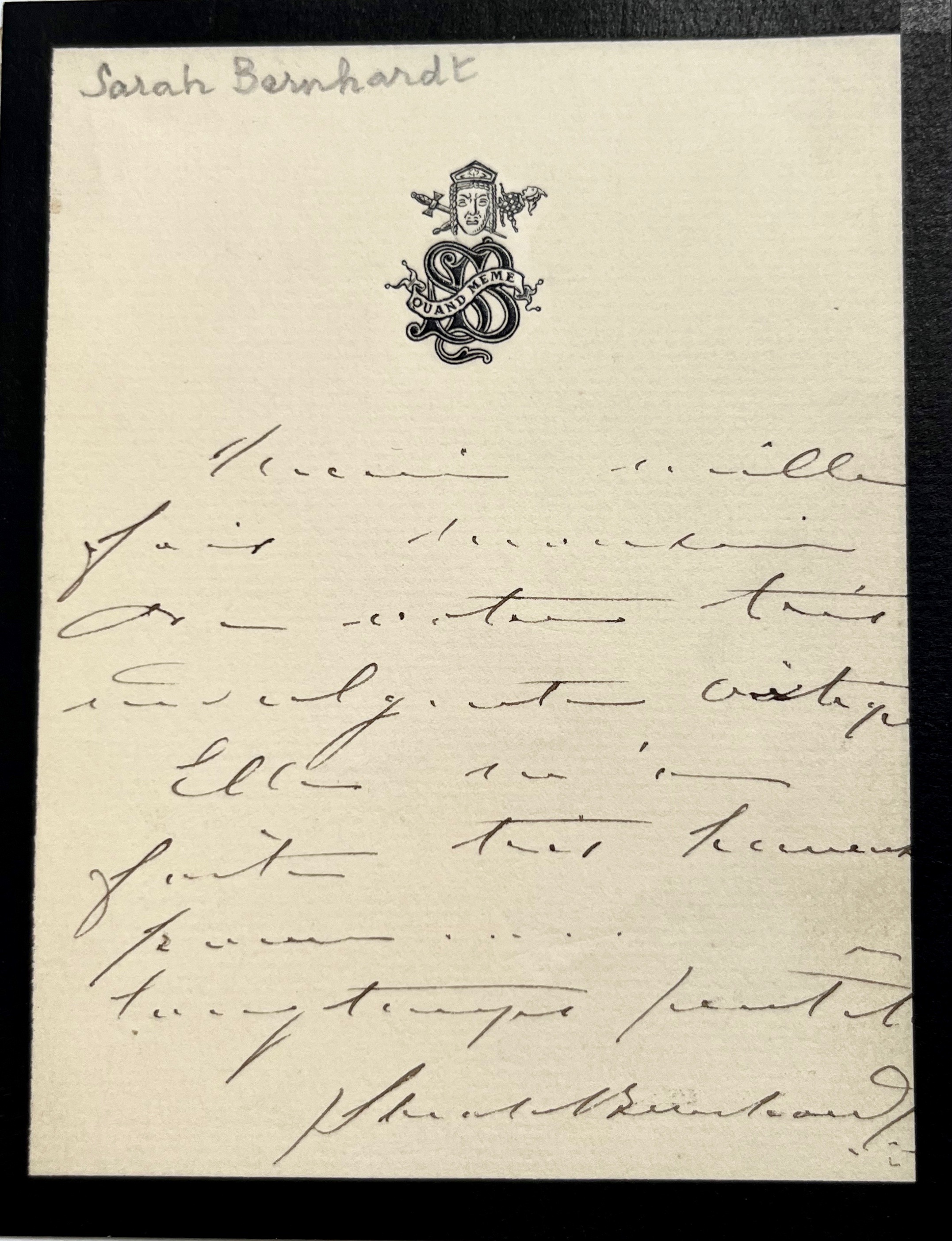 Lettre de remerciements de Sarah Bernhardt pour une « très indulgente critique »