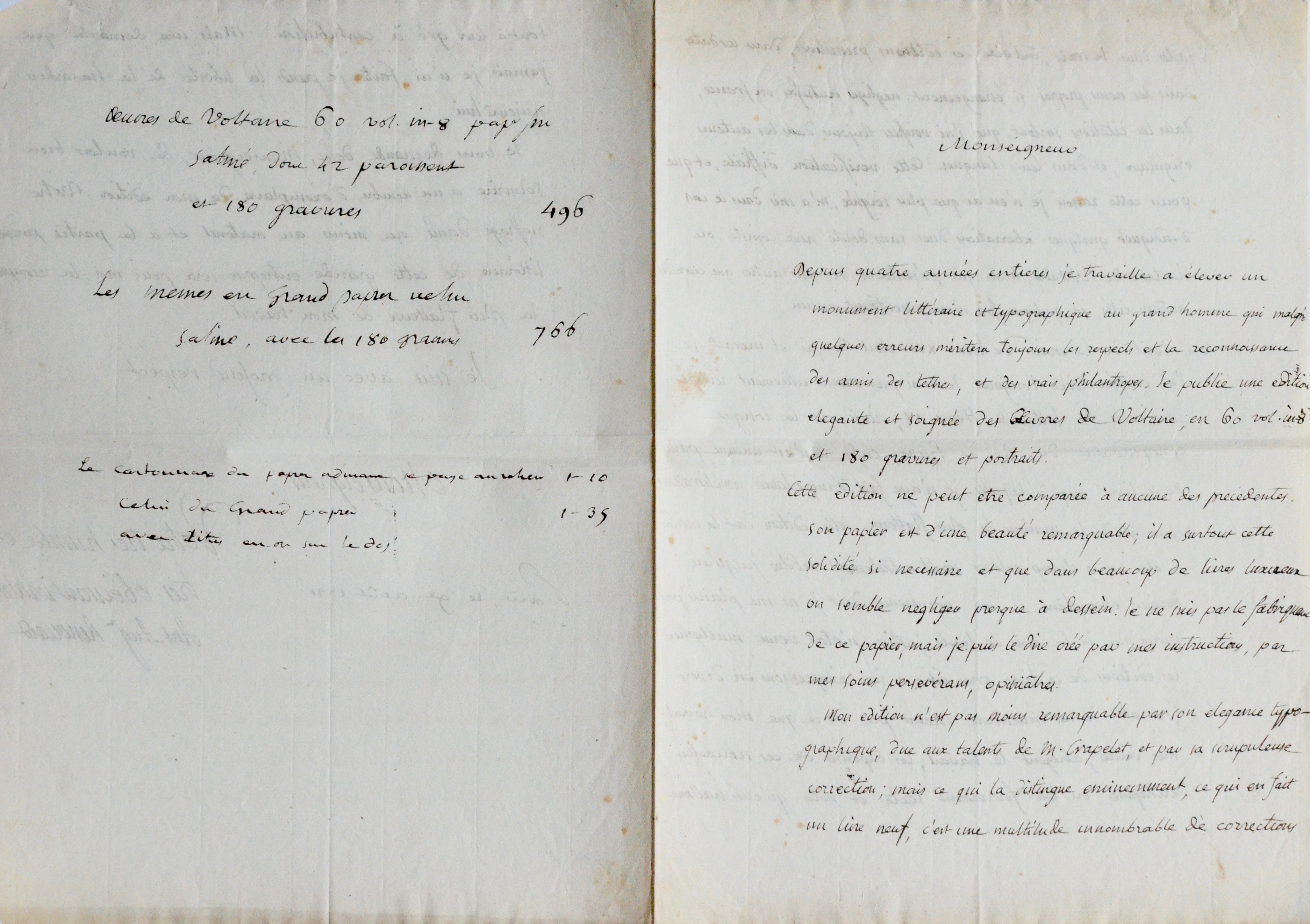 Le verso du second feuillet porte des comptes "Oeuvres de Voltaire 60 vol. in-8 pap. fin satiné, dont 42 paraissent et 180 gravures. 496. Les mêmes en grand papier venin satiné, avec 180 gravures. 766. Le cartonnage du papier fin se paye 1-10 [...]".