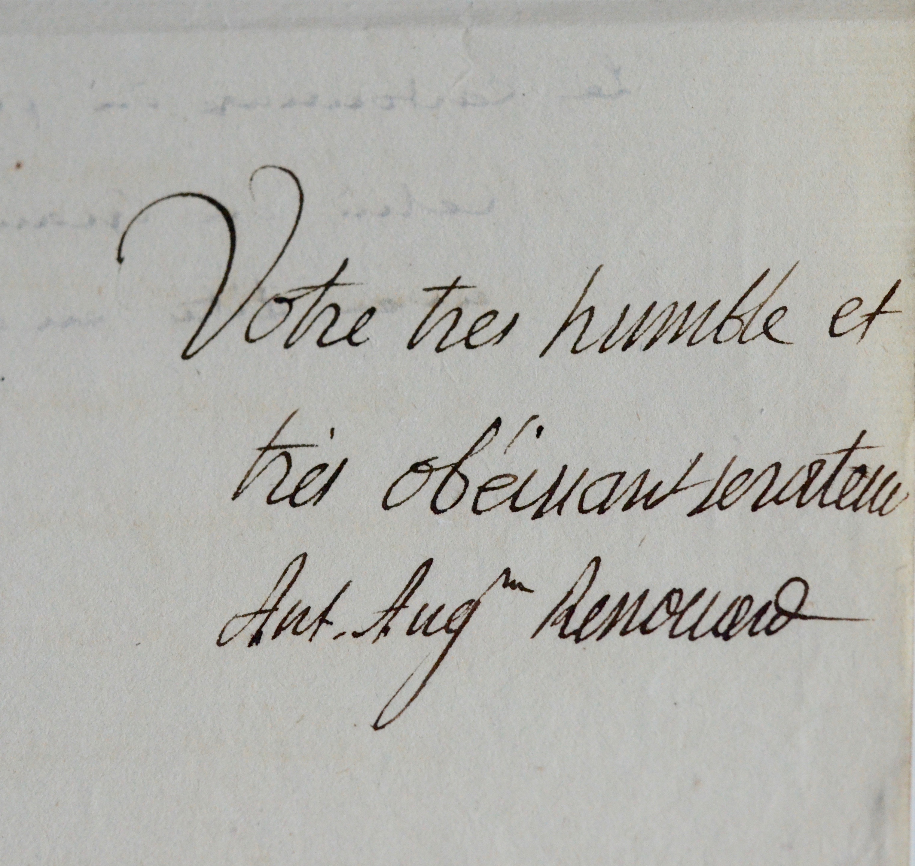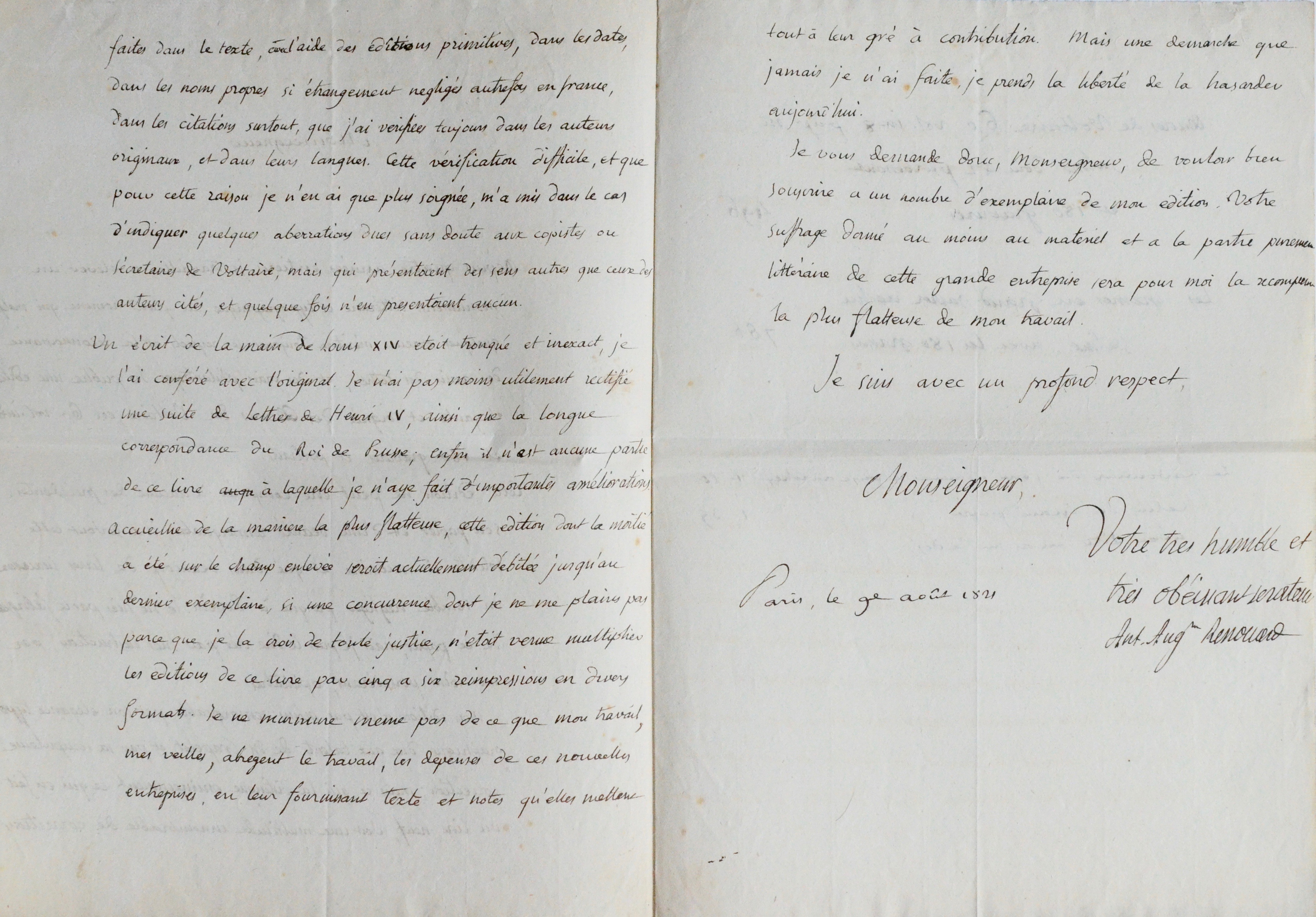 Je publie une édition élégante et soignée des oeuvres de Voltaire, en 60 vol. in-8 et 180 gravures et portraits. Cette édition ne peut être comparée à aucune des précédentes. Son papier est d'une beauté remarquable ; il a surtout cette solidité si nécessaire et que dans beaucoup de livres luxueux on semble négliger presque à dessein. Je ne suis pas le fabriquant de ce papier, mais je puis le dire créé par mes instructions, par mes soins persévérants, opiniâtres. Mon édition n'est pas moins remarquable par son élégance typographique, due aux talents de M. Crapelet [l'éditeur et imprimeur Georges-Adrien Crapelet (1789-1842)], et par sa scrupuleuse correction ; mais ce qui la distingue éminemment, ce qui en fait un livre neuf, c'est une multitude innombrable de corrections faites dans le texte, avec l'aide des éditions primitives, dans les dates, dans les noms propres si étrangement négligés autrefois en France, dans les citations surtout, que j'ai vérifiées toujours dans les auteurs originaux, et dans les langues. Cette vérification difficile, et que pour cette raison je n'en ai que plus soignée, m'a mis dans le cas d'indiquer quelques aberrations dues sans doute aux copistes ou secrétaires de Voltaire [...]". Il cite des erreurs notables : une lettre de Louis XIV, une lettre d'Henri IV, "ainsi que la longue correspondance du Roi de Prusse" et évoque le tirage de l'ouvrage, demande à son correspondant de souscrire "à un nombre d'exemplaires de mon édition", etc.