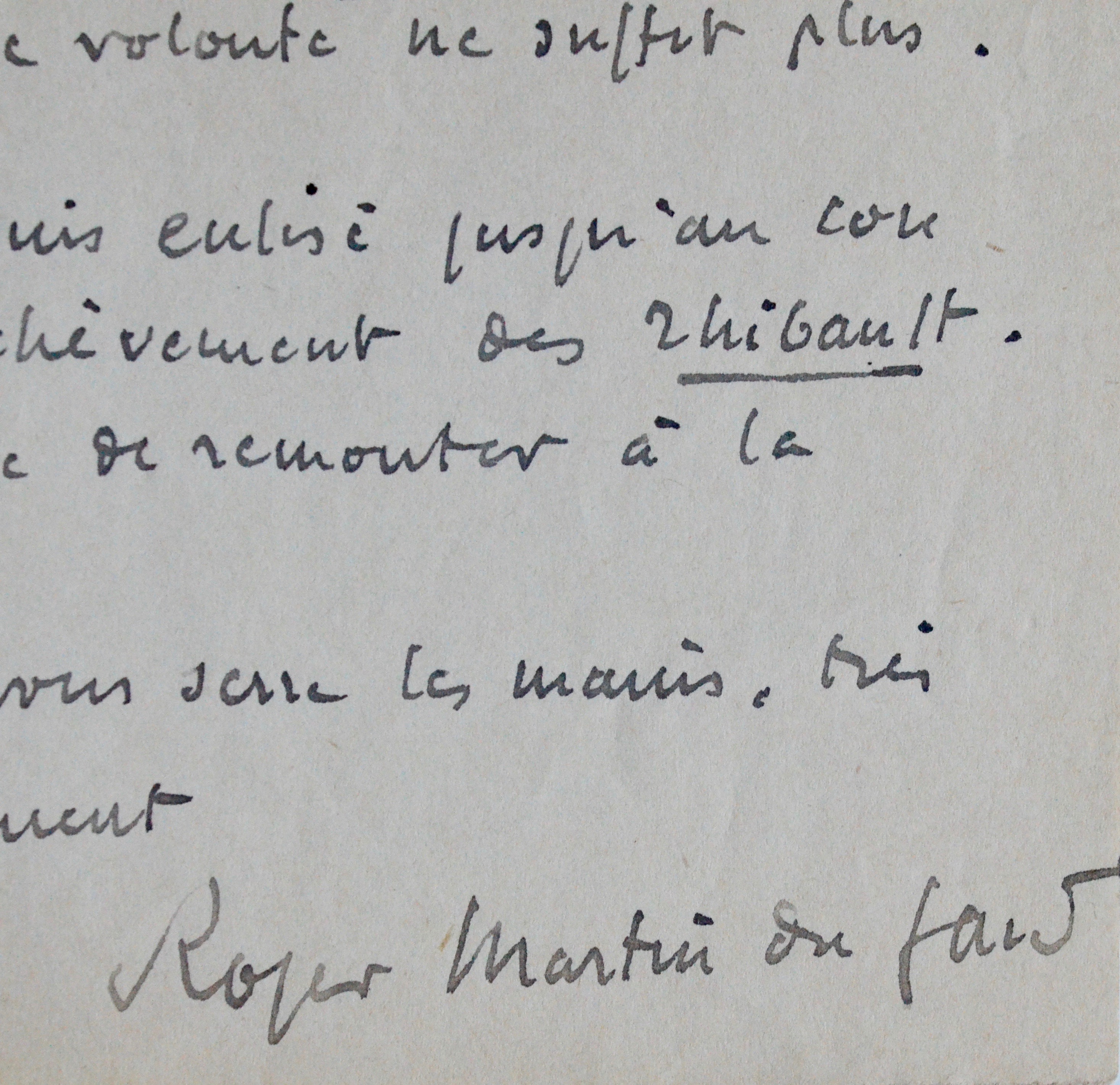 Très belle lettre de Roger Martin du Gard, à son ami Marcel Jouhandeau :