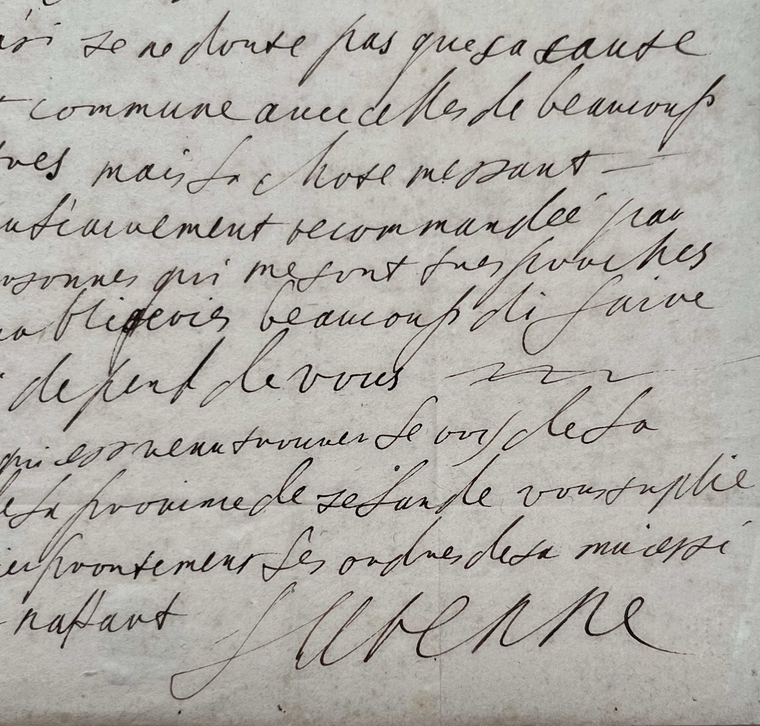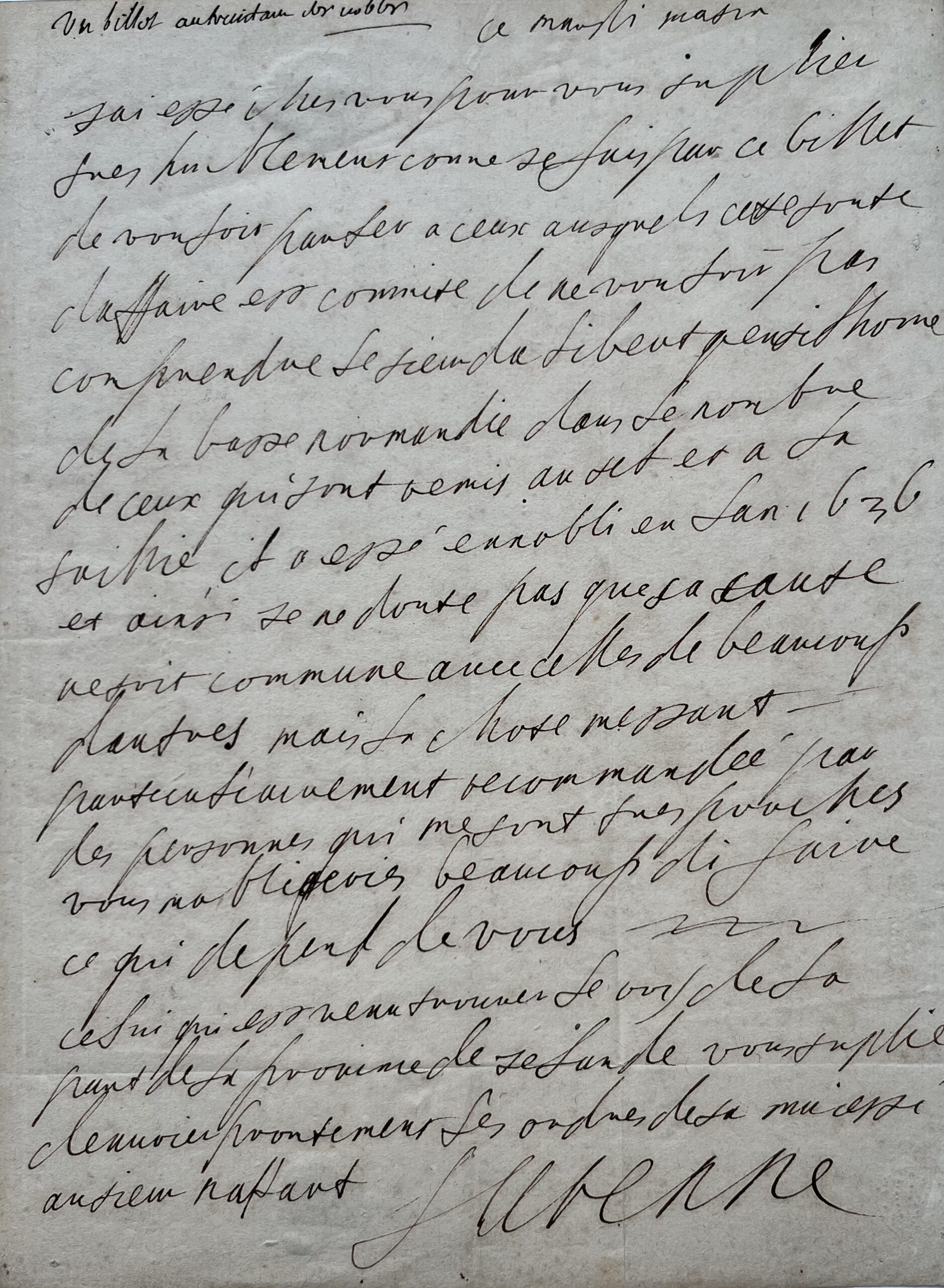 "J'ai esté chez vous pour vous suplier tres humblement comme je fais par ce billet de vouloir panser a ceux ausquels cette sorte daffaire est commise de ne vouloir pas comprendre le sieur d’Alibert gentilhome de la basse Normandie dans le nombre de ceux qui sont remis [...]. Il a esté ennobli en lan 1636 et ainsi je ne doute pas que sa cause ne soit commune avec celles de beaucoup dautres mais sa chose mestant particulièrement recommandée par des personnes qui me sont tres proches vous m'obligeries beaucoup di faire ce qui dépend de vous. Celui qui est venu trouver  [...]".