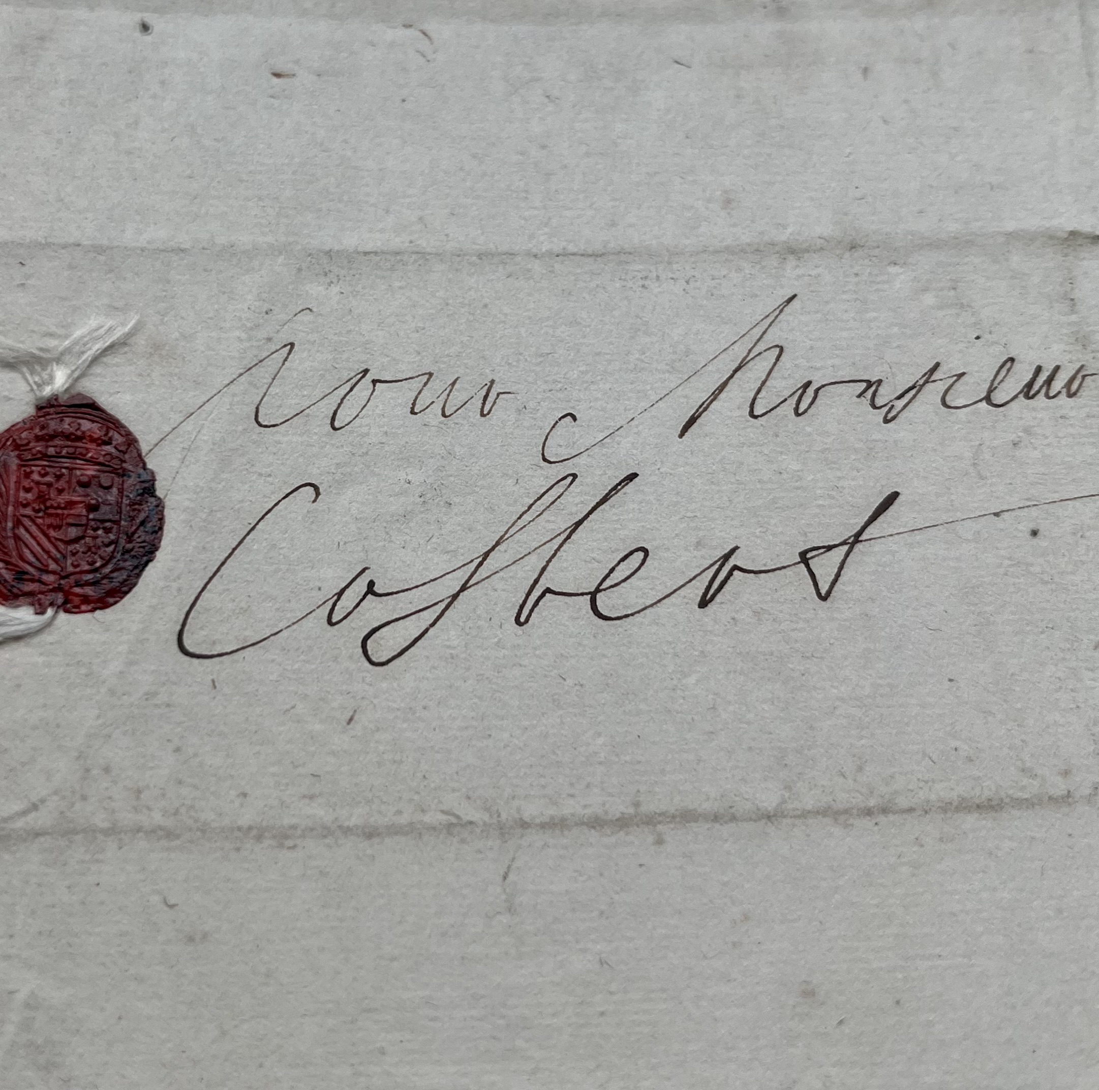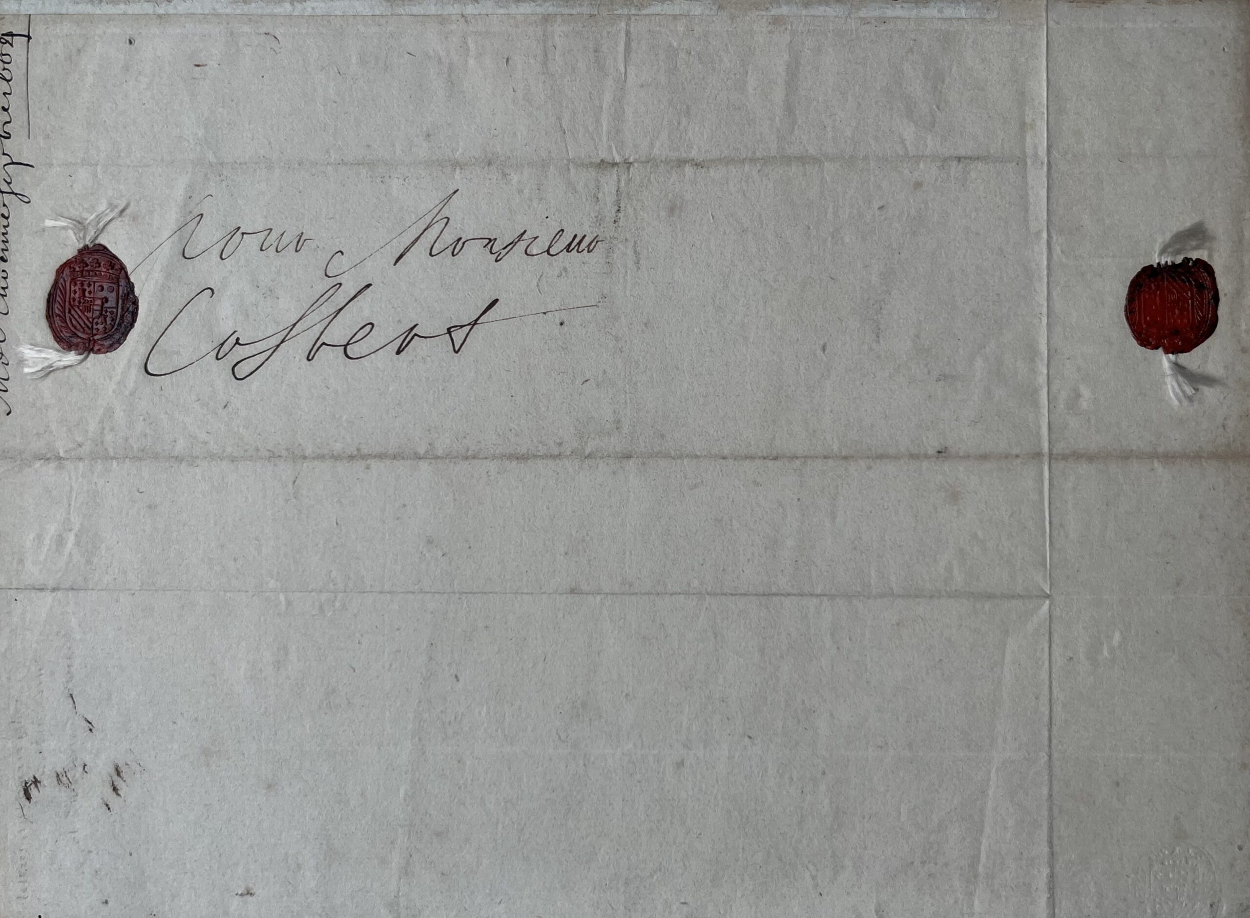 Adresse autographe au verso du second feuillet "Pour monsieur Colbert", avec deux cachets de cire rouge aux armes de Turenne sur de lacs de soie blanche.