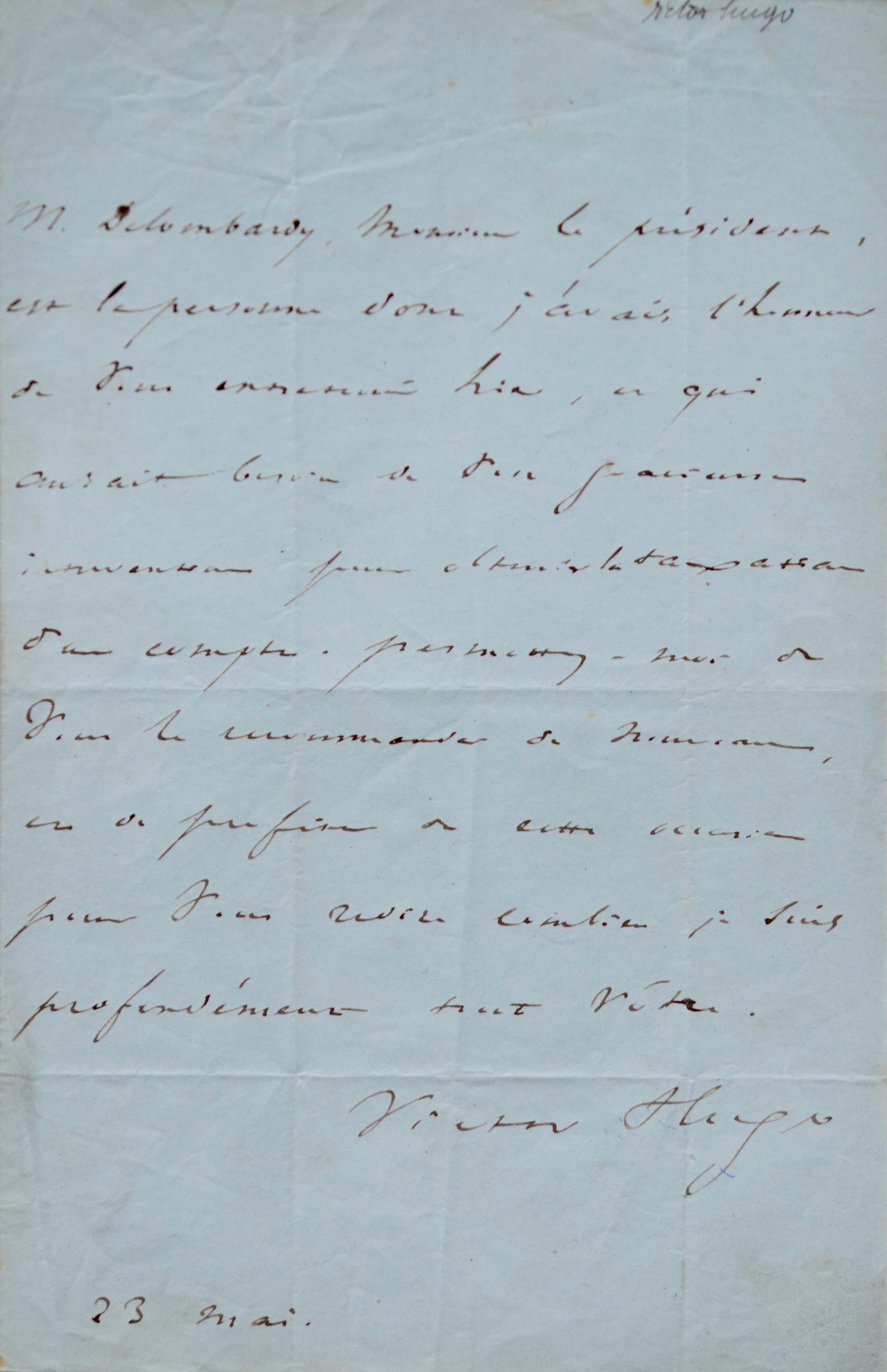 "M. Delombardy [Paul de Lombardy], monsieur le président, est la personne dont j’avais l’honneur de vous entretenir hier, et qui aurait besoin de votre gracieuse intervention pour obtenir la taxation d’un compte. Permettez-moi de vous le recommander de nouveau, et de profiter de cette occasion pour vous redire combien je suis profondément tout vôtre. Victor Hugo".
