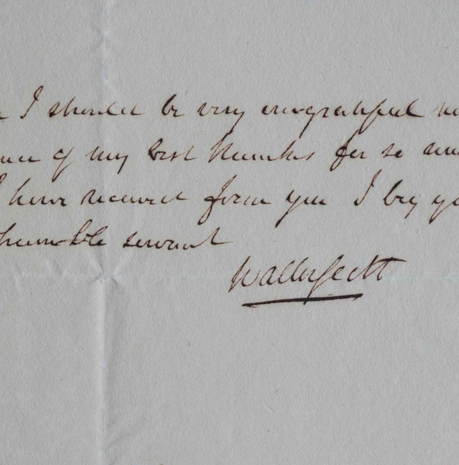 Lettre de Walter Scott écrite lors du séjour qu'il fit à Paris à la fin de l'année 1826, en compagnie de sa fille Anne, au cours duquel il fit représenter Ivanhoé sur une musique de Rossini, à l'Opéra. «In leaving France I should be very ungrateful not to acceptance your acceptance of my best thanks for so much kind attention as I have received from you. I beg you will believe me [...]». Cette lettre a été publiée en 1840 dans le bulletin de la Société des sciences et lettres de Blois.