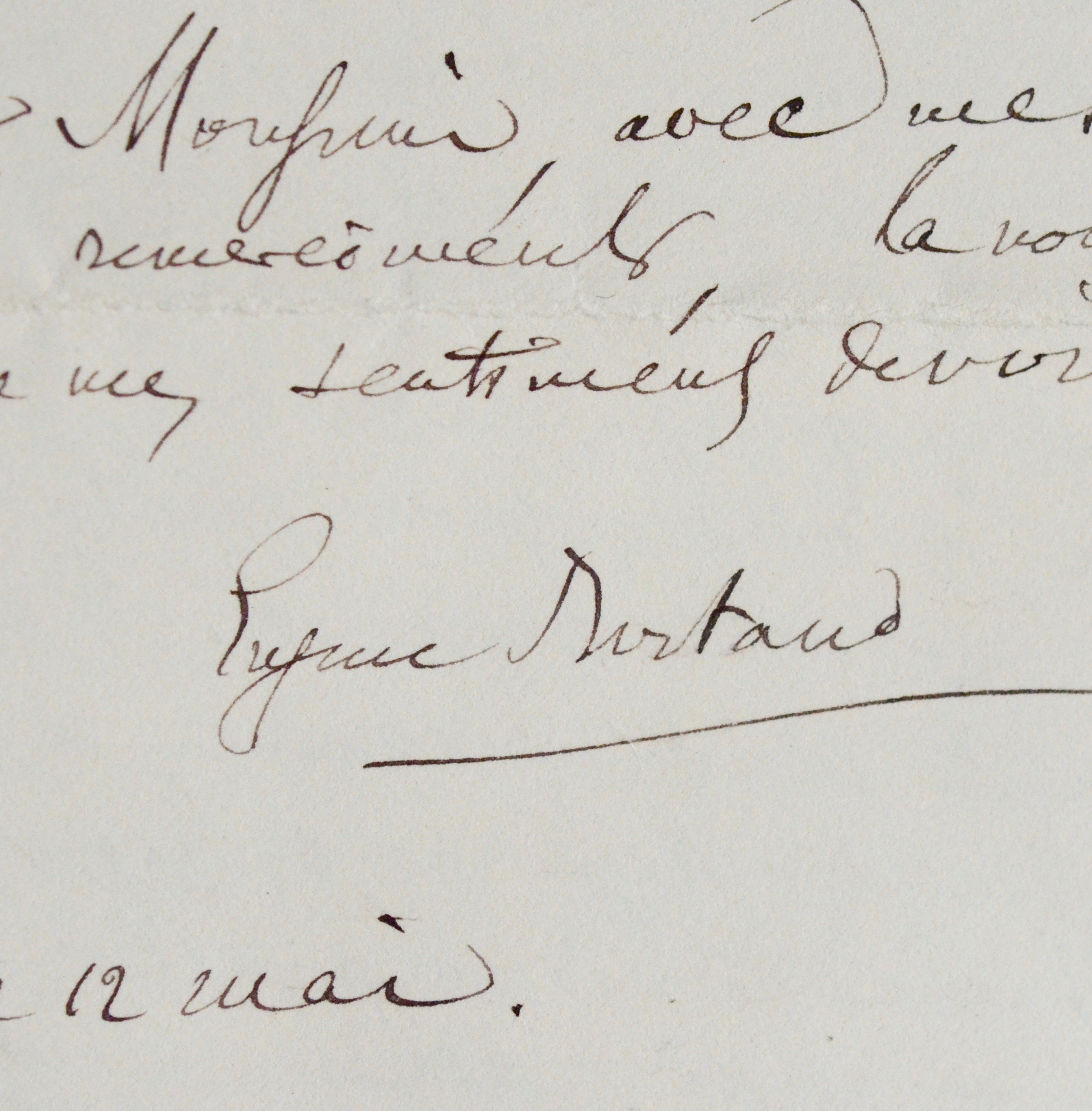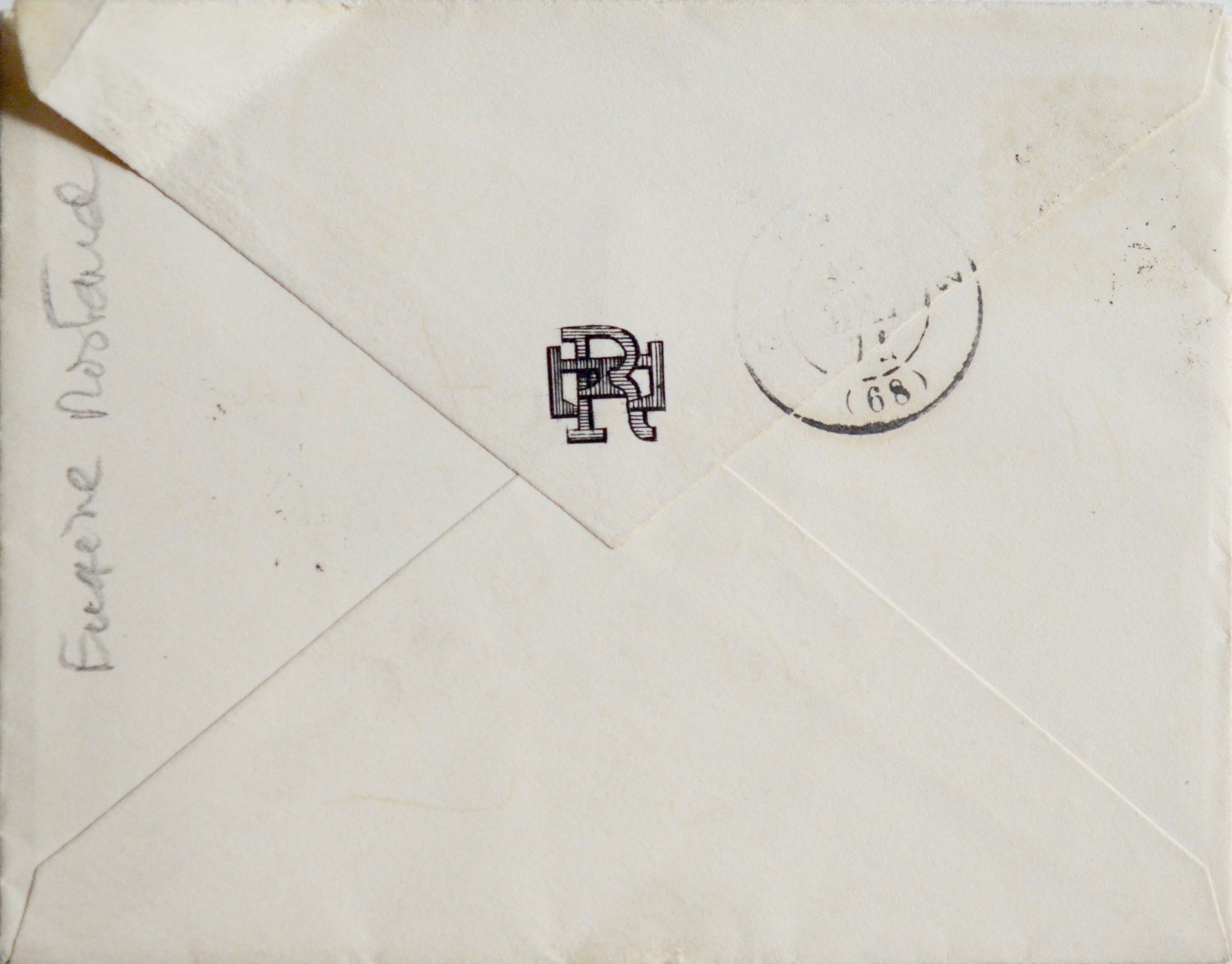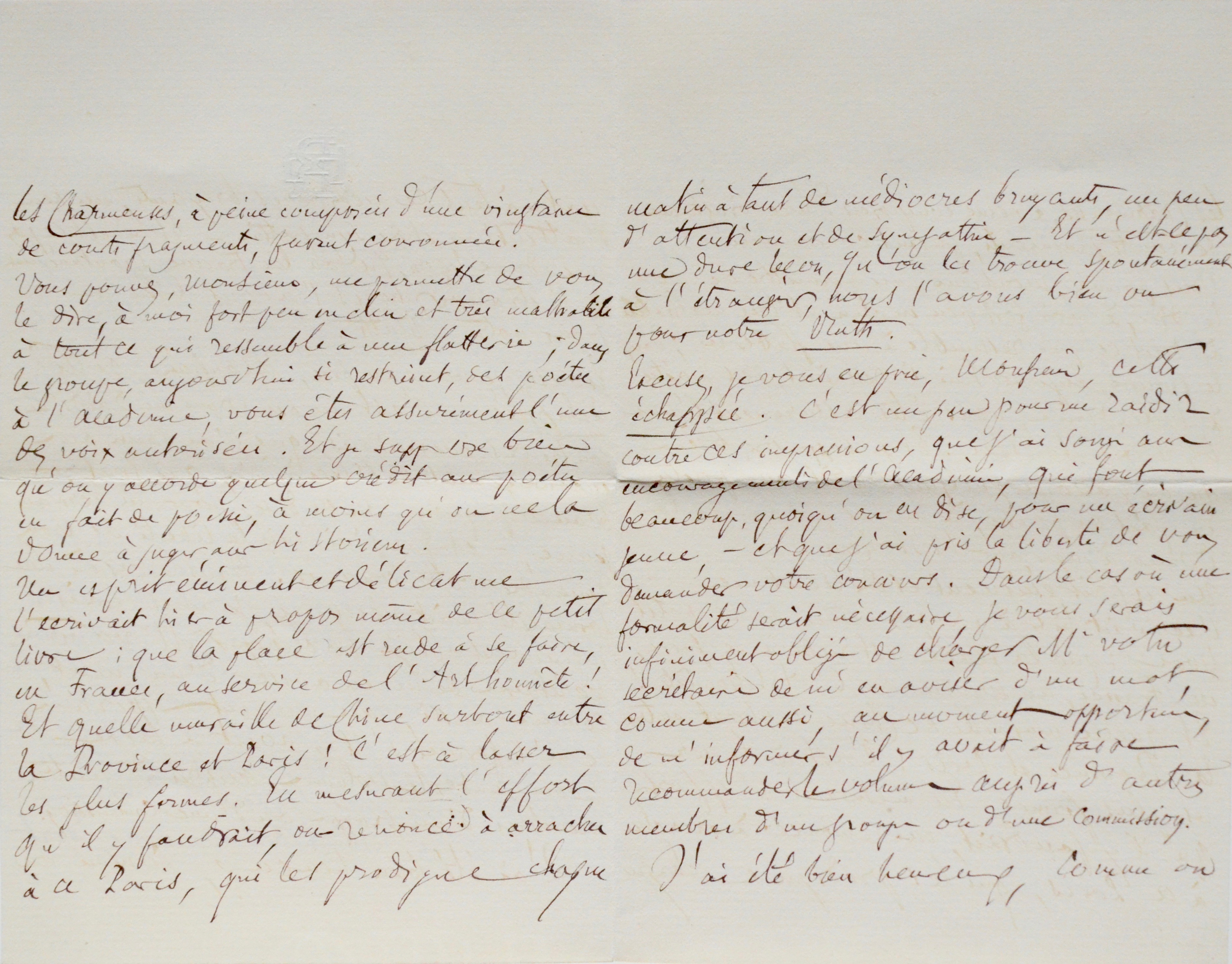 Encre brune sur double feuillet de papier vergé filigrané "Original". Beau chiffre gravé en tête. Enveloppe conservée avec adresse autographe, timbre et marques postales. Le verso porte également le chiffre ER gravé.