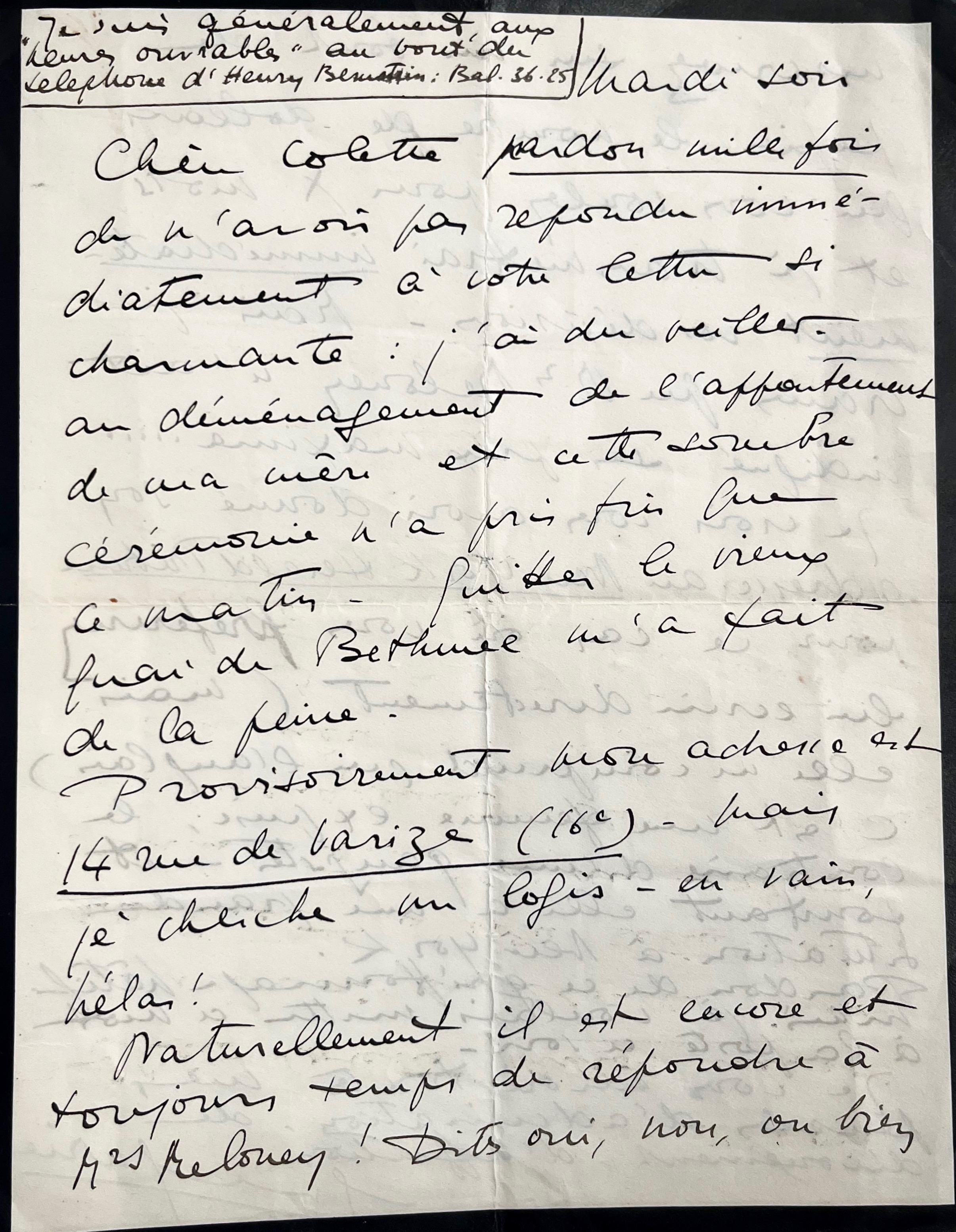 "Pardon mille fois de n'avoir pas répondu immédiatement à votre lettre si charmante : j'ai du veiller au déménagement de l'appartement de ma mère [décédée en 1934] et cette sombre cérémonie n'a prit fin que ce matin. Quitter le vieux quai de Bethune m'a fait de la peine".