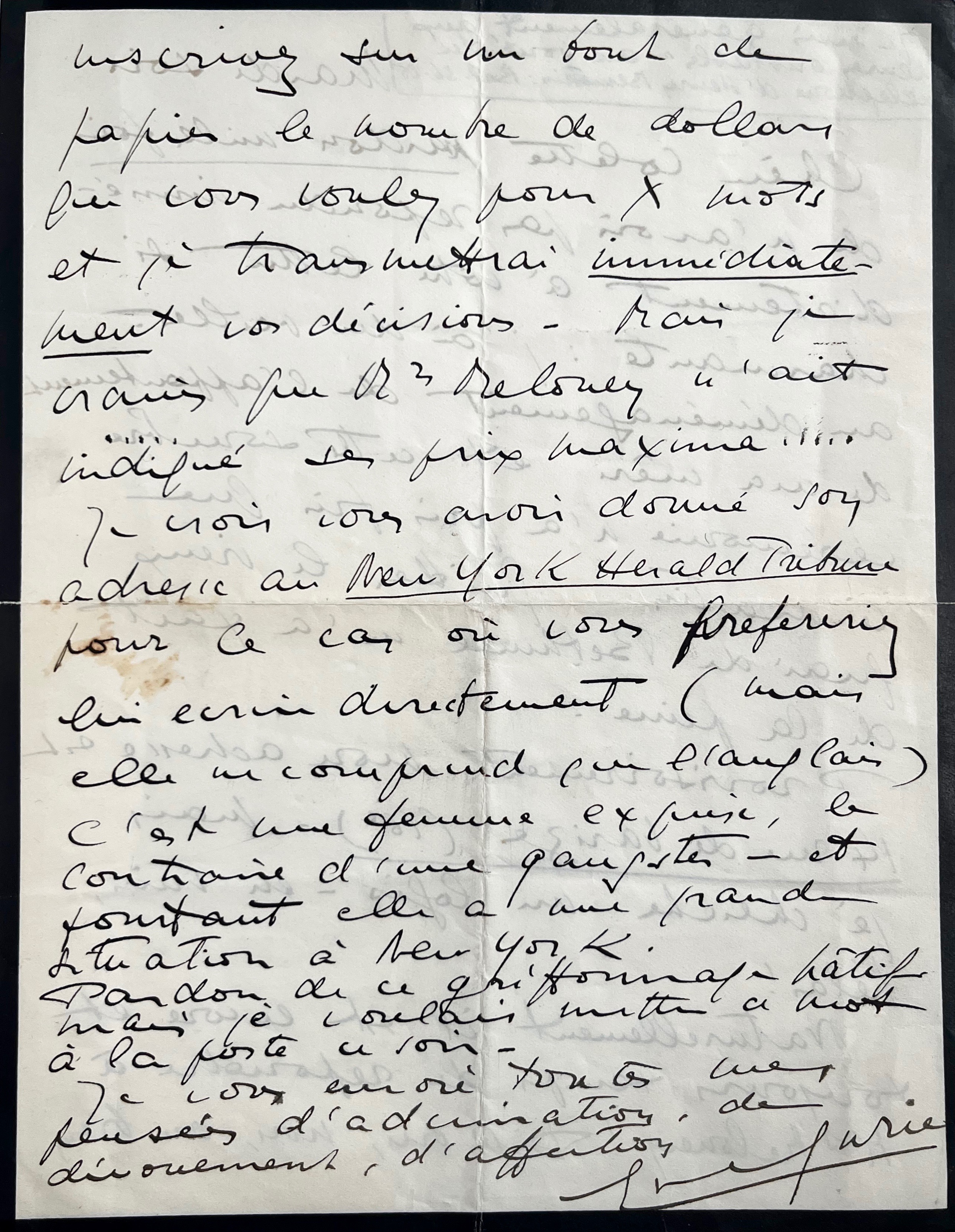 Elle lui communique sa nouvelle adresse rue de Varizen dans le 16e arrondissement, puis évoque avec elle Marie Mattingly Meloney (1878-1943), l'une des femmes journalistes les plus éminentes aux États-Unis (selon le New-York Times), figure de proue de la haute société Américaine et qui fut aussi une grande amie de Marie Curie : "Naturellement il est encore et toujours temps de répondre à Mrs Meloney ! Dites oui, non, ou bien inscrivez sur un bout de papier le nombre de dollars que vous voulez pour X mots et je transmettrai immédiatement vos décisions. Mais je crains que Mrs Meloney n'ait indiqué ses prix maxima.....".