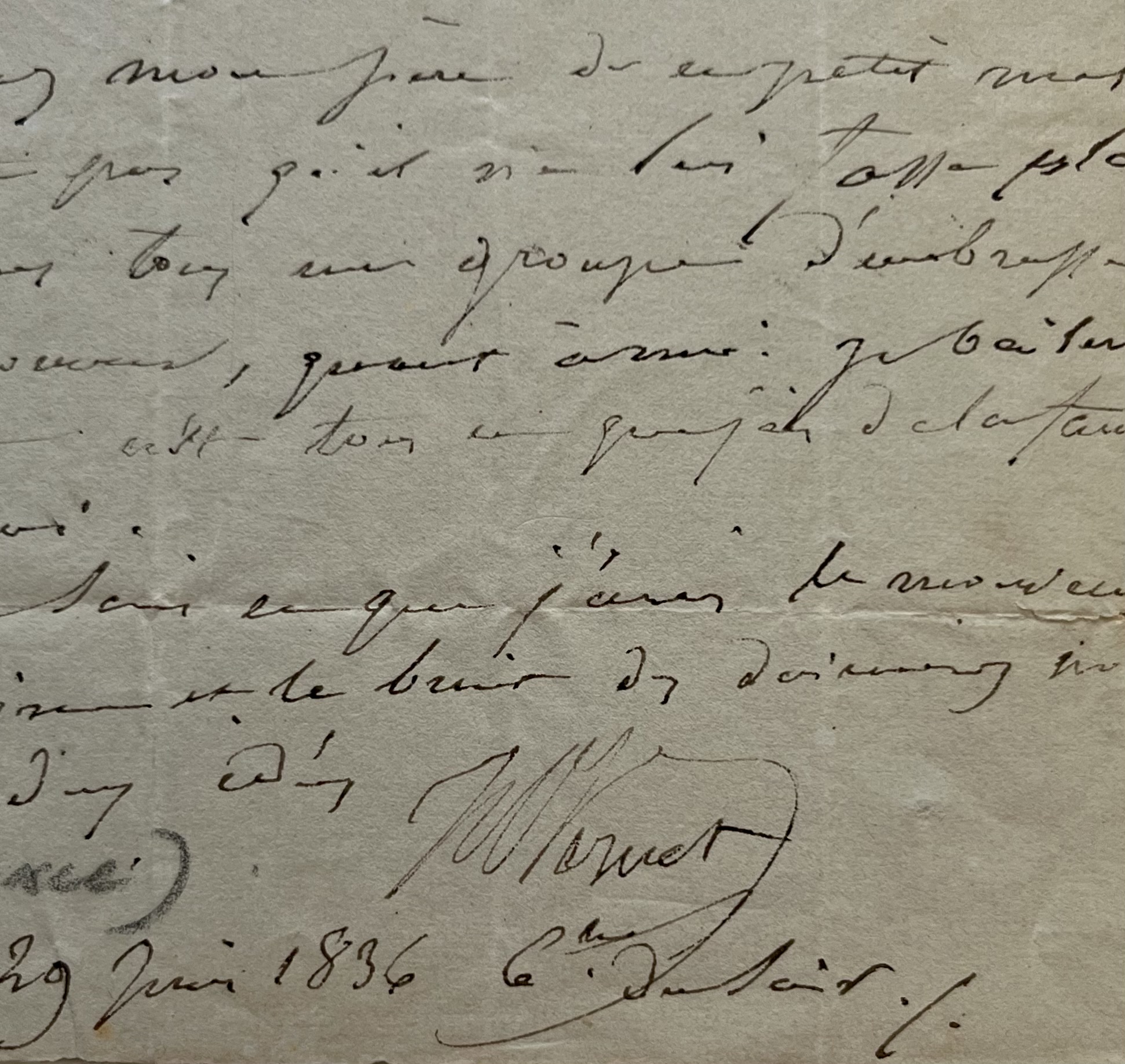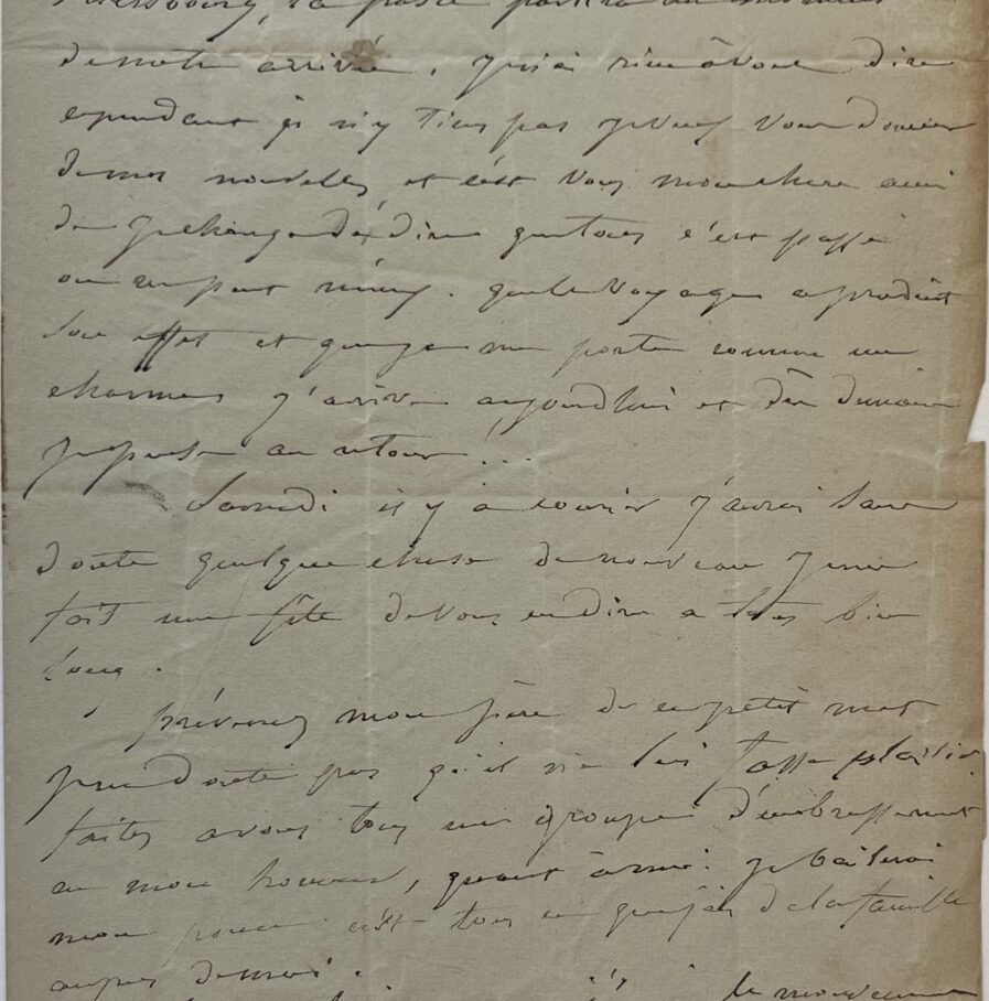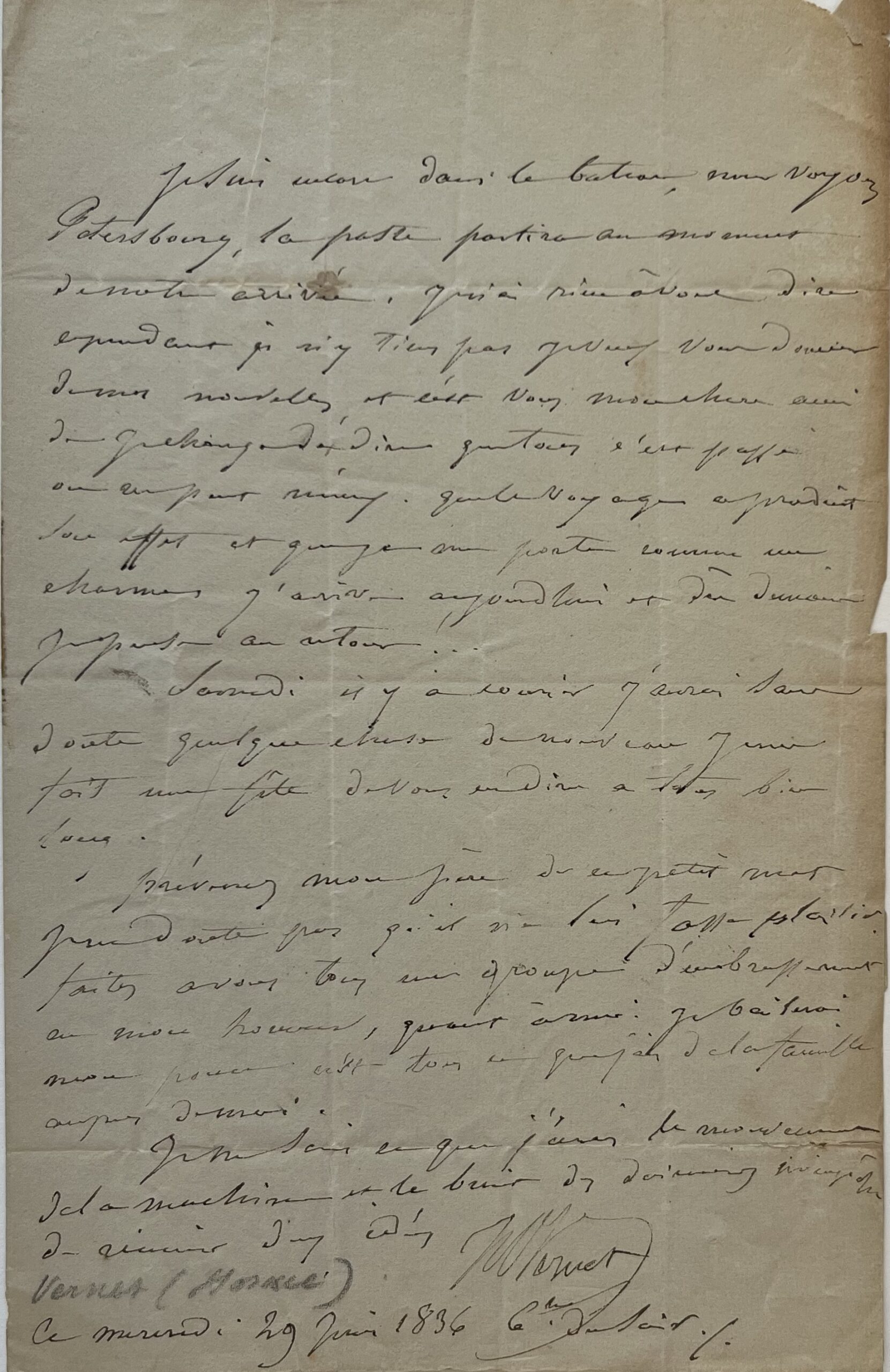 "Je suis encore dans le bateau, nous voyons Petersbourg, la poste partira au moment de notre arrivée [...]. Je veux vous donner de mes nouvelles, et c'est à vous, mon cher ami, dont je charge d'en dire que tout s'est passé on ne peut mieux, que le voyage a produit son effet, et que je me porte comme un charme. J'arrive aujourd'hui et dès demain je pense au retour. Samedi il y a courrier, j'aurai sans doute quelque chose de nouveau. Je me fais une fête de vous en dire à tous bien long. Prévenez mon père [Carle Vernet] de ce petit mot. Je ne doute pas qu'il ne lui fasse plaisir. Faites à vous tous un groupe d'embrassements en mon honneur [...]. Je ne sais ce que j'écris, le mouvement de la machine et le bruit des (?) m'empêchent de réunir mes idées".