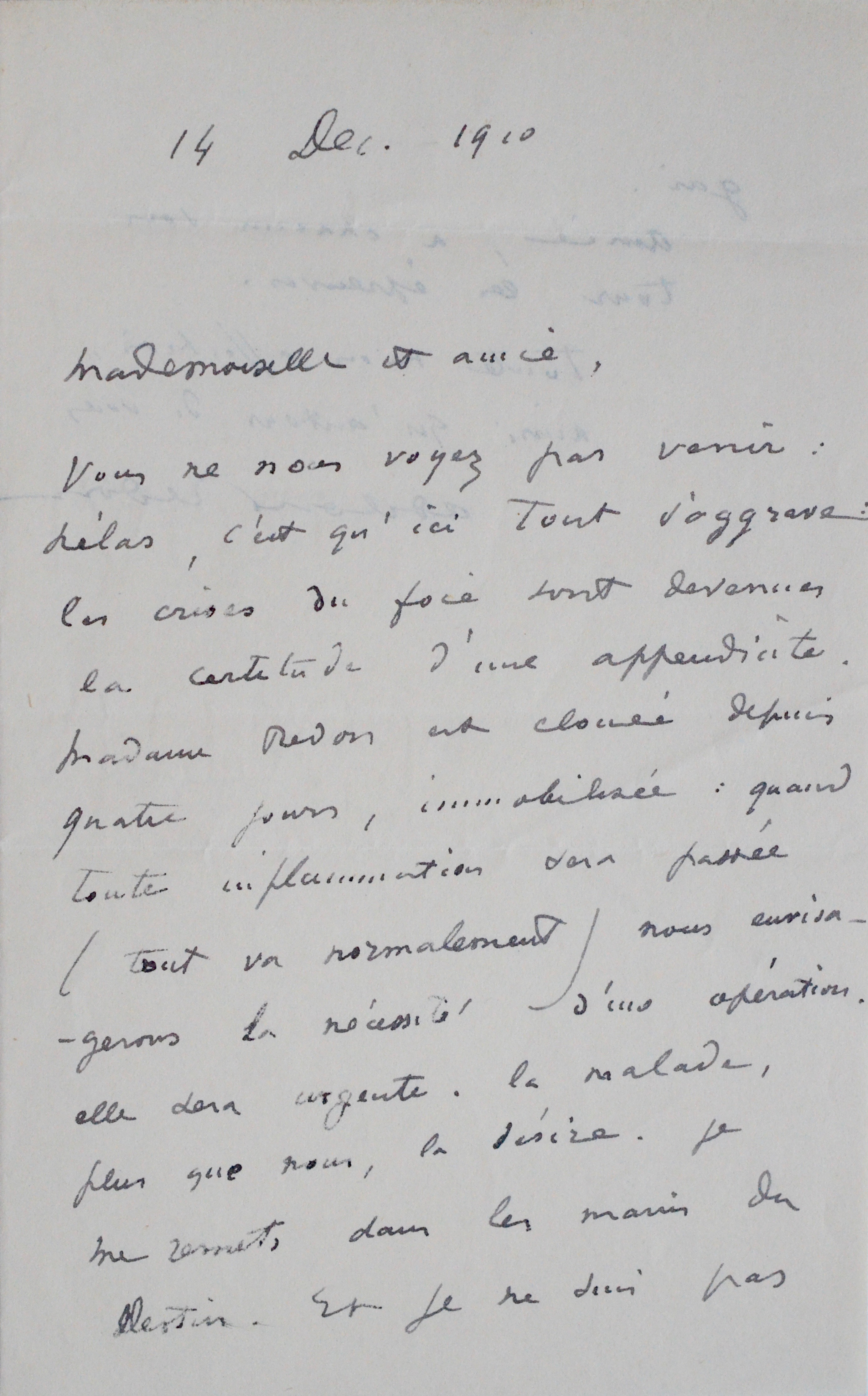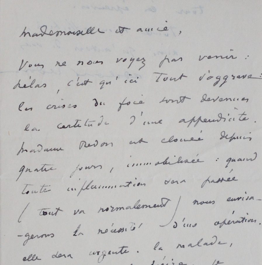 "Vous ne nous voyez pas venir : hélas, c'est qu'ici tout s'aggrave : les crises du foie sont devenues la certitude d'une appendicite. Madame Redon est clouée depuis quatre jours, immobilisée : quand toute inflammation sera passée (tout va normalement) nous envisageons la nécessité d'une opération. Elle sera urgente. La malade, plus que nous, la désire. Je me remets dans les mains du destin. Et je ne suis pas gai. Amie, à chacun son tour les épreuves [...]".