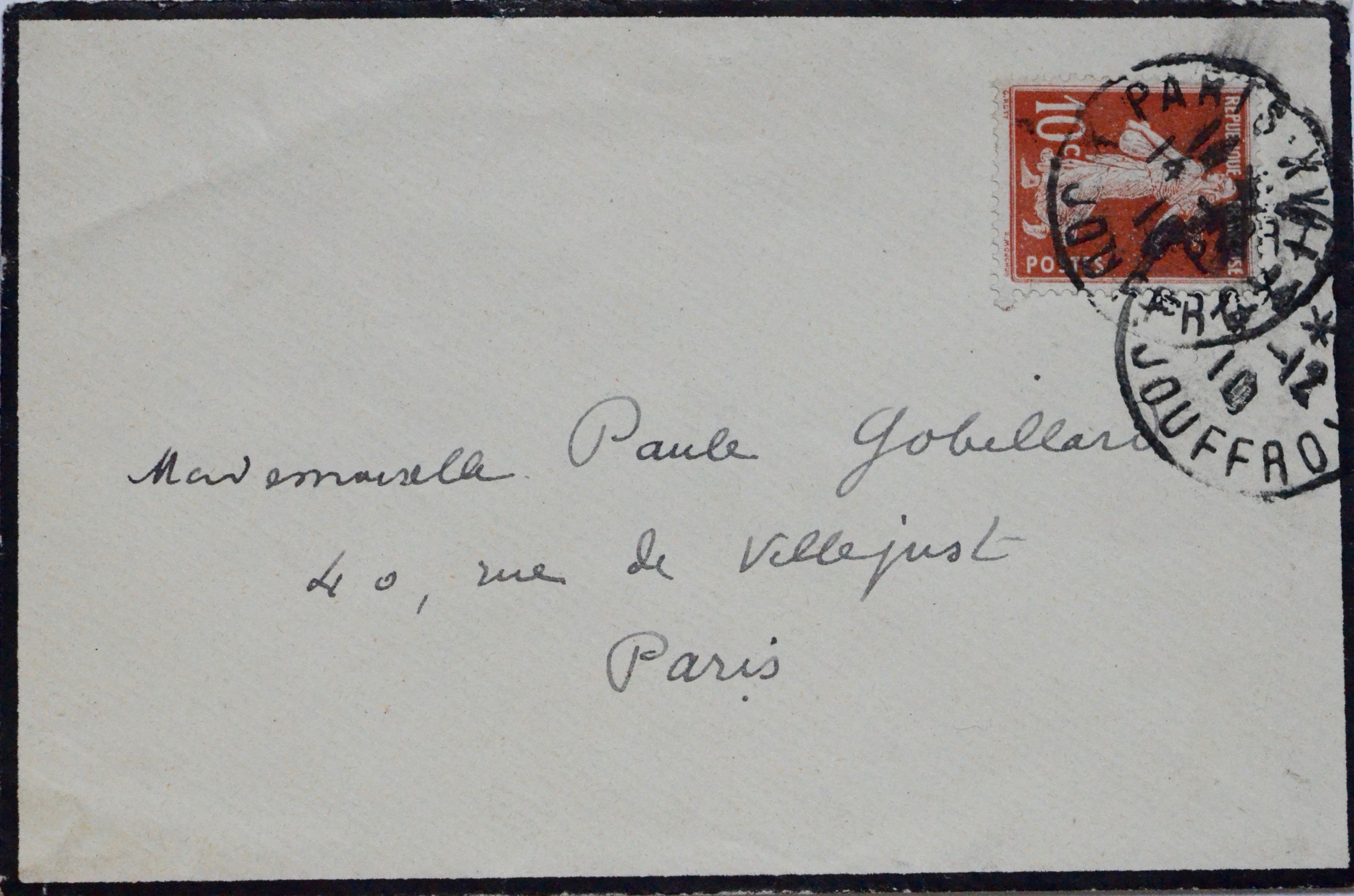 Encre noire. Enveloppe de deuil avec adresse autographe. Timbre et marques postales.
