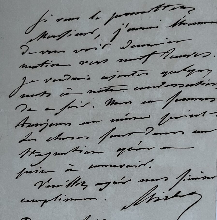 "Si vous le permettez, Monsieur, j'aurai l'honneur de vous voir demain matin vers neuf heures. Je voudrais ajouter quelques mots à notre conversation de ce soir. Nous en sommes toujours au même point. Les choses sont dans une stagnation qu'on a peine à concevoir".