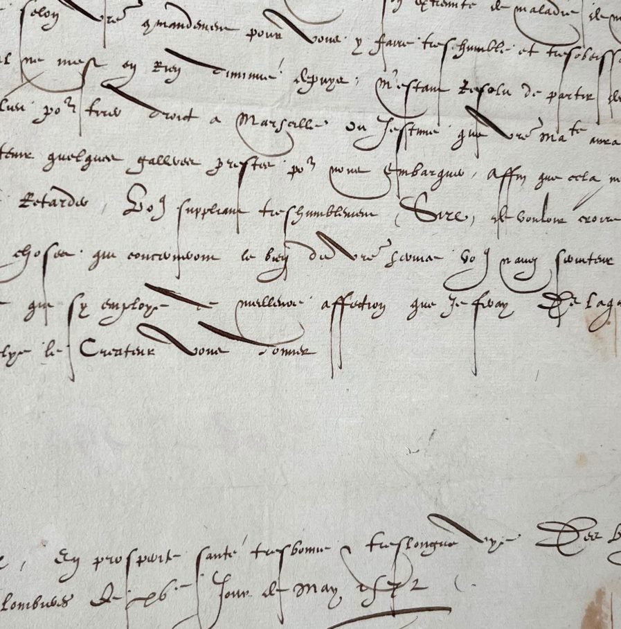 "Sire, Je vous renvoye très humblement de ce quil a pleu a votre Majesté m'advertir du deces de notre saint Père le Pape ayant cy devant délibéré, ce cas advenait, suyvant a ce que je vous en escrivy à la première nouvelle de son extrémité de maladie. Il m'a chemyné à Rome selon votre commandement pour vous y faire tres humble et tres obéissant service ce quil ne ma en rien diminué depuys ; mettant résolu de partir dès demain de ce lieu pour tirer droit à Marseille ou j'estime que votre majesté aura mandé de sa [?] quelques gallères prestes pour nous embarquer, affin que cela ne nous puisse retarder [...]".
