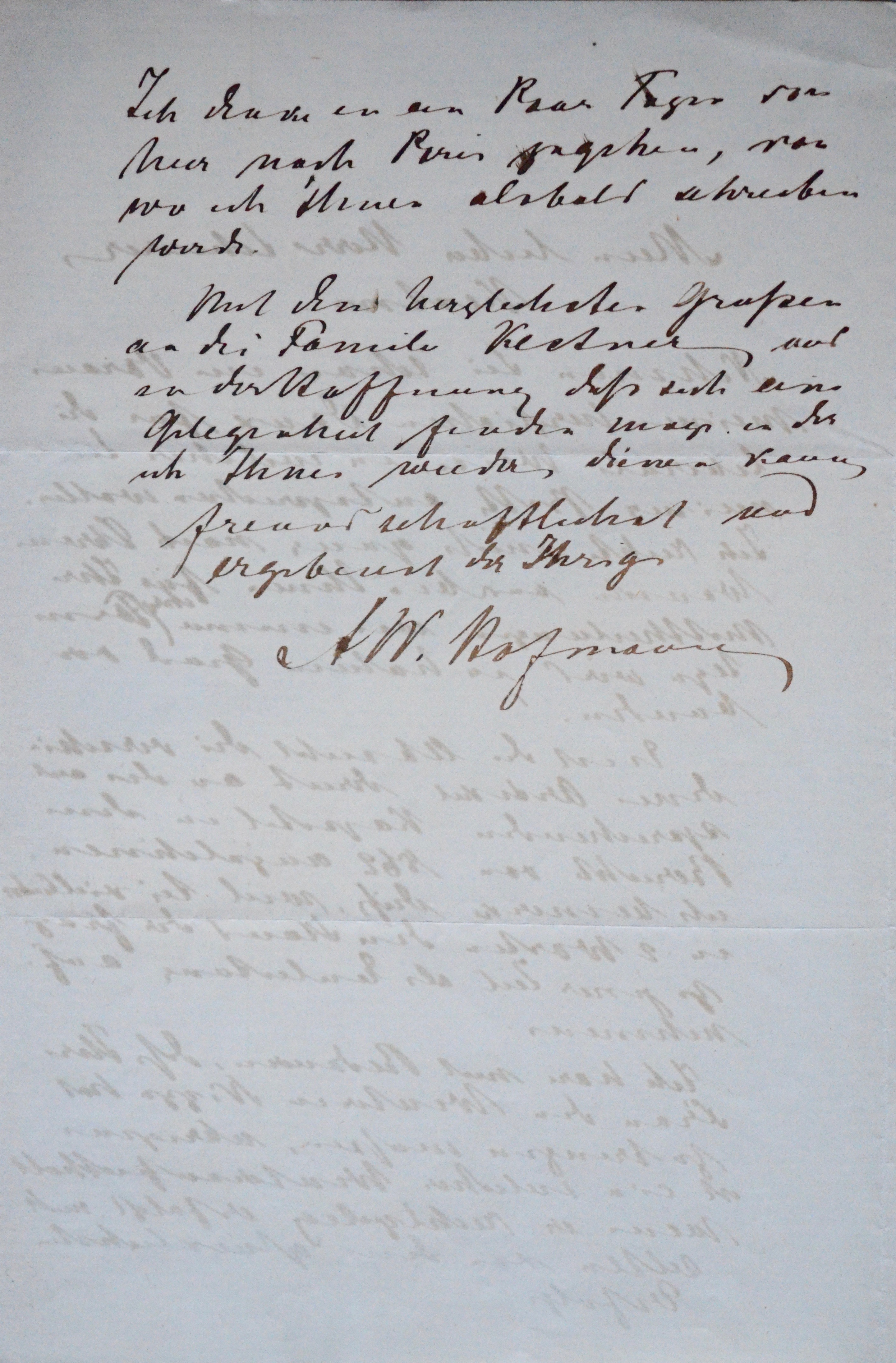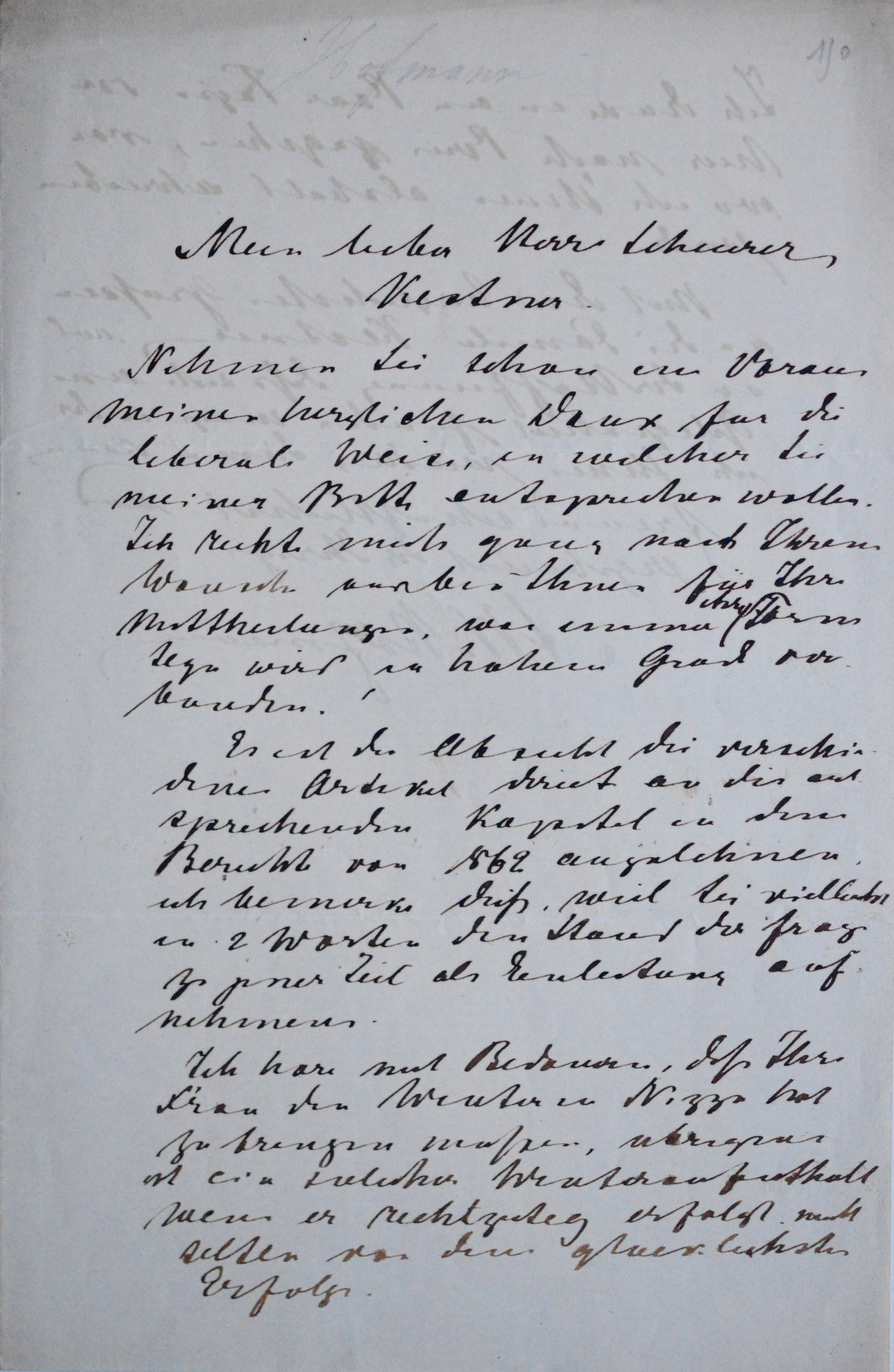 Transcription : "Nehmen Sie schon im Voraus meinen herzlichen Dank für die liberale Weise, in welcher Sie meiner Bitte entsprechen wollen. Ich richte mich ganz nach Ihrem Wunsch und bin Ihnen für Ihre Mittheilungen, was immer ihre Form seyn wird, in hohem Grade verbunden! Es ist die Absicht die verschiedenen Artikel direct an die entsprechenden Kapitel in dem Bericht von 1862 anzulehnen. Ich bemerke dies, weil Sie vielleicht in 2 Worten den Stand der Frage zu jener Zeit als Einleitung aufnehmen. Ich höre mit Bedauern, daß Ihre Frau den Winter in Nizza hat zubringen müssen, übrigens ist ein solchen Winteraufenthalt wenn er rechtzeitig erfolgt, nicht selten von dem glücklichsten Erfolge. Ich denke in ein paar Tagen von hier nach Paris zu gehen, von wo ich Ihnen alsbald schreiben werde. Mit den herzlichsten Grüßen an die Familie Kestner, und in der Hoffnung daß sich eine Gelegenheit finden möge, in der ich Ihnen wieder dienen kann, freundschaftlichst und ergebenst der Ihrige [...]".