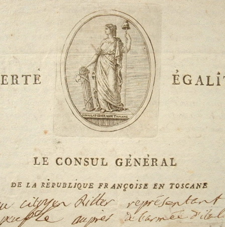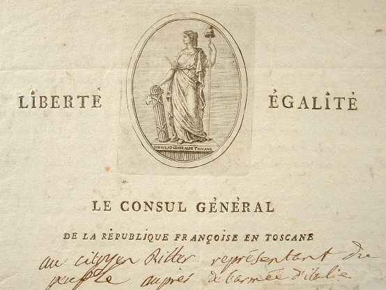 Louis Antoine Bertellet (de) (Nîmes, 1728/0)En zélé serviteur de la République, le consul général de la République française en Toscane, Louis Antoine de Bertellet, dresse un bilan de son activité au représentant du peuple en mission Ritter. Il fait part des rapports qu'il a adressés relativement aux mouvements des forces navales anglaises dans la Méditerranée, mais aussi «des échelles de Barbarie et celles du levant». «Dans ces derniers tems de crise, j'ay suivi ce même sistème, et fait part aux citoyens Cacault et successivement Miot à Florence et ailleurs de tout ce que j'ay cru utile pour affermir les Républicains, n'oubliant pas d'en informer immédiatement le Comité de Salut Public [...]», en particulier «relativement aux mouvements de contre-révolution qui se manifestoient dans les départemens du Midy, par le moyen des cabales des émigrés qui continuent à être icy en grand nombre. J'insinuois que le moyen de rompre leurs mesures étoit de les éloigner de Livourne, et de ne les tolérer tout au plus que dans l'intérieur de la Toscane, dont la neutralité doit être pour les puissances, et non pour les individus rebelles. On a vu l'utilité de cette mesure par les mouvements de contre-révolution en France à diverses époques, notamment lorsque ces mêmes émigrés donnèrent lieu icy à la scène scandaleuse entre eux et les officiers prisonniers de guerre des vaisseaux [...]».