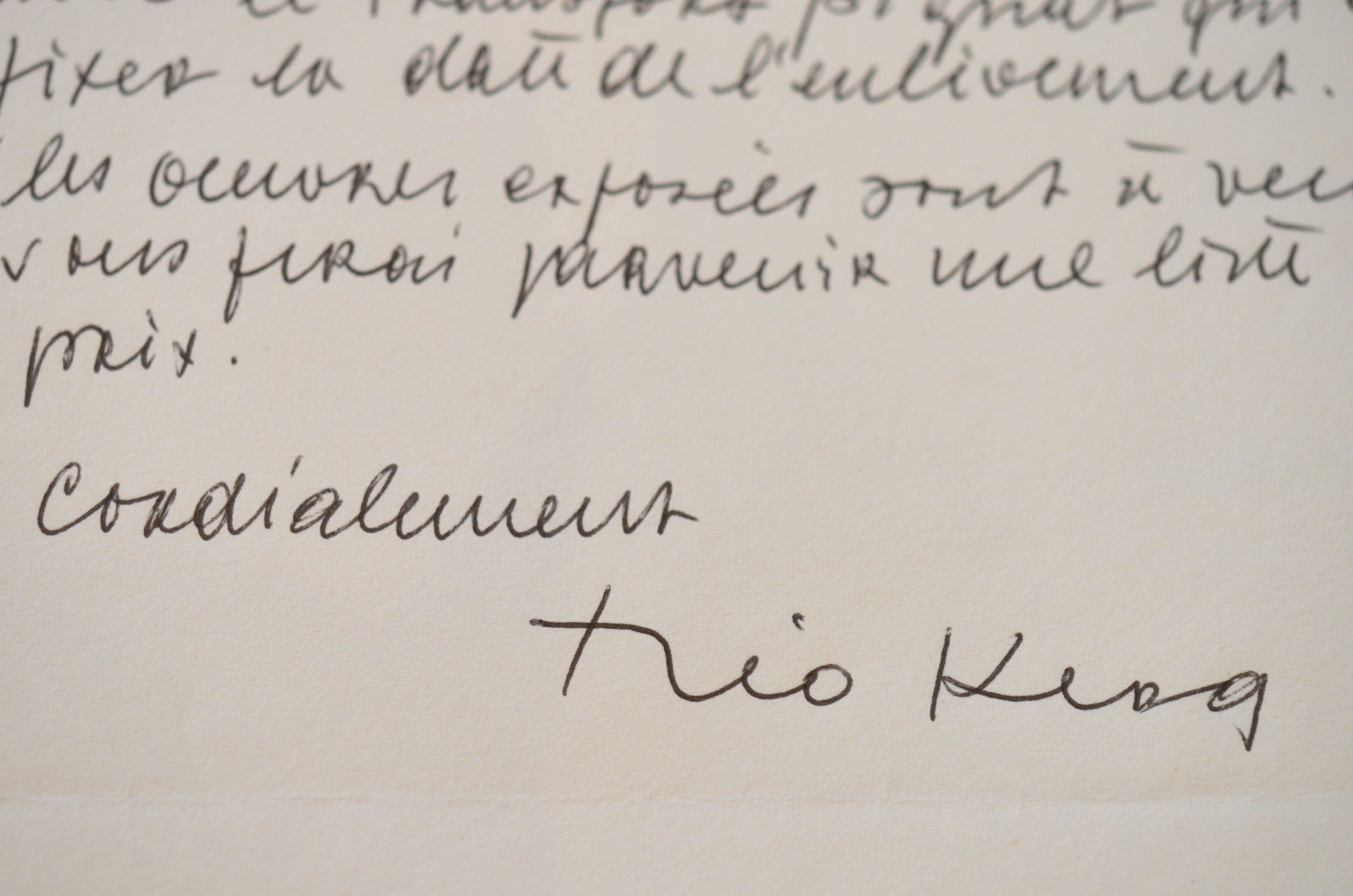 Théo Kerg remercie Lesquibe pour son invitation aux Entretiens de Bayonne. "Sur quel thème roulent cette année les entretiens? Je pourrais peut-être y participer. J'accepte votre invitation et vous ferai parvenir une toile et quatre gravures [...]. Les oeuvres exposées sont à vendre. Je vous ferai parvenir une liste avec les prix".