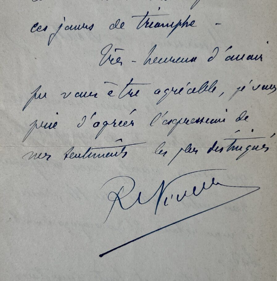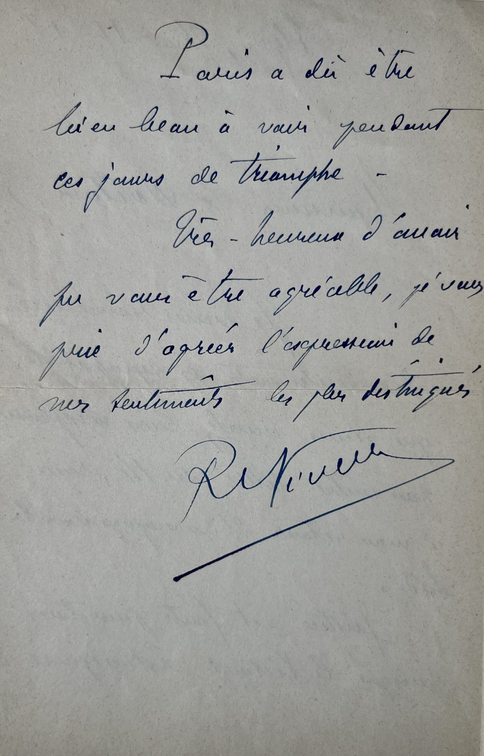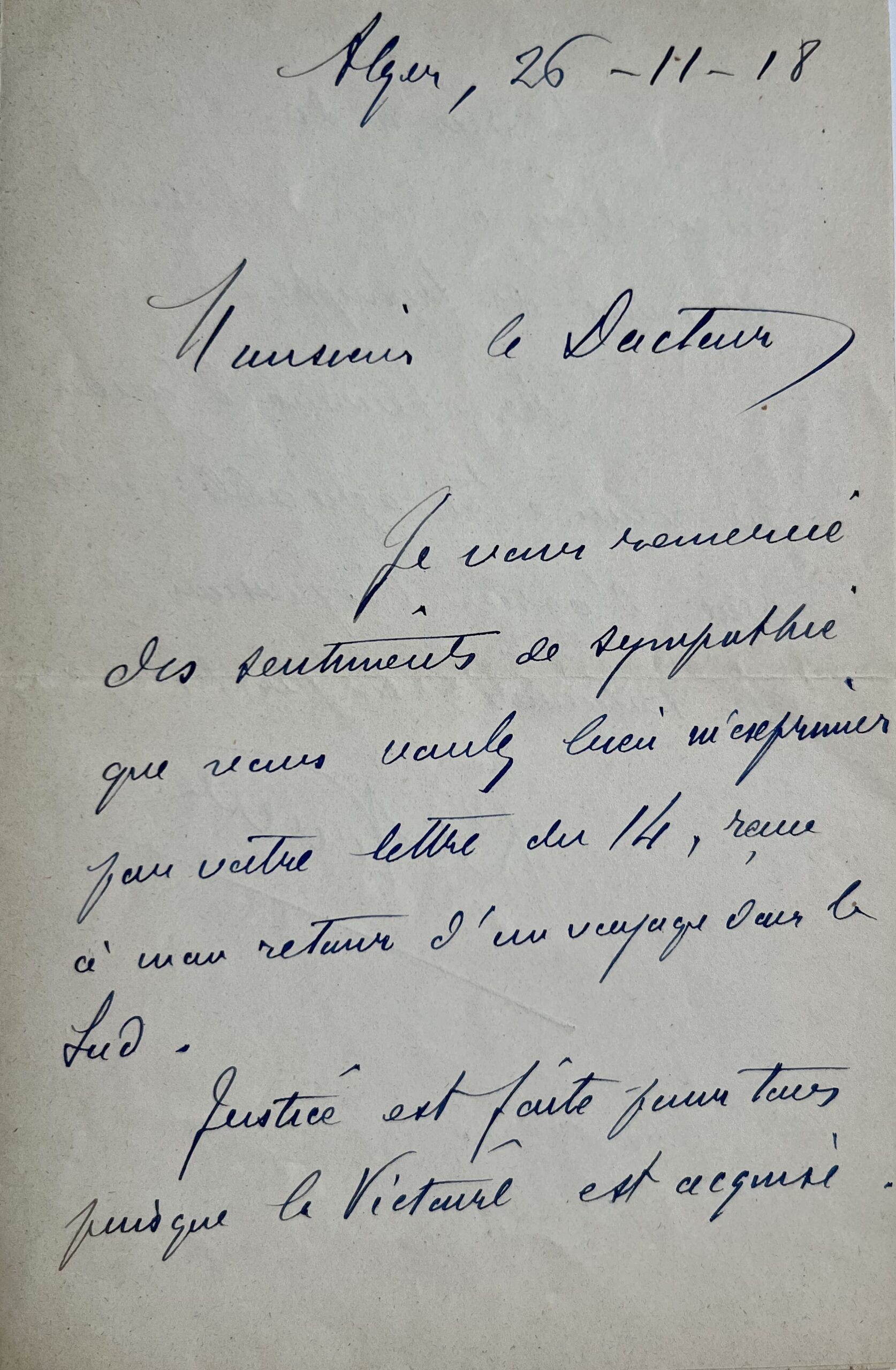 "Monsieur le Docteur. Je vous remercie des sentiments de sympathie que vous voulez bien m'exprimer par votre lettre du 14, reçu à mon retour d'un voyage dans le sud. Justice est faite pour tous puisque la Victoire est acquise. Paris a dû être bien beau à voir pendant ces jours de triomphe. Très heureux d'avoir pu vous être agréable [...]".