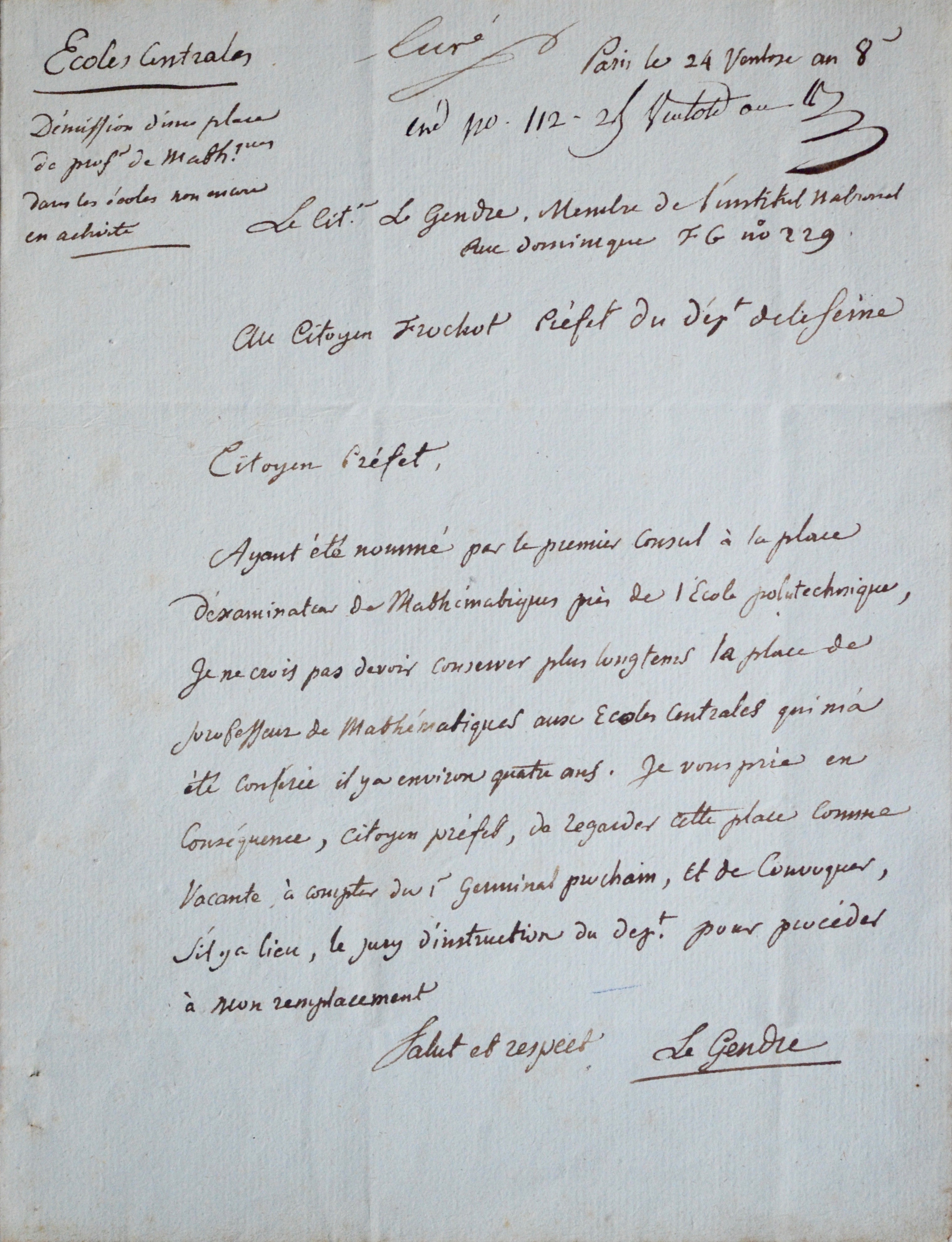 "[...] ayant été nommé par le premier consul à la place d'examinateur de mathématiques près de l'École polytechnique, je ne crois pas devoir conserver plus longtemps la place de professeur de mathématiques aux écoles centrales qui m'a été confiée il y a environ quatre ans. Je vous prie en conséquence, Citoyen préfet, de regarder cette place comme vacante, à compter du 1er germinal prochain [...]".